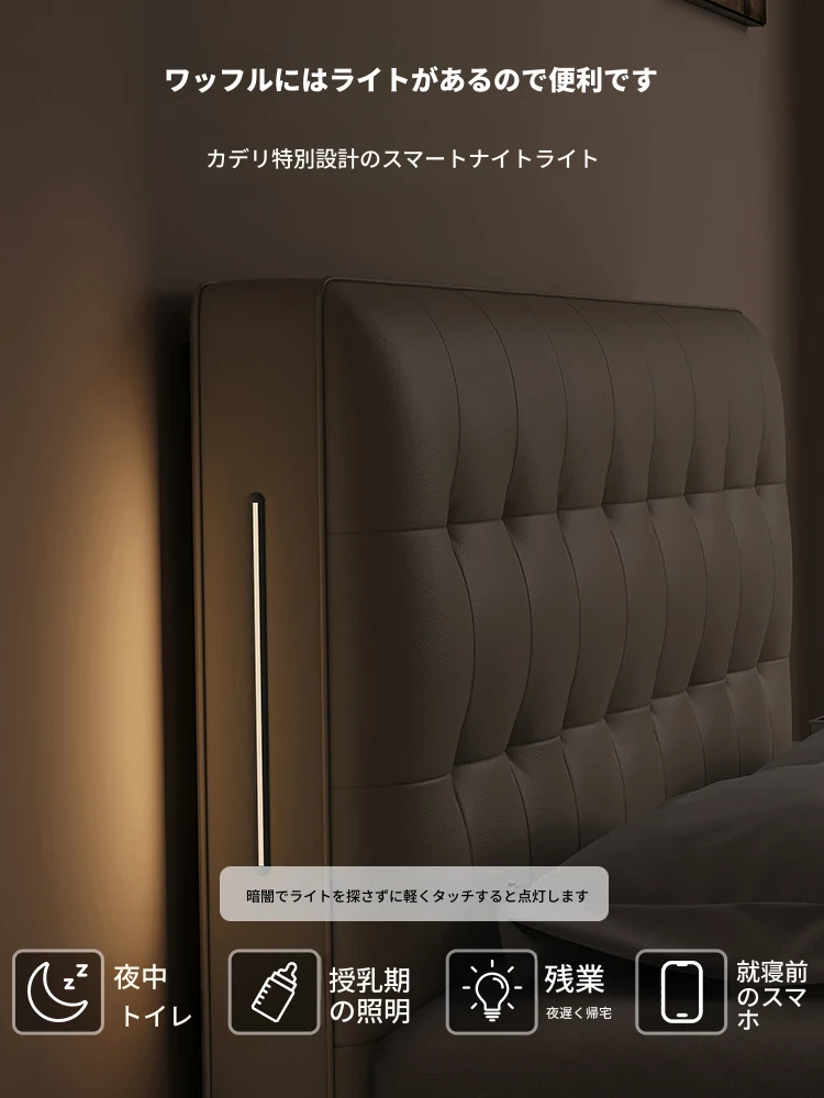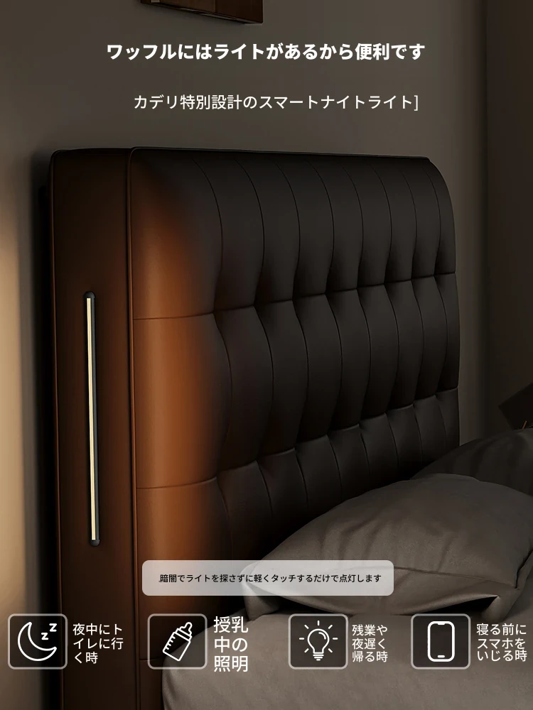 カデリ モダンミニマリスト 調節可能なレザー製ナイトライト付きダブル収納ベッド 小型住宅向け 高級感溢れるデザイン