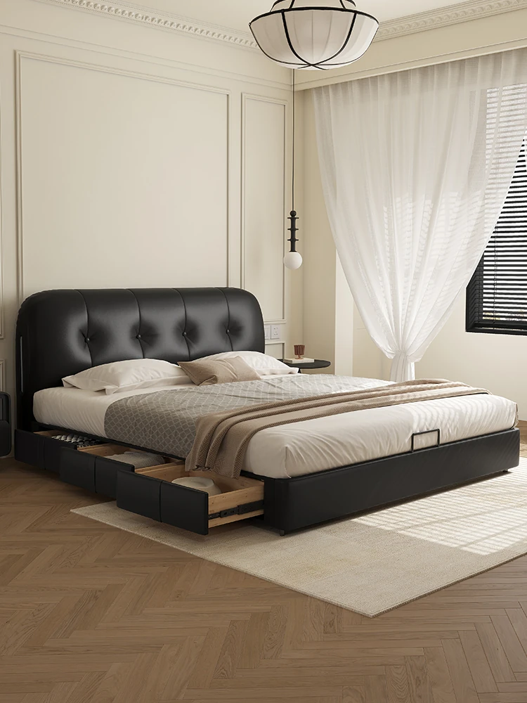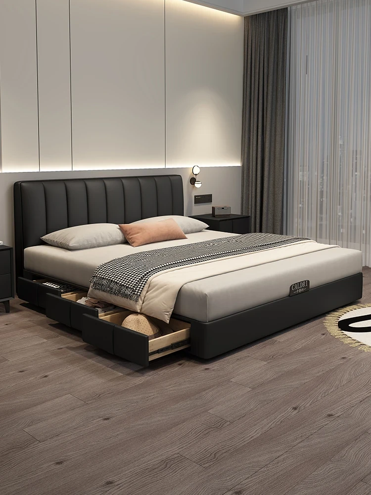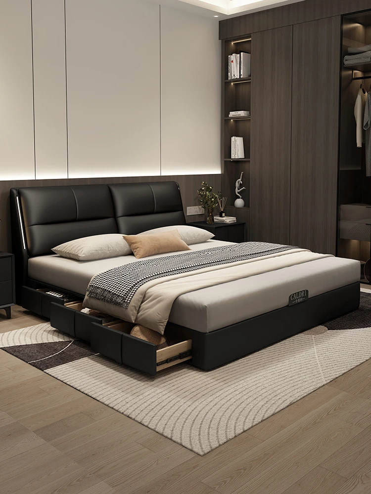 カデリ本革ベッド|高級感あふれるモダンシンプルデザイン|収納付きブラックライトラグジュアリーイタリアンミニマリストダブル婚礼ベッド