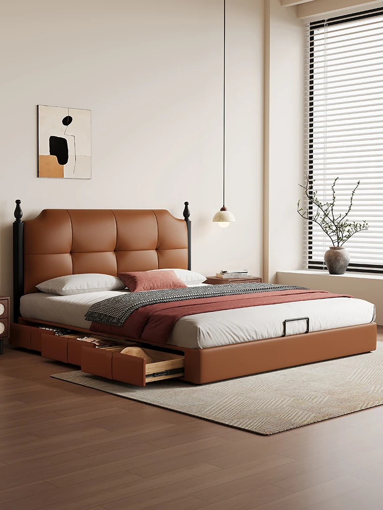 カデリ モダンシンプル ダブルソフトパッケージ 本革ベッド 高級感あふれる収納付き主寝室用 小型スペースに最適なデザイン