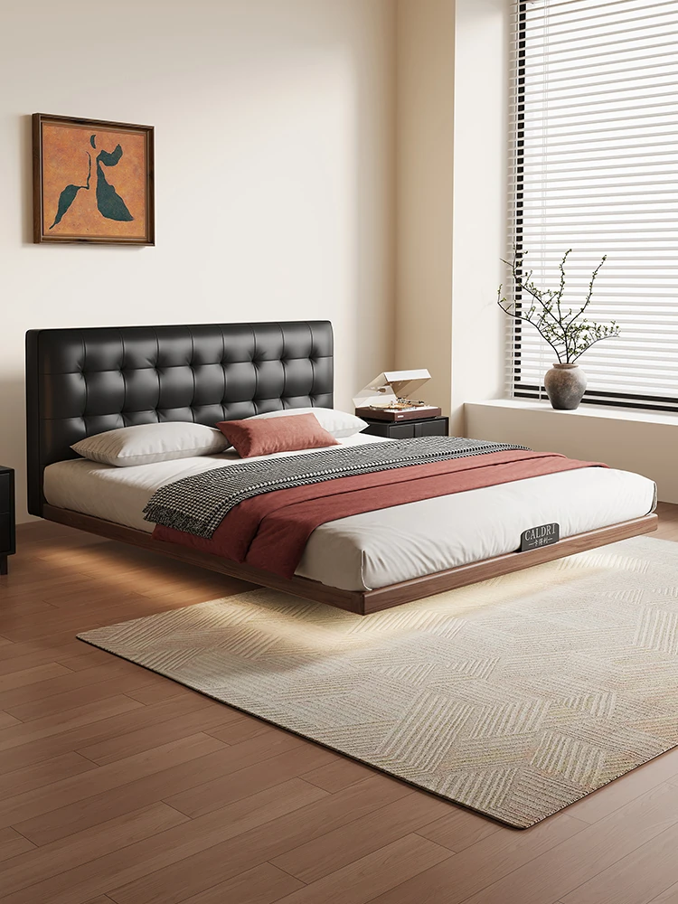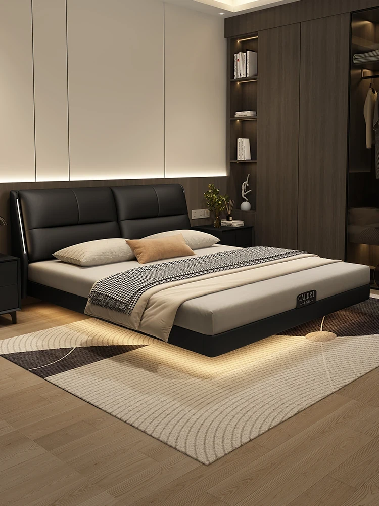 カデリ ブラック本革ベッド 高級感あふれるモダンシンプルデザイン ナイトライト付き イタリアンミニマリズム ダブル浮遊ベッド
