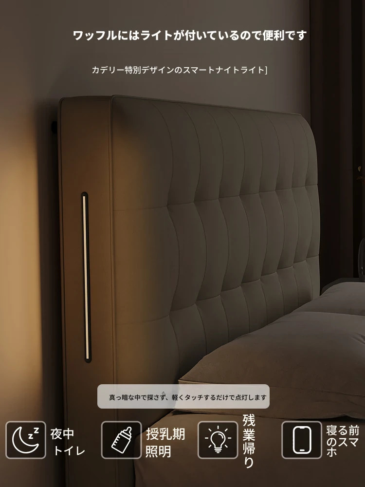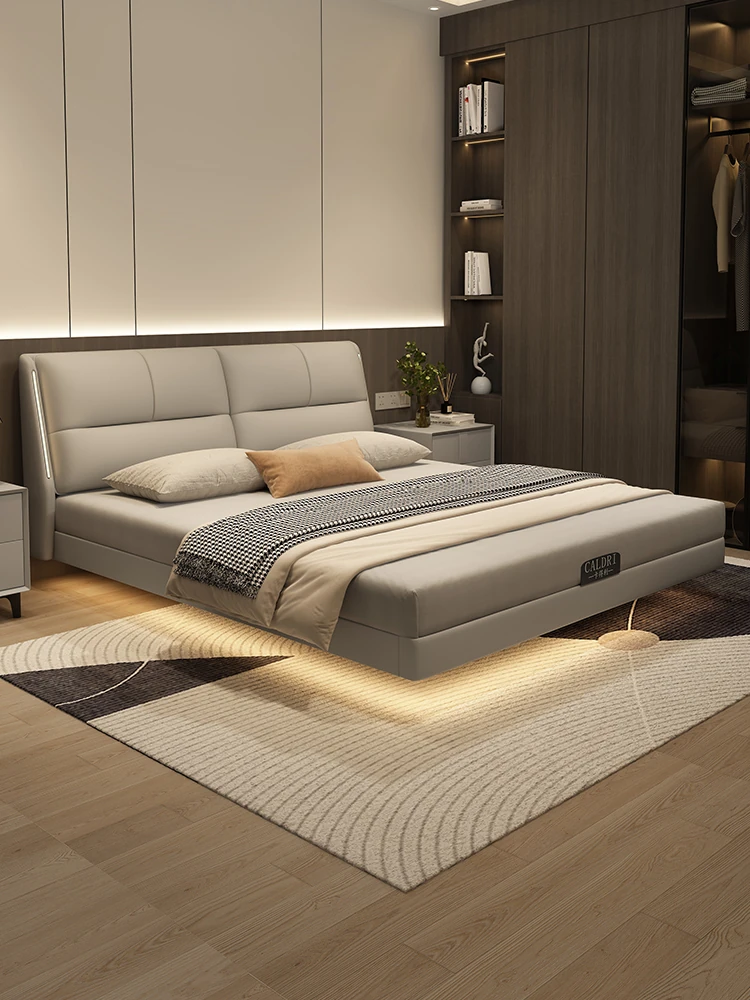 カデリ現代的シンプルなサスペンションベッド、ナイトライト付きダブルベッド、イタリアンミニマリズム2024年新作本革ベッド。快適な睡眠空間を演出し、スタイリッシュな主寝室にぴったり!
