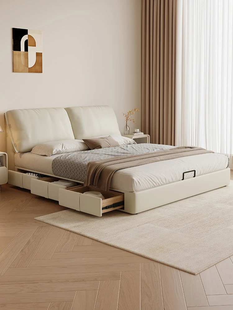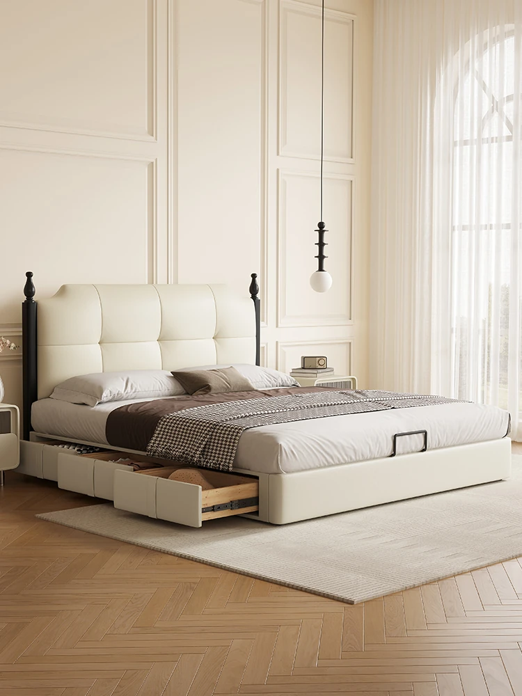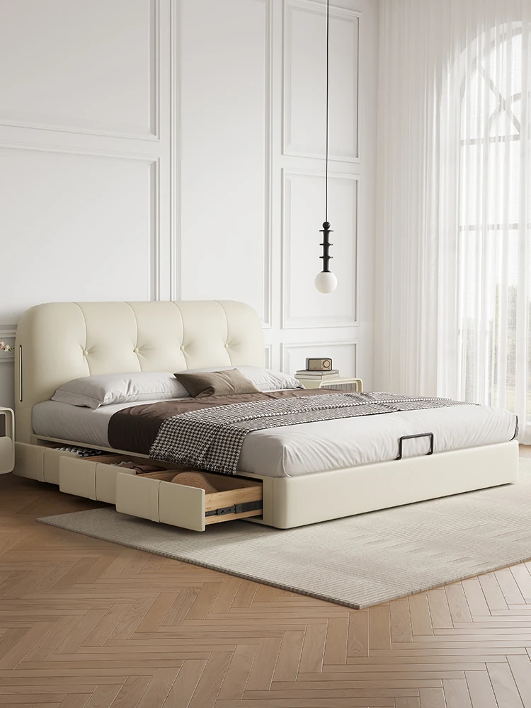 カデリ泡芙ベッド フランス風クリーム ヴィンテージスタイル収納付き 本革ダブルベッド 主寝室用 2025年新作!心地よい眠りを実現し、スタイリッシュな空間を演出する理想のアイテムです。