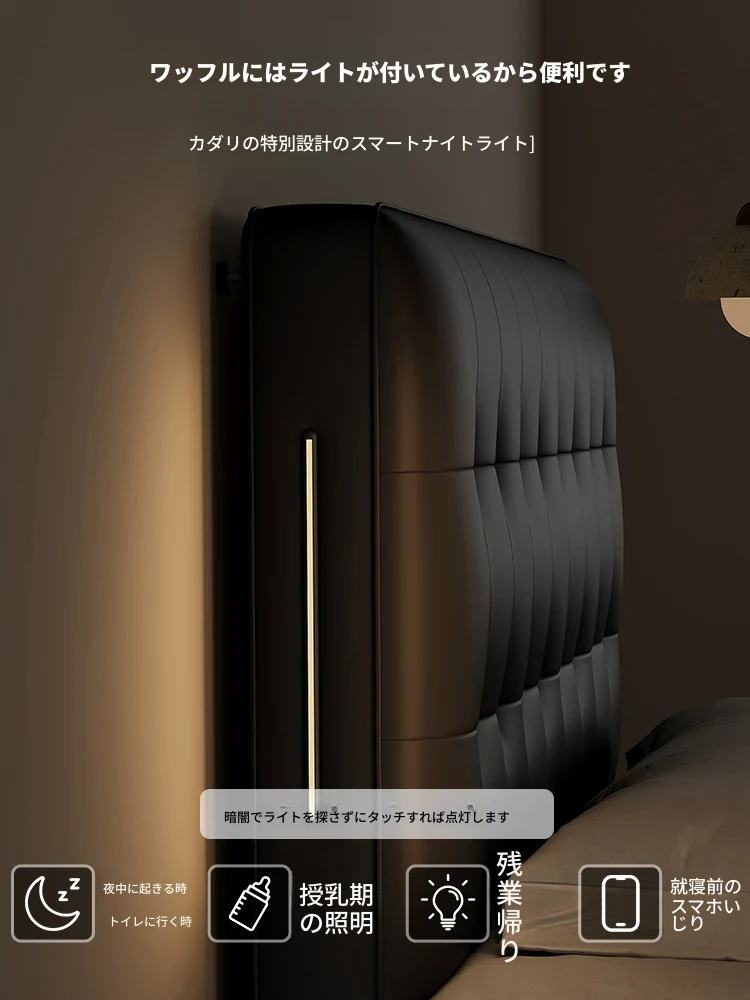 カデリ ブラックナイトライト ベッド 高級 本革 モダン シンプル ダブル 高箱収納 イタリアンミニマリズムで贅沢な睡眠空間を演出!
