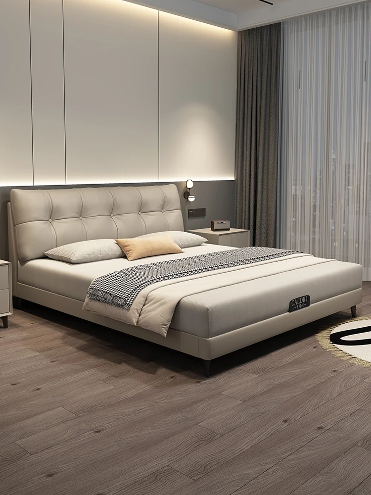 カデリ本革ソフトパッキングベッド|高級感あふれるイタリアンミニマリズムデザイン|主寝室にぴったりな収納機能付きモダンダブルベッド|結婚生活を彩るスタイリッシュな選択!