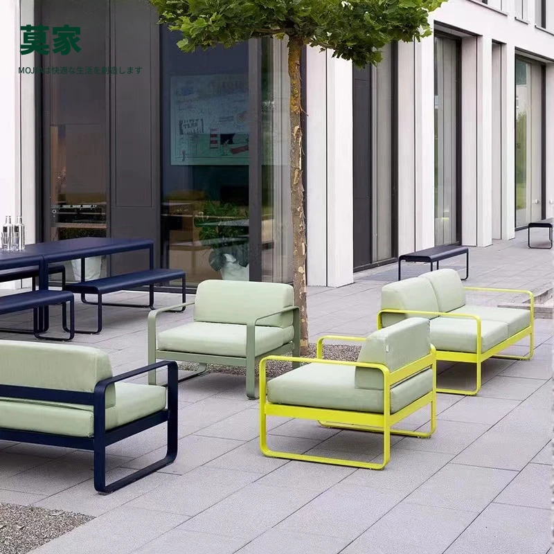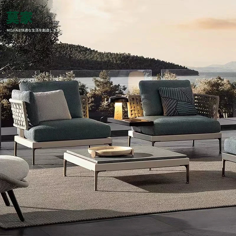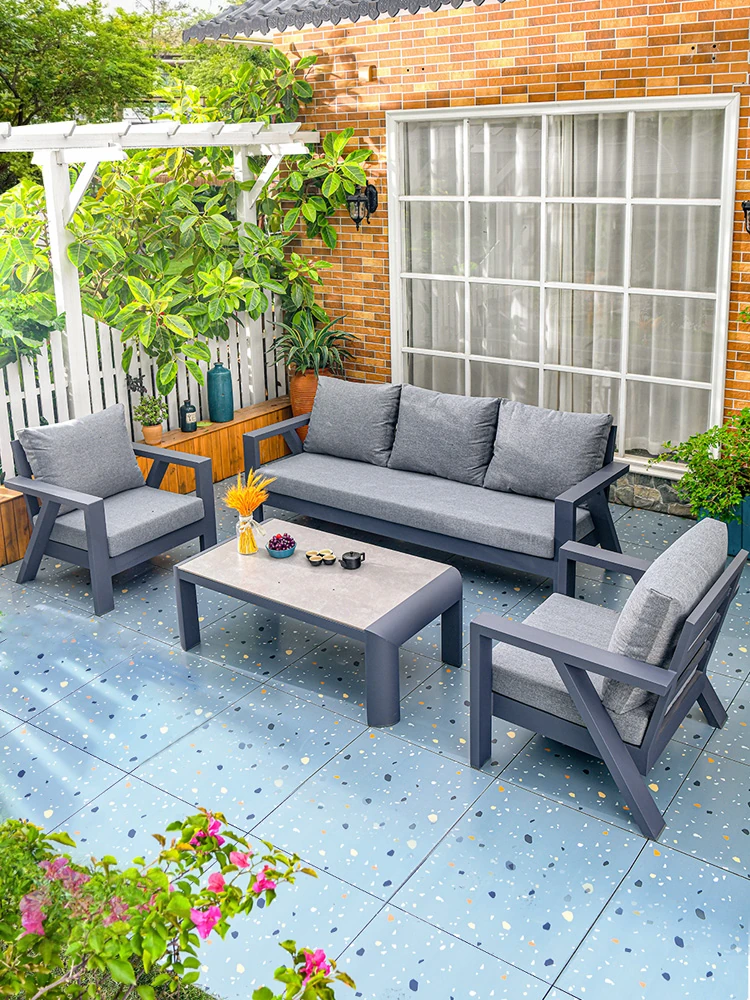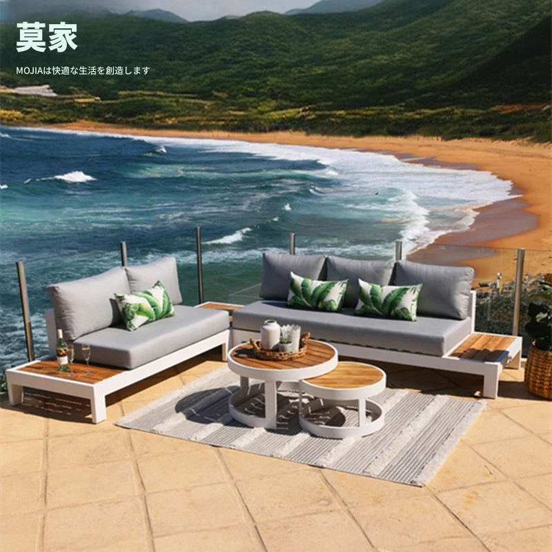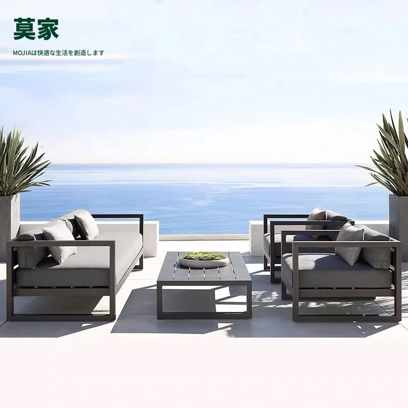 モウ家のアルミ合金製アウトドアソファーセット - スタイリッシュな庭やテラスにぴったり!雨や日差しにも強いデザインで、リラックスしたひとときを提供します。おしゃれなティーテーブルとチェアの組み合わせで、快適な空間を演出!