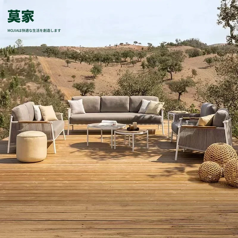 モー家の北欧スタイルのアウトドアソファセット - アルミ合金製、別荘のテラスにぴったりなチーク家具、デザイナーによる庭の完璧なデザインを実現!快適さとスタイルを兼ね備えたリラックス空間をお楽しみください。