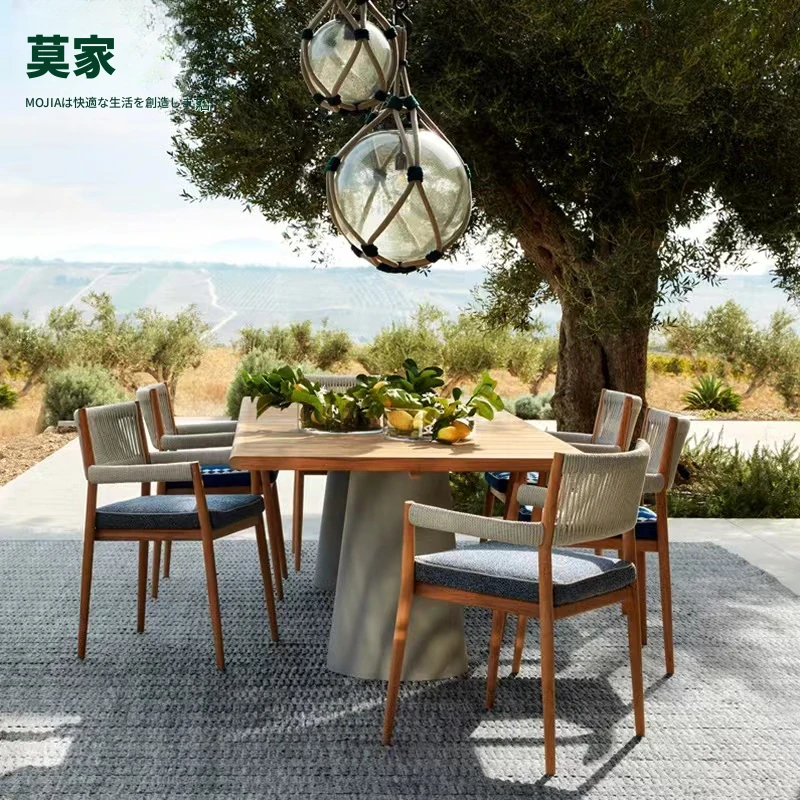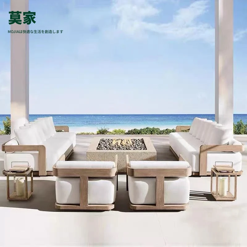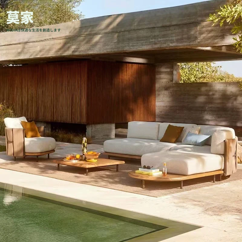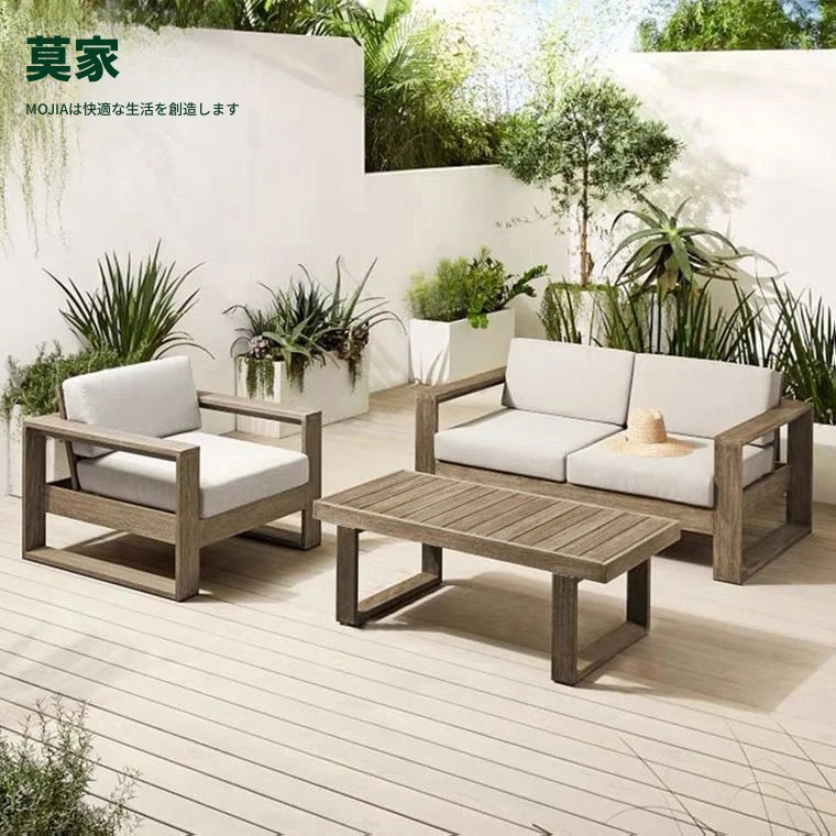 モ家の北欧スタイル・アウトドアソファセット|高級テラス・ヴィラ用|雨や日差しに強いチーク材使用|耐腐食性の家具|快適な庭でのくつろぎを実現!