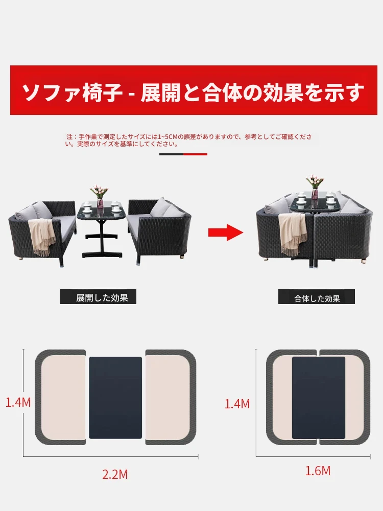 モ家のアウトドアラタンソファセット - バルコニーや庭に最適!北欧デザインのテーブルと椅子、コーヒーテーブルのコンビネーションで、民宿のモデルルームにもぴったり。スタイリッシュで快適な空間を演出します!