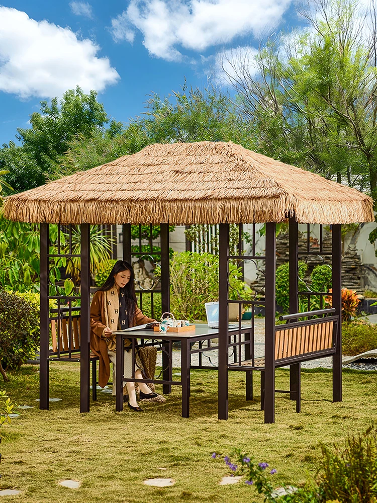 モ家アウトドアウッドハウス 円形リアルな藁葺きテント 鉄製パビリオン 庭やリゾートに最適な日よけスペース くつろぎのひとときを提供します!