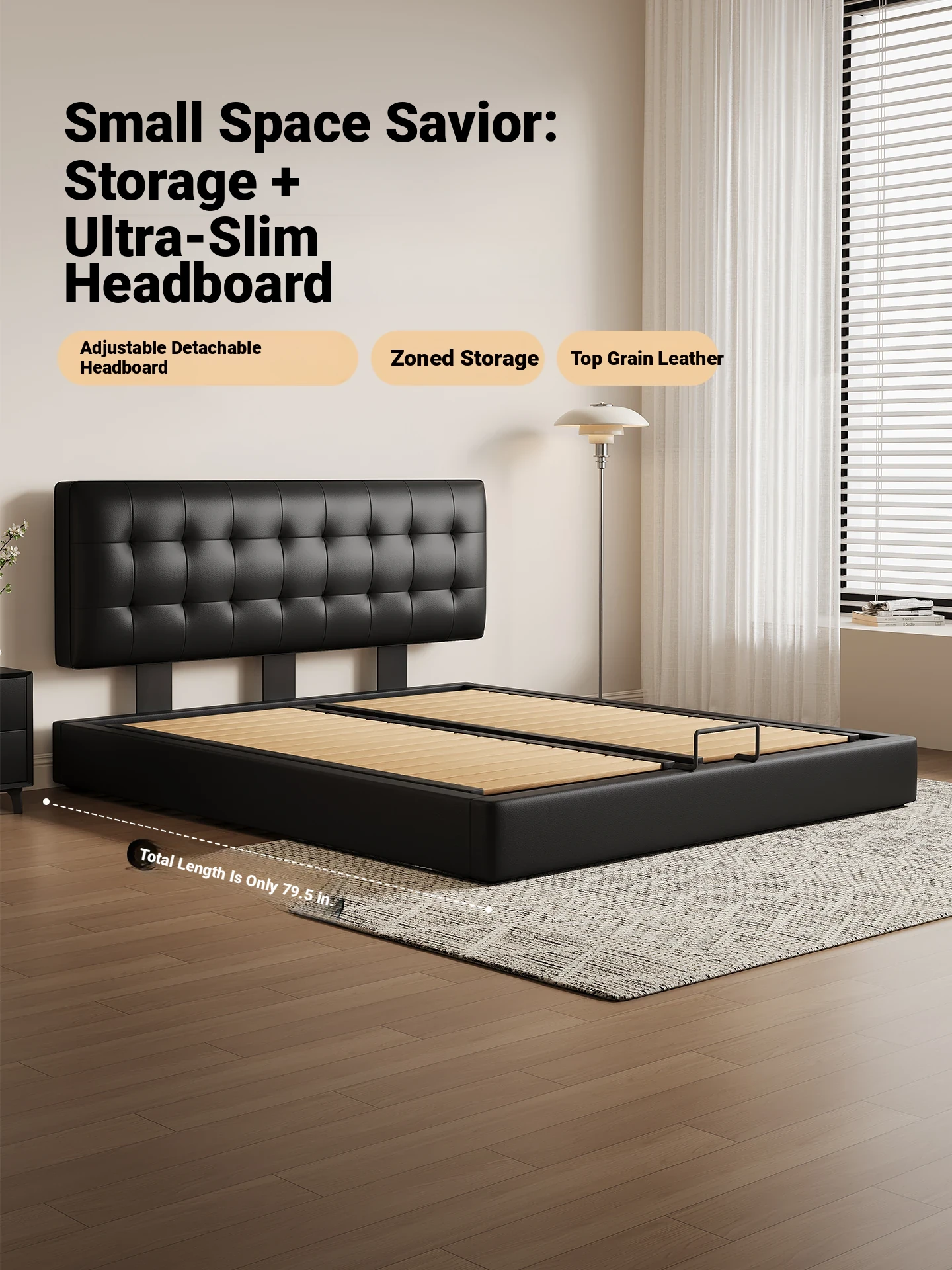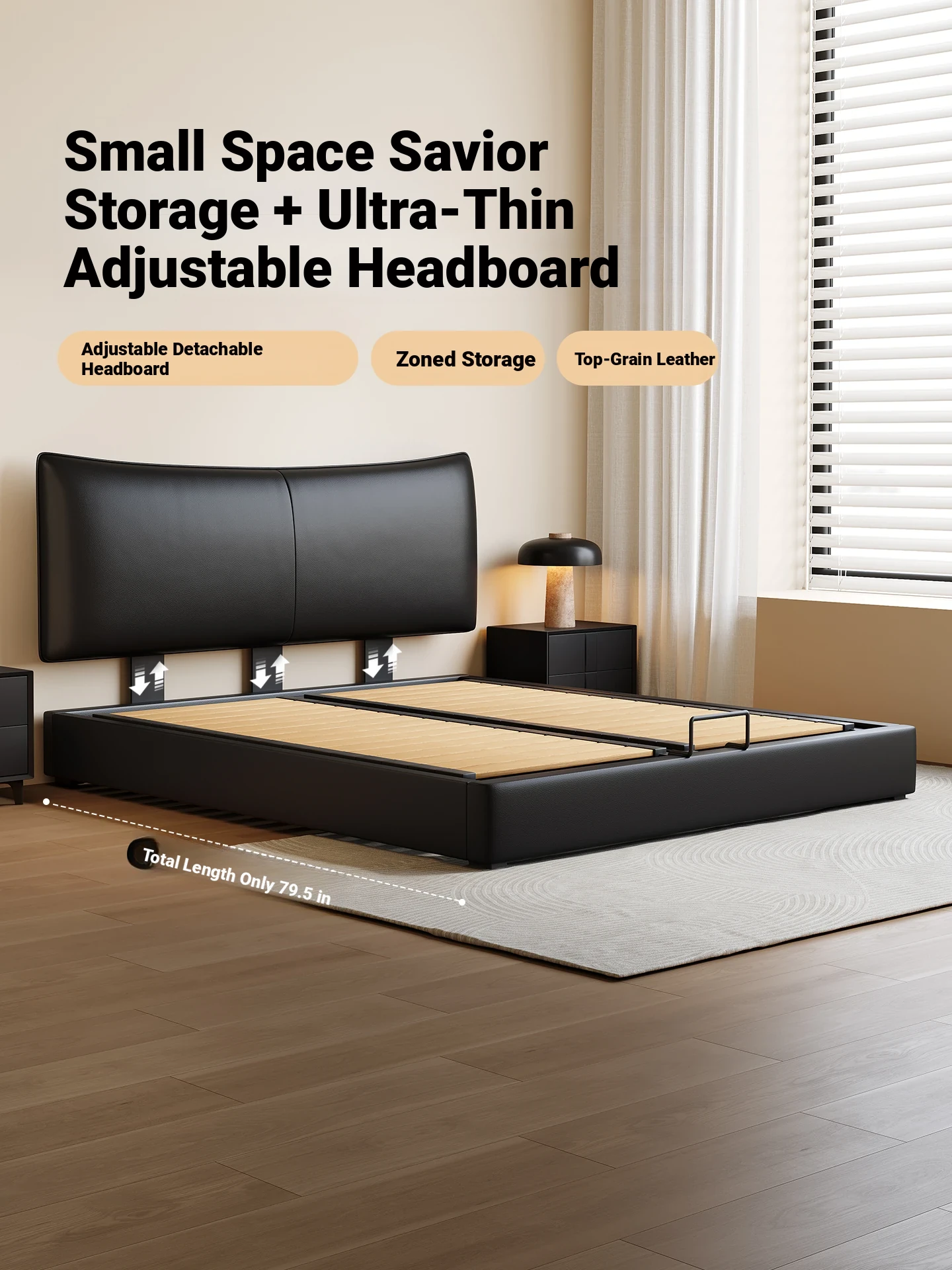 Chic Italian Style Adjustable Thin Bed with Storage - Genuine Top-Grain Leather Headboard in Black for Small Spaces - Perfect for Cozy Living!