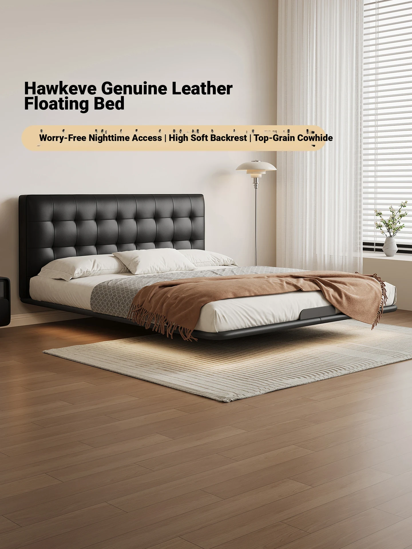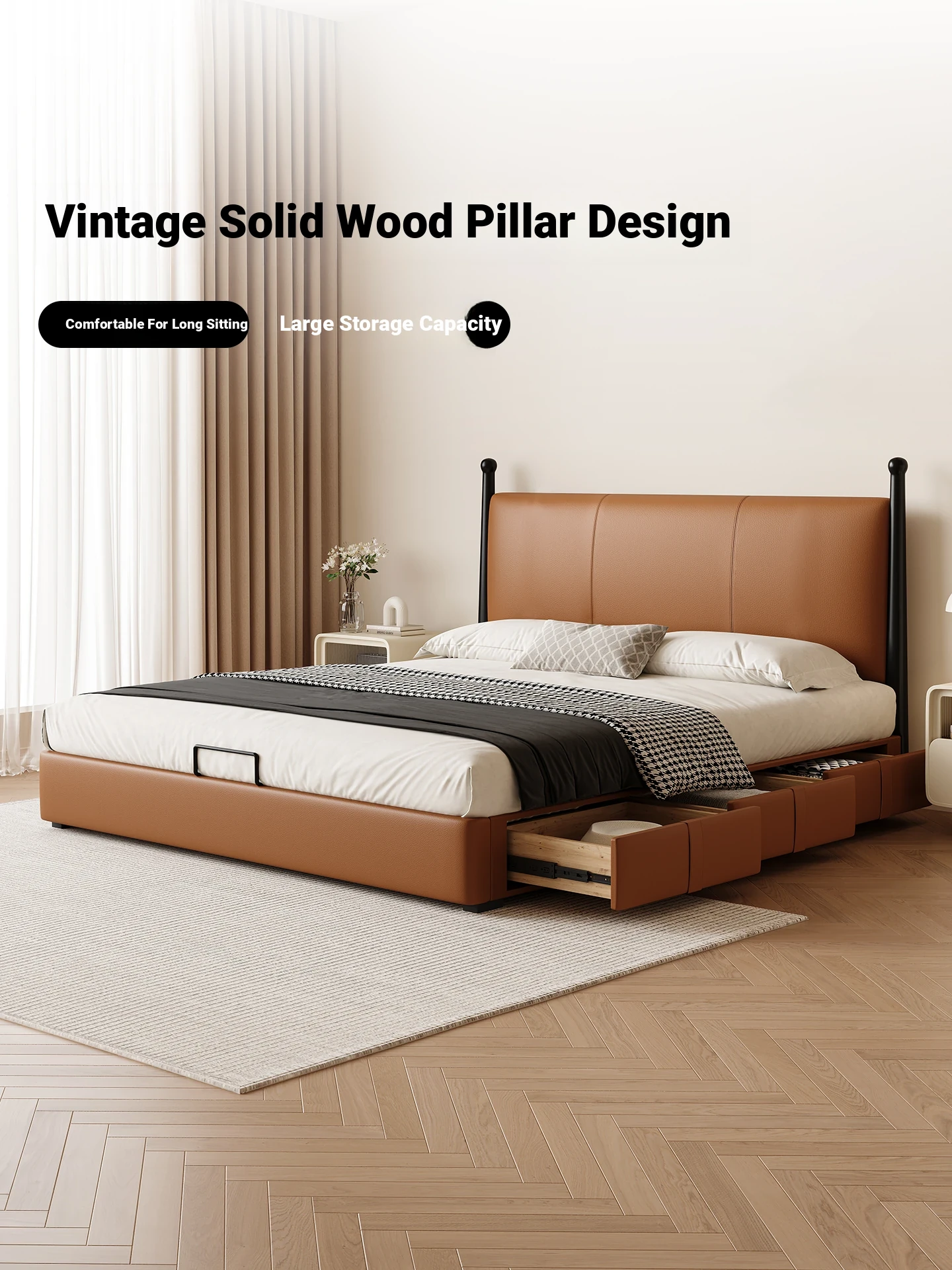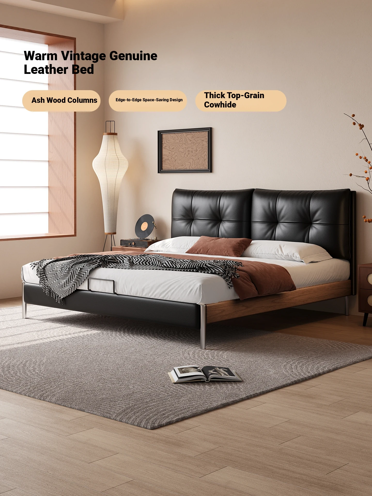 Kadeli Premium Genuine Leather Bed - Elegant Vintage Style Solid Wood Bed for Master Bedroom, Featuring High-Quality Top Layer Cowhide, Perfect for Small Spaces