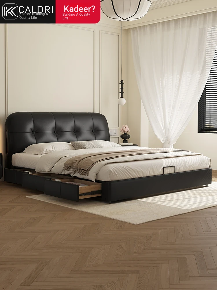 Cadeli Black Puff Bed - Modern Minimalist Genuine Leather Storage Bed for Small Master Bedrooms, Vintage Style Double Bed