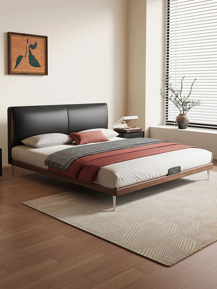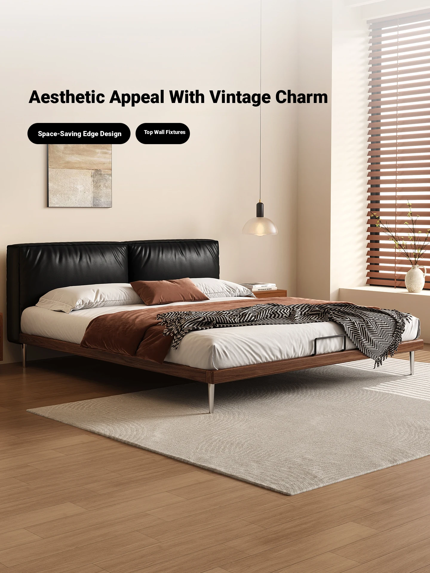 Kadeer Modern Minimalist Ultra-Thin Black Leather Bed - Double Size French Vintage Style Solid Wood Design, Perfect for a Chic Bedroom Upgrade