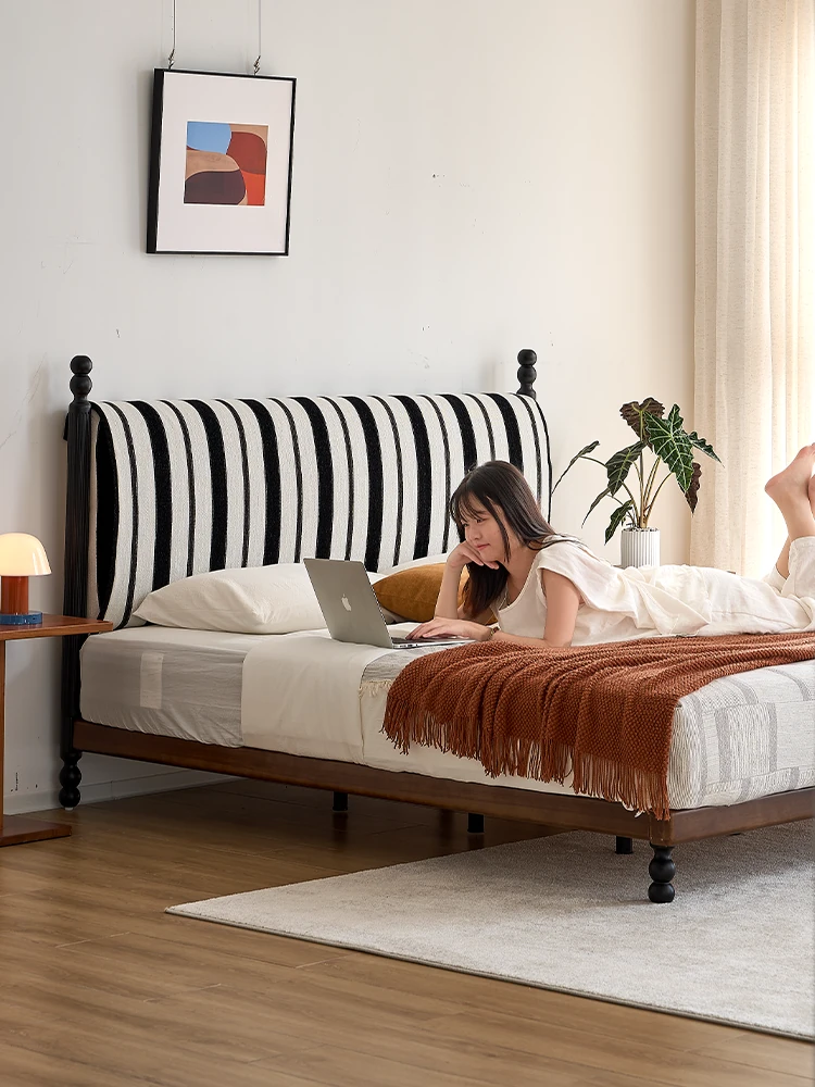 Kadeer Vintage Style Removable Striped Fabric Headboard Bed - Solid Wood Double Bed for Main Bedroom, Perfect for Small Spaces