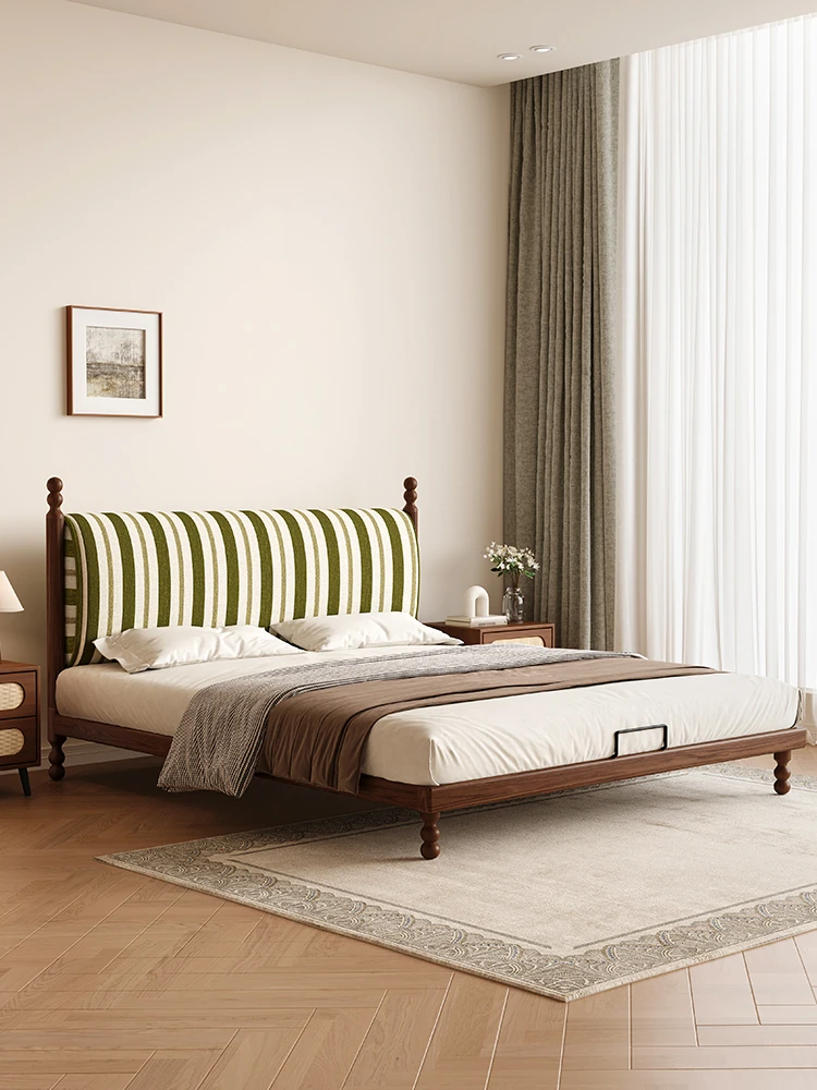 Kadelii Vintage Style Thin Headboard Bed with Removable Striped Fabric, All Solid Wood, Spacious Double Bed for Main Bedroom with Storage Solutions - Perfect Blend of Elegance and Functionality!