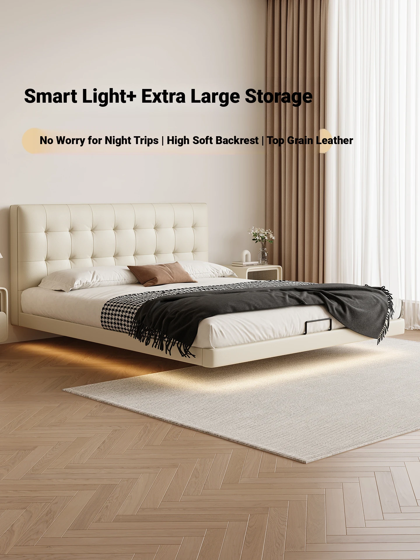 Kadelie Puff Bed - Modern Minimalist White Genuine Leather Double Bed with French Cream Layer and Ample Storage for Master Bedroom