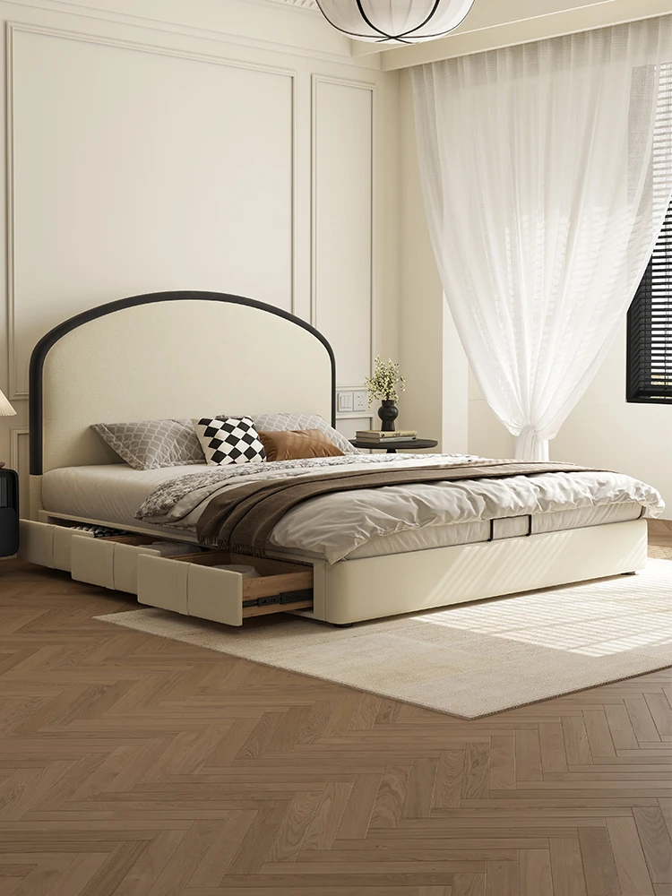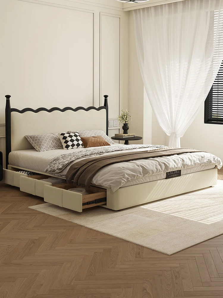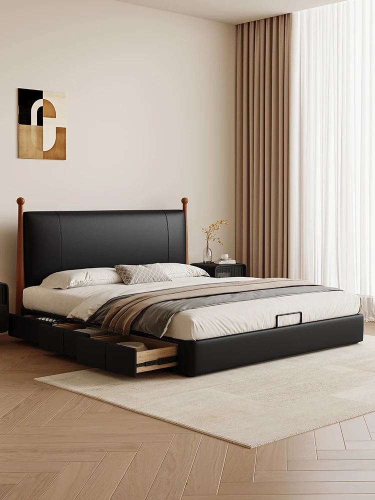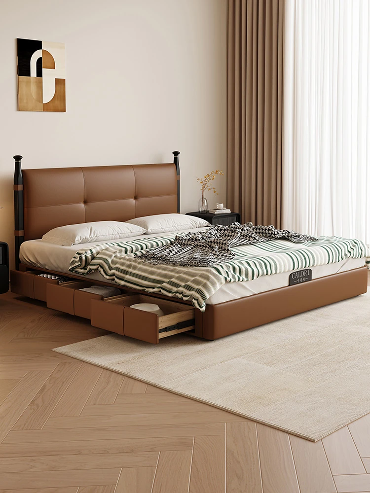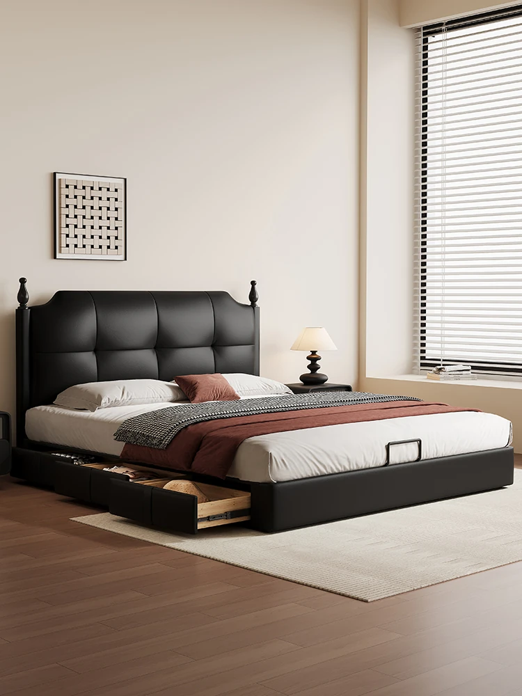 Kaderli Retro French Style Genuine Leather Bed with Storage - Perfect for Small Spaces, Featuring a Sleek Headboard, Ideal for Master Bedrooms or Couples.