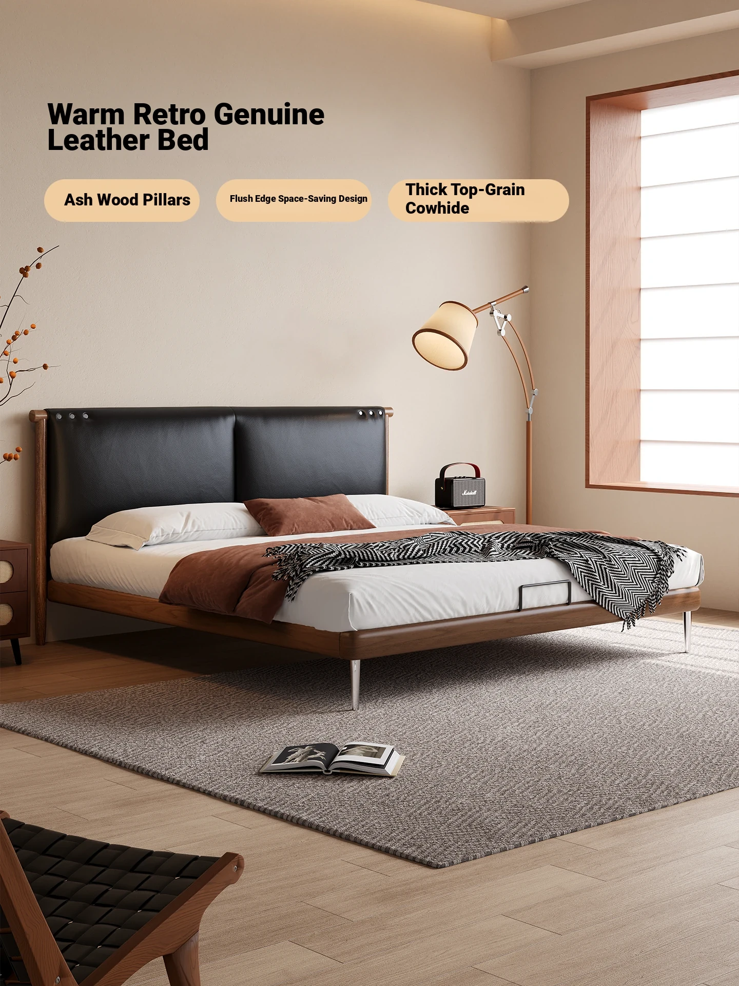 Kadeer Black Vintage Retro King Size Bed - High-End Genuine Leather Thin Headboard with Storage - Solid Wood Design for Small Spaces