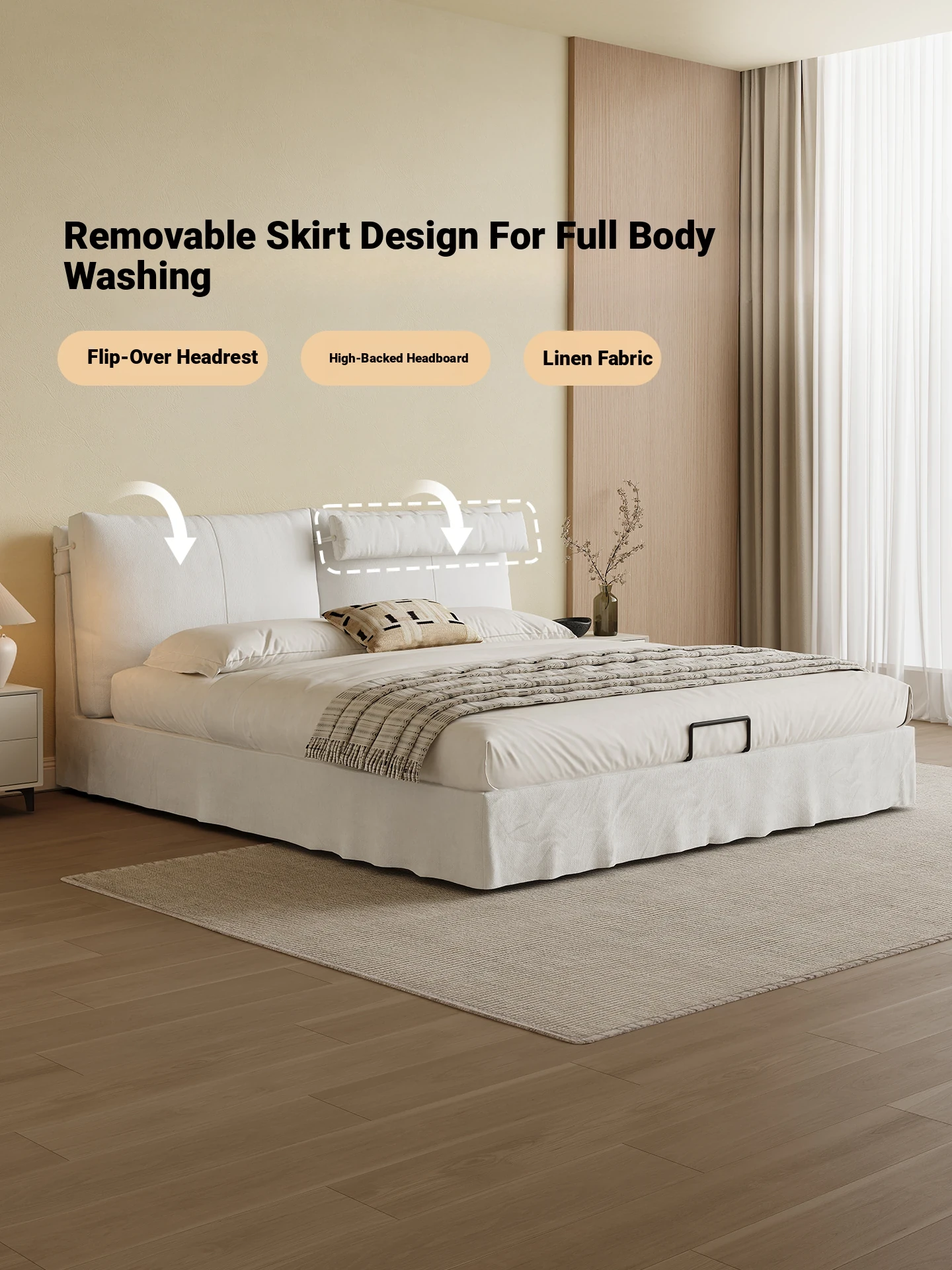 Kardeli Modern Minimalist Removable Linen Fabric Bed in Cream White - Wabi-Sabi Style Storage Solution for Master Bedroom Double Bed