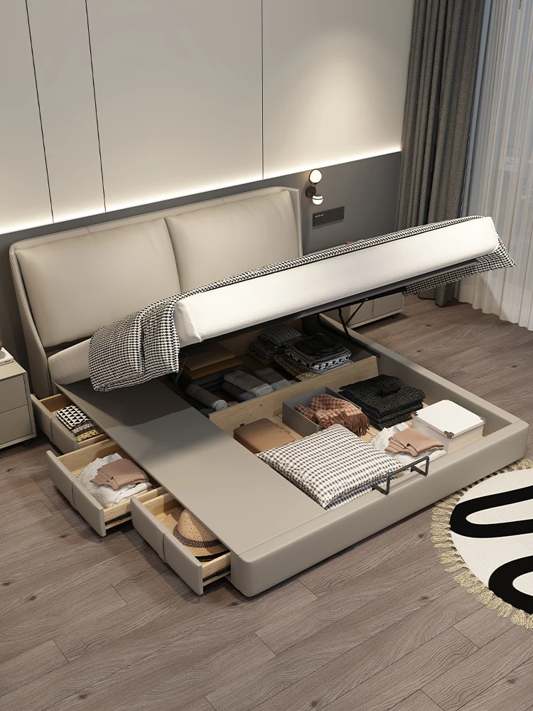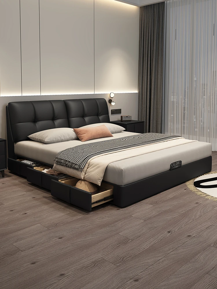 Kardeli Italian Minimalist Genuine Leather Bed - Modern Simple Design with Storage Drawers, High-Box Soft Package, Perfect for Master Bedrooms - Stylish and Functional Double Bed