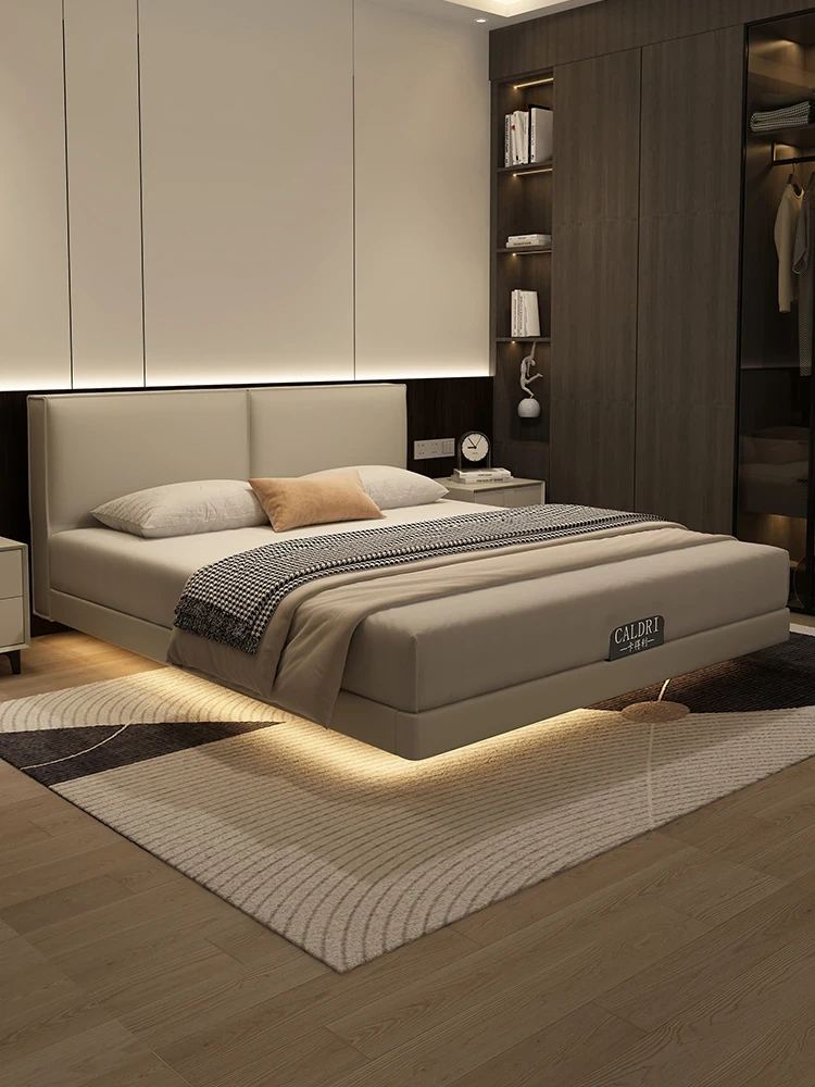 Kadeley Floating Bed with Tofu Block Design - Luxurious Italian Minimalist King-Size Leather Bed for Modern Bedrooms, Soft-Padded and Stylish.