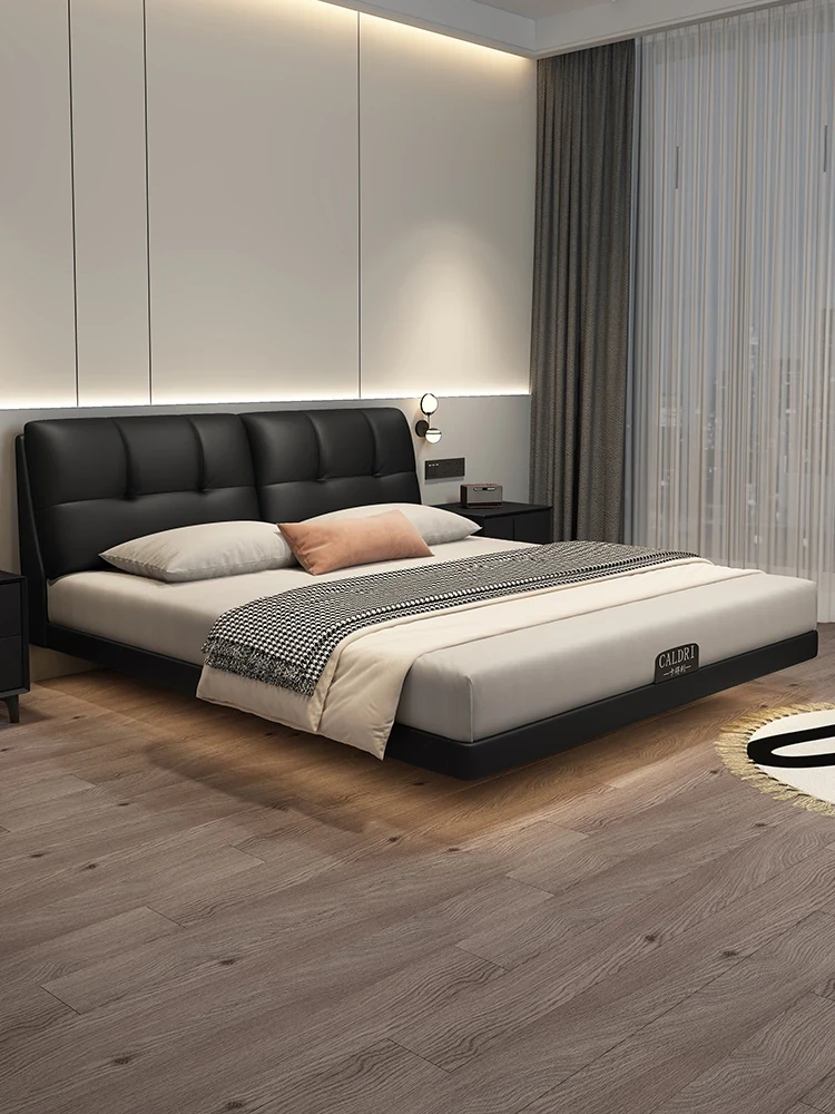 KadeLi Floating Genuine Leather Bed - Luxurious Modern Minimalist Soft-Padded Black Double Bed for Master Bedroom - Perfect Blend of Elegance and Comfort