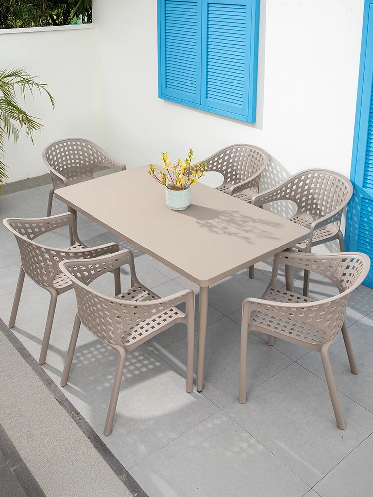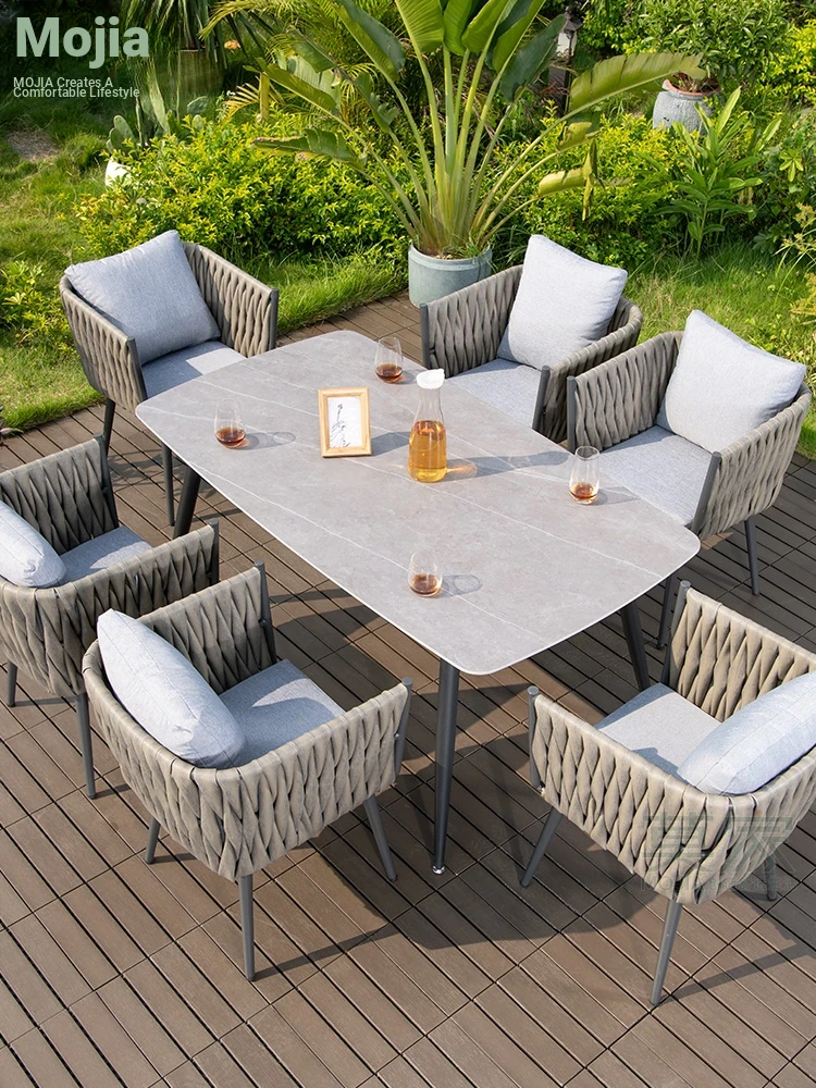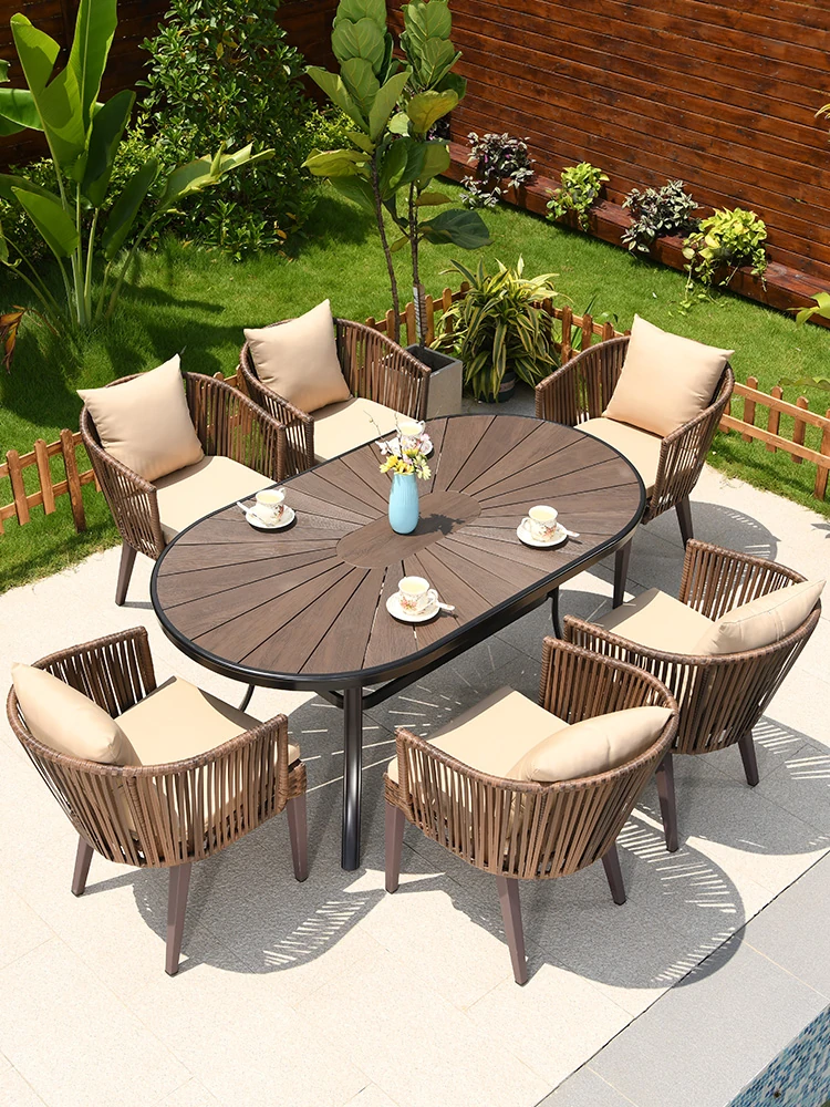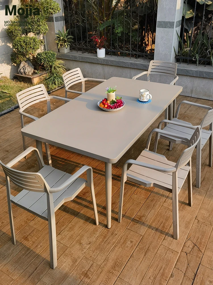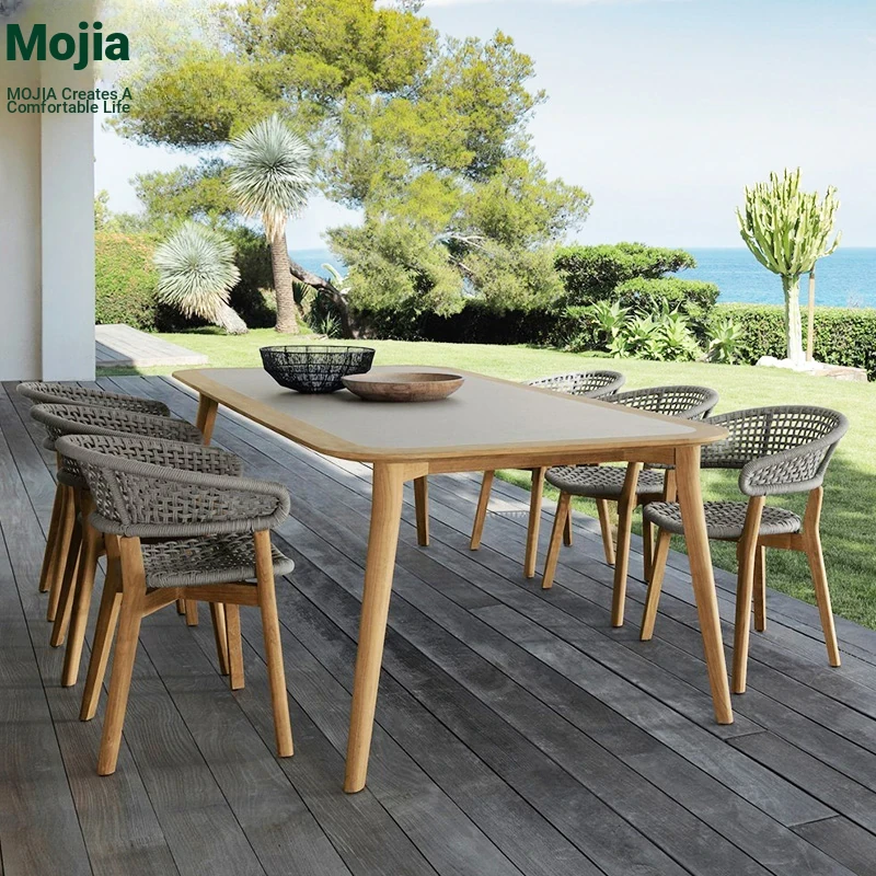 Mojia Outdoor Dining Set - Stylish Patio Furniture for Garden and Villa, Featuring Comfortable Plastic-Wood Reclining Chairs and Trendy Rattan Lounge Chairs for Your Terrace and Balcony