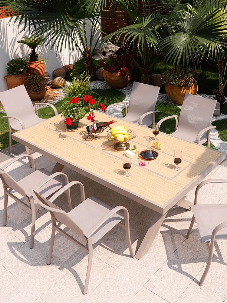 Outdoor Aluminum Alloy Patio Dining Table Set - Waterproof, Sun-Resistant, Extendable Long Table with Relaxing Chairs for Garden and Courtyard Gatherings