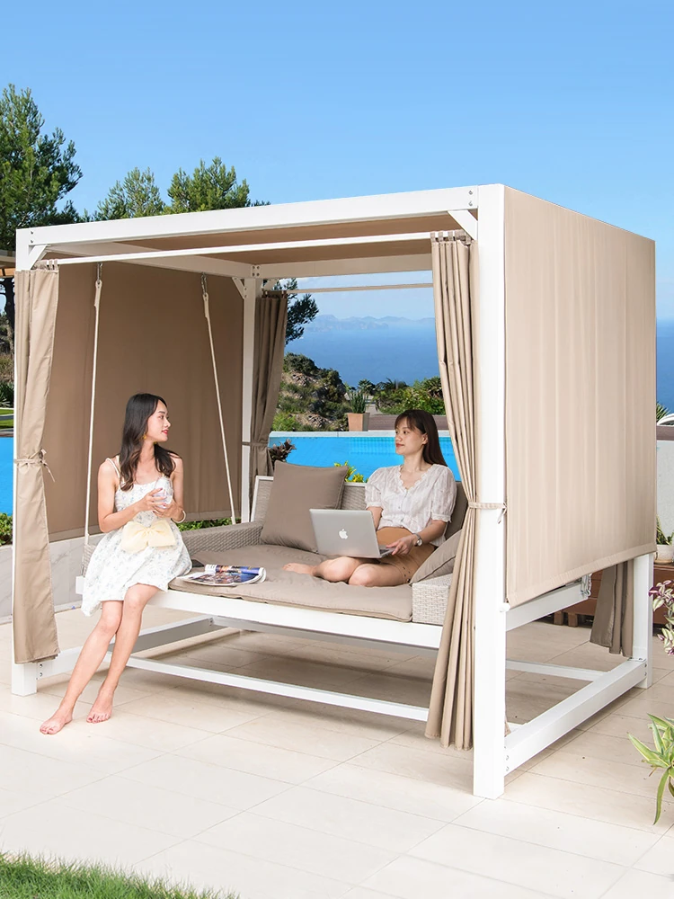 Nordic Outdoor Swing Bed - Cozy Double Rattan Swing Chair for Poolside Relaxation, Perfect for Your Vacation Getaway! Ideal for Courtyards and Gardens.