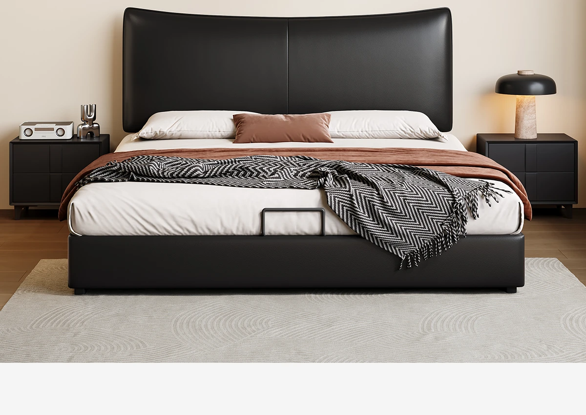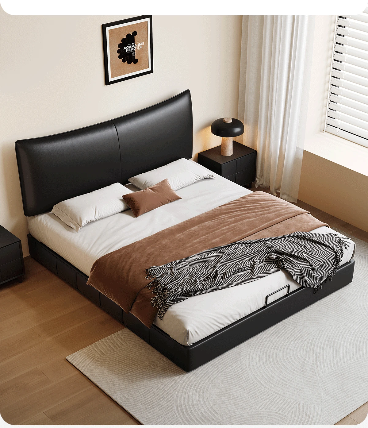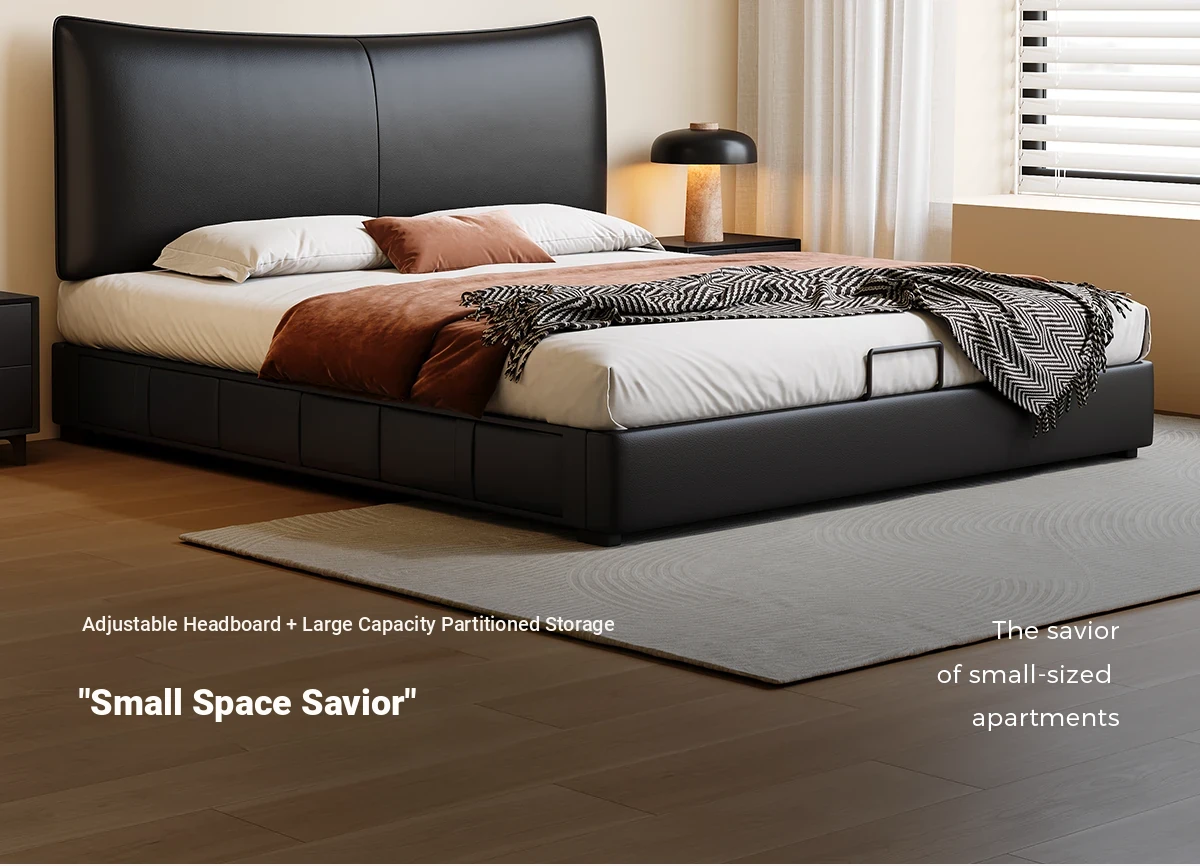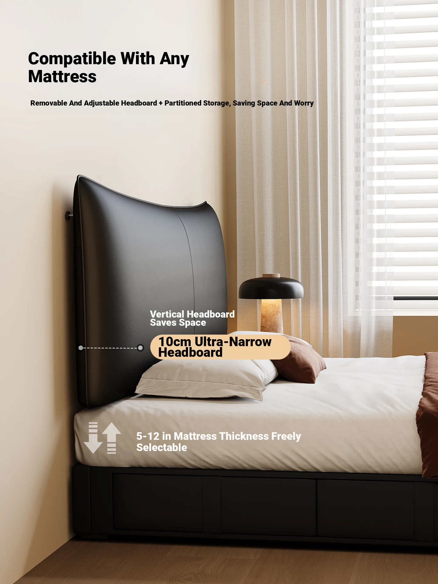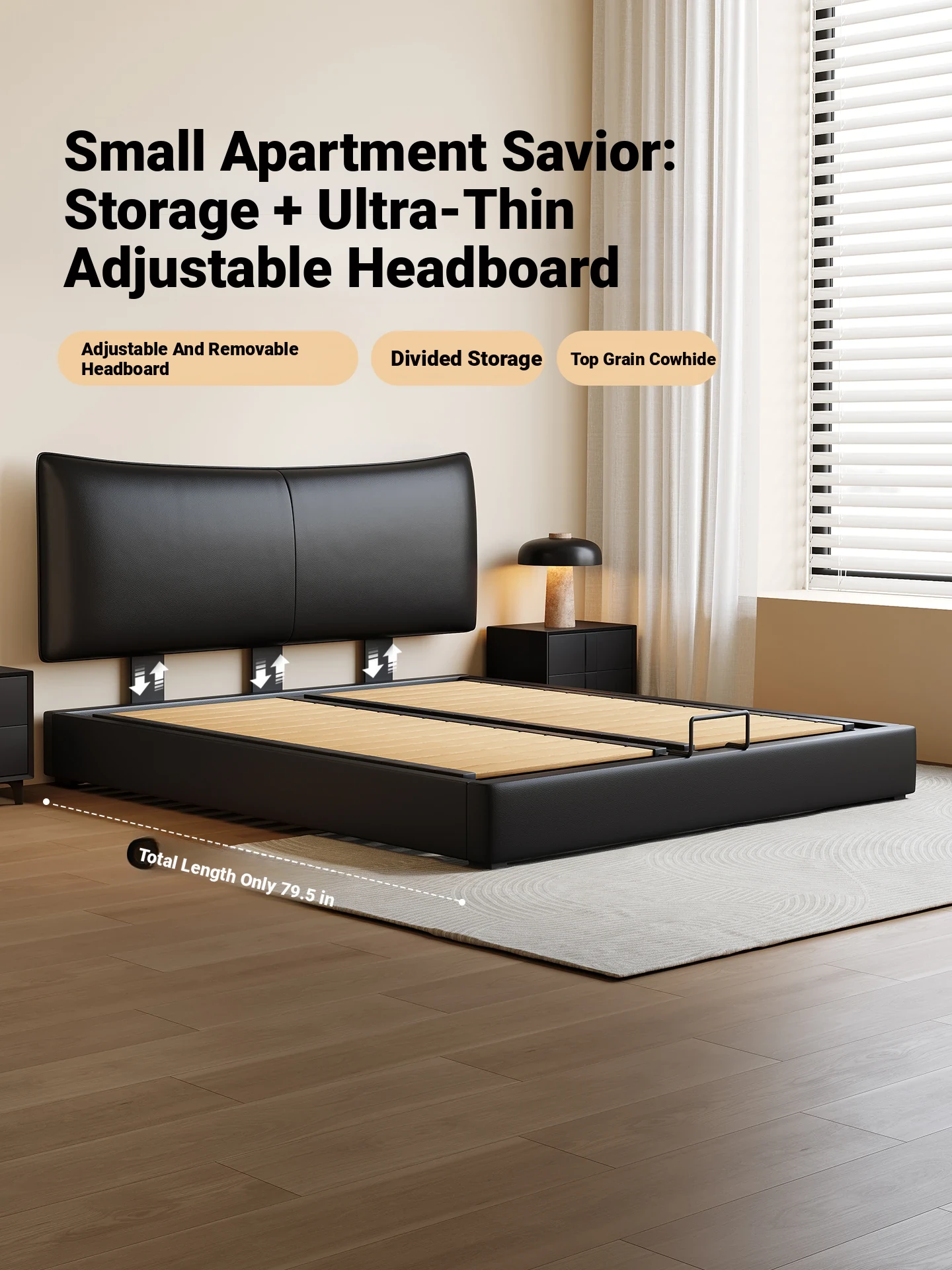 Chic Italian Style Adjustable Thin Bed with Storage - Genuine Top-Grain Leather Headboard in Black for Small Spaces - Perfect for Cozy Living!
