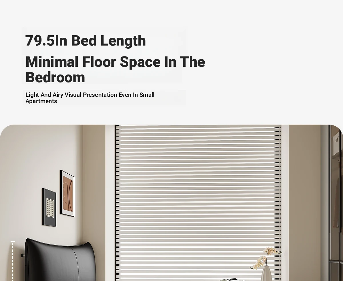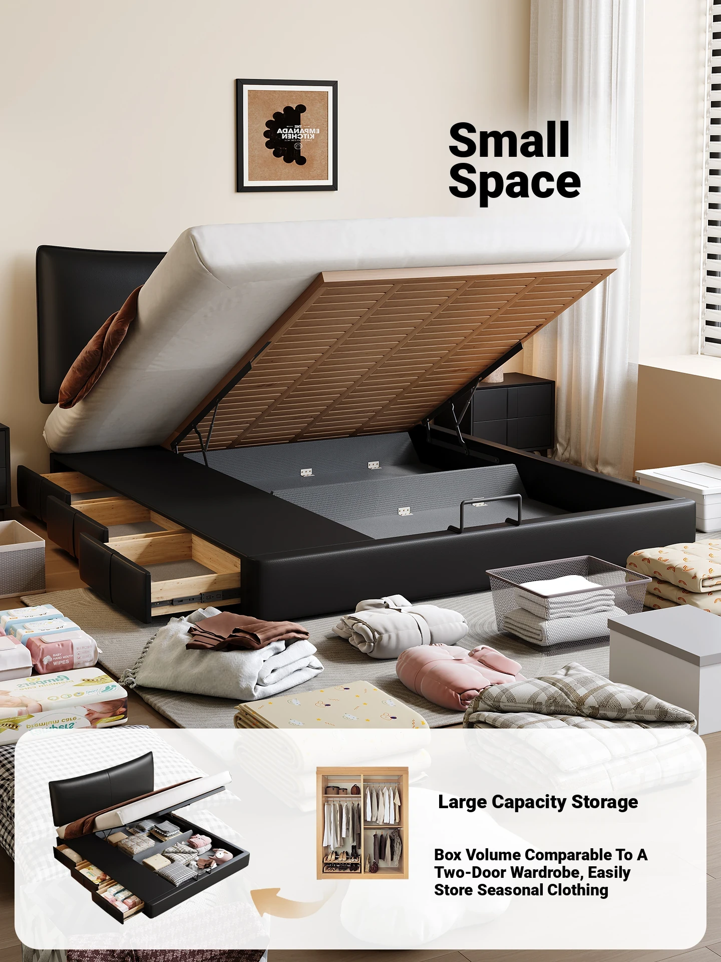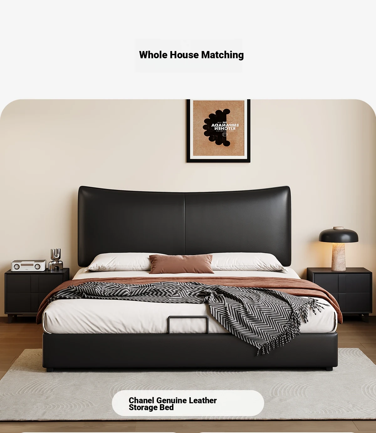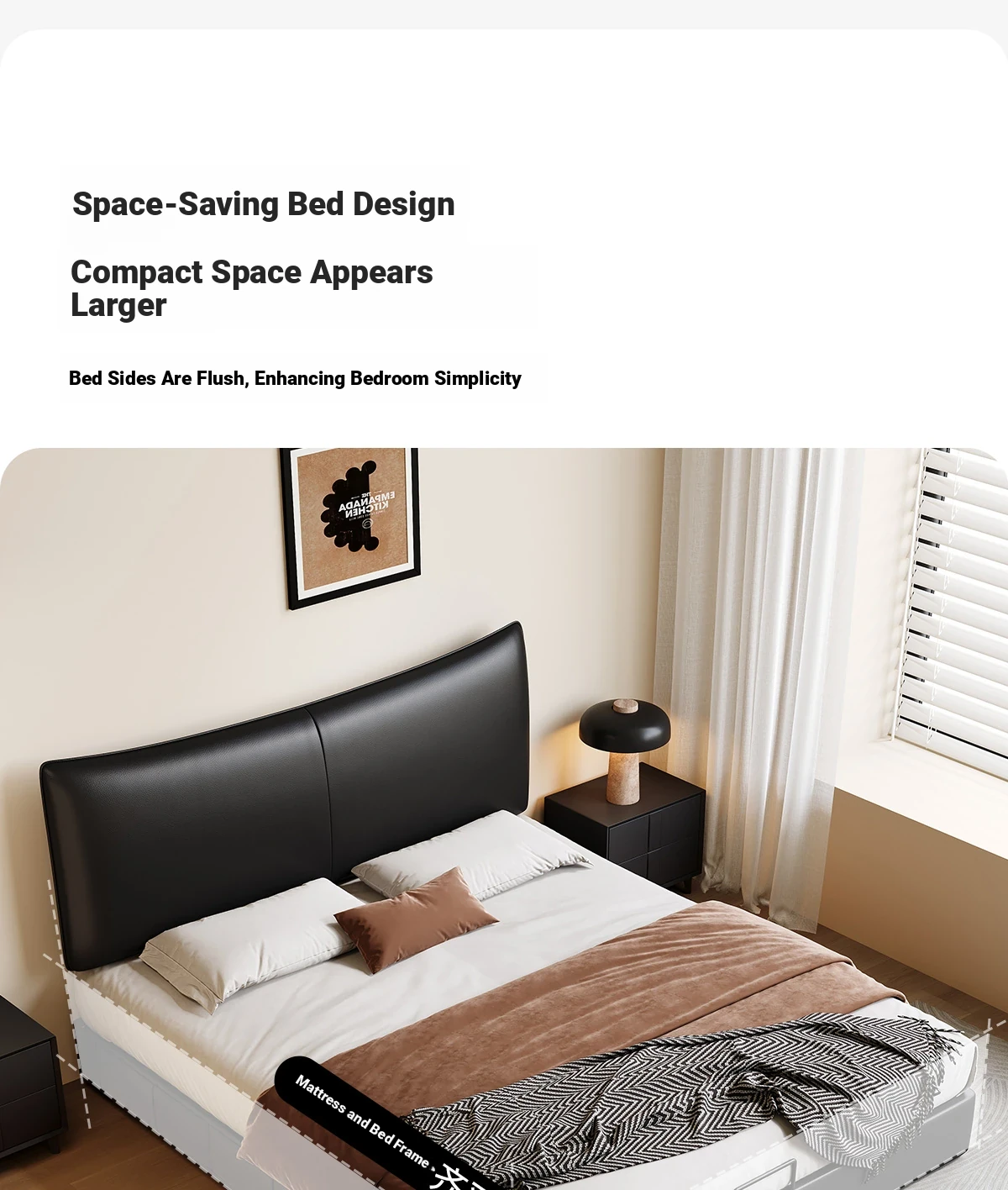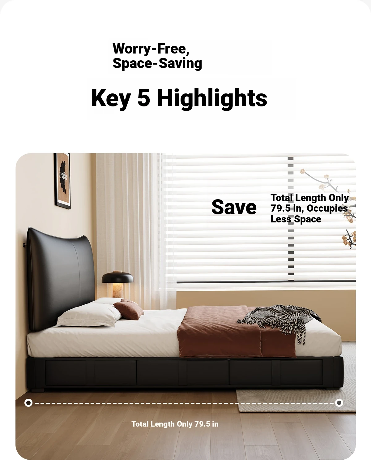 Chic Italian Style Adjustable Thin Bed with Storage - Genuine Top-Grain Leather Headboard in Black for Small Spaces - Perfect for Cozy Living!