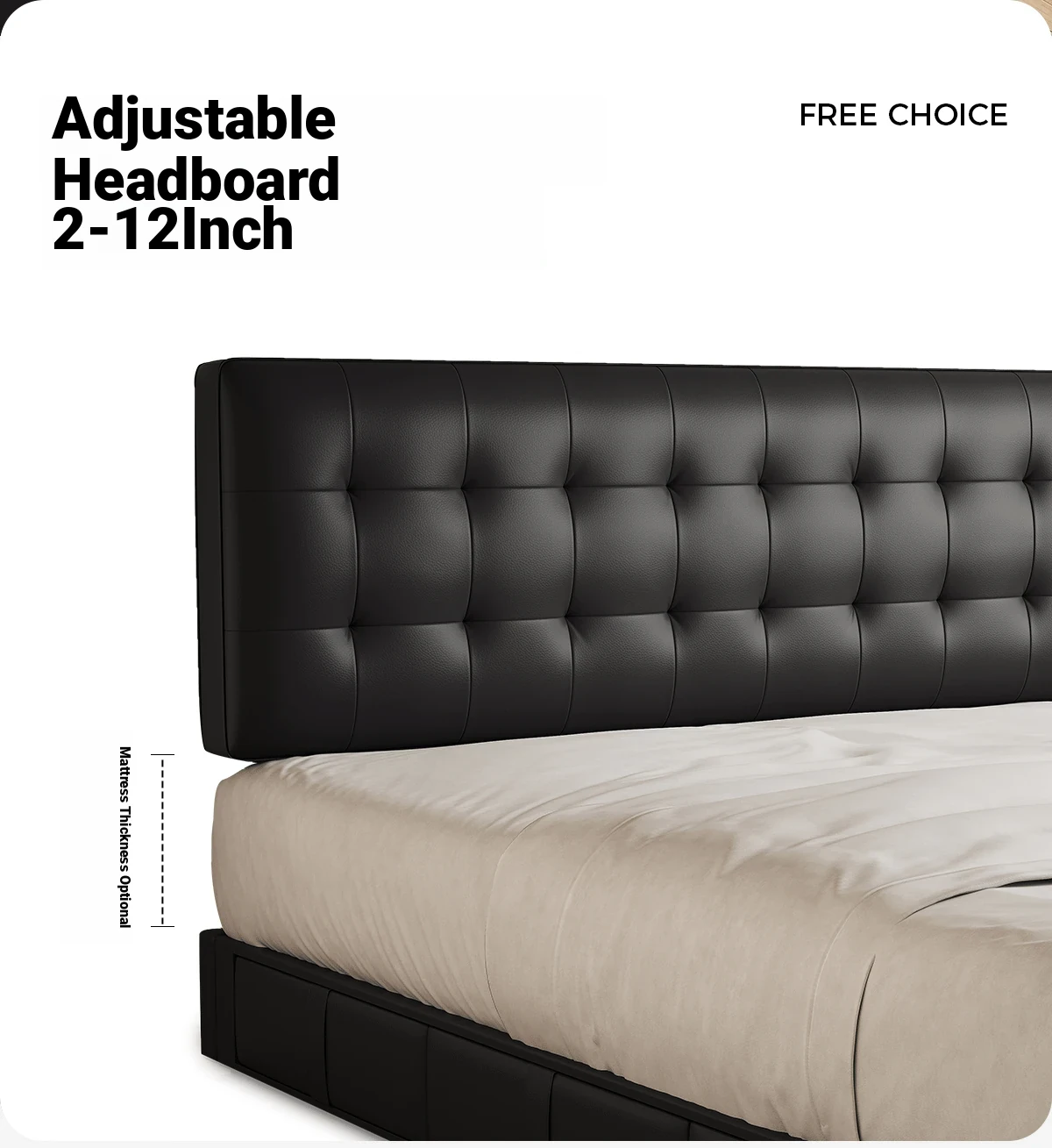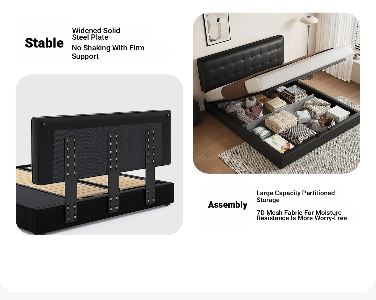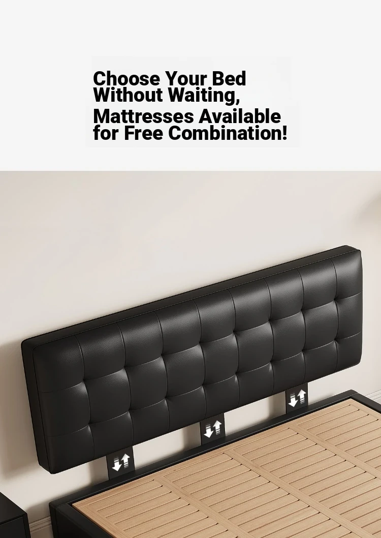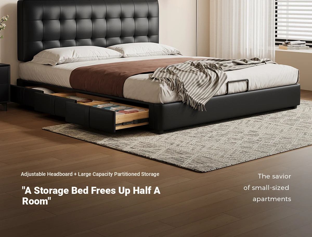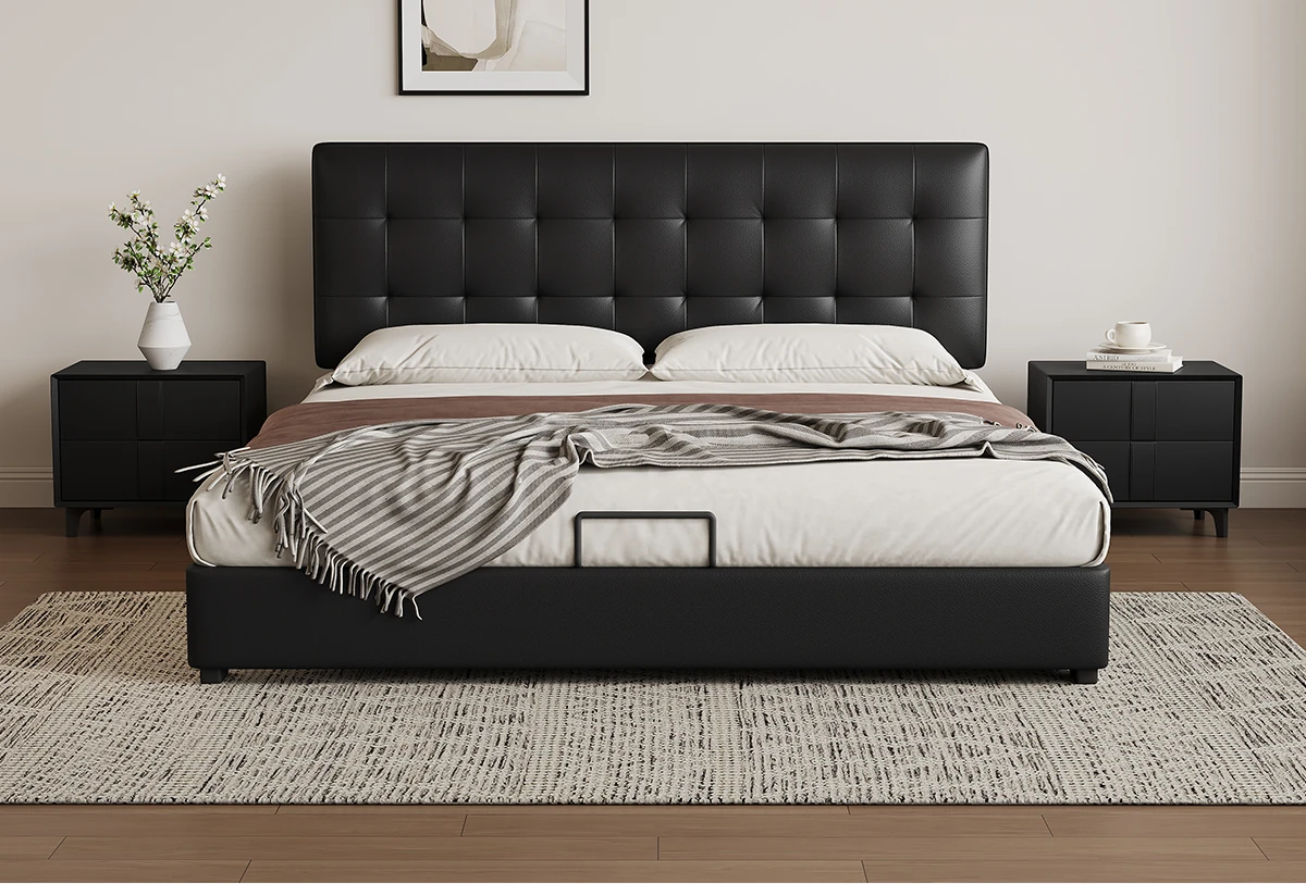Kadel Leather Storage Bed with Adjustable Thin Headboard - Black Mid-Century Double Bed for Small Spaces