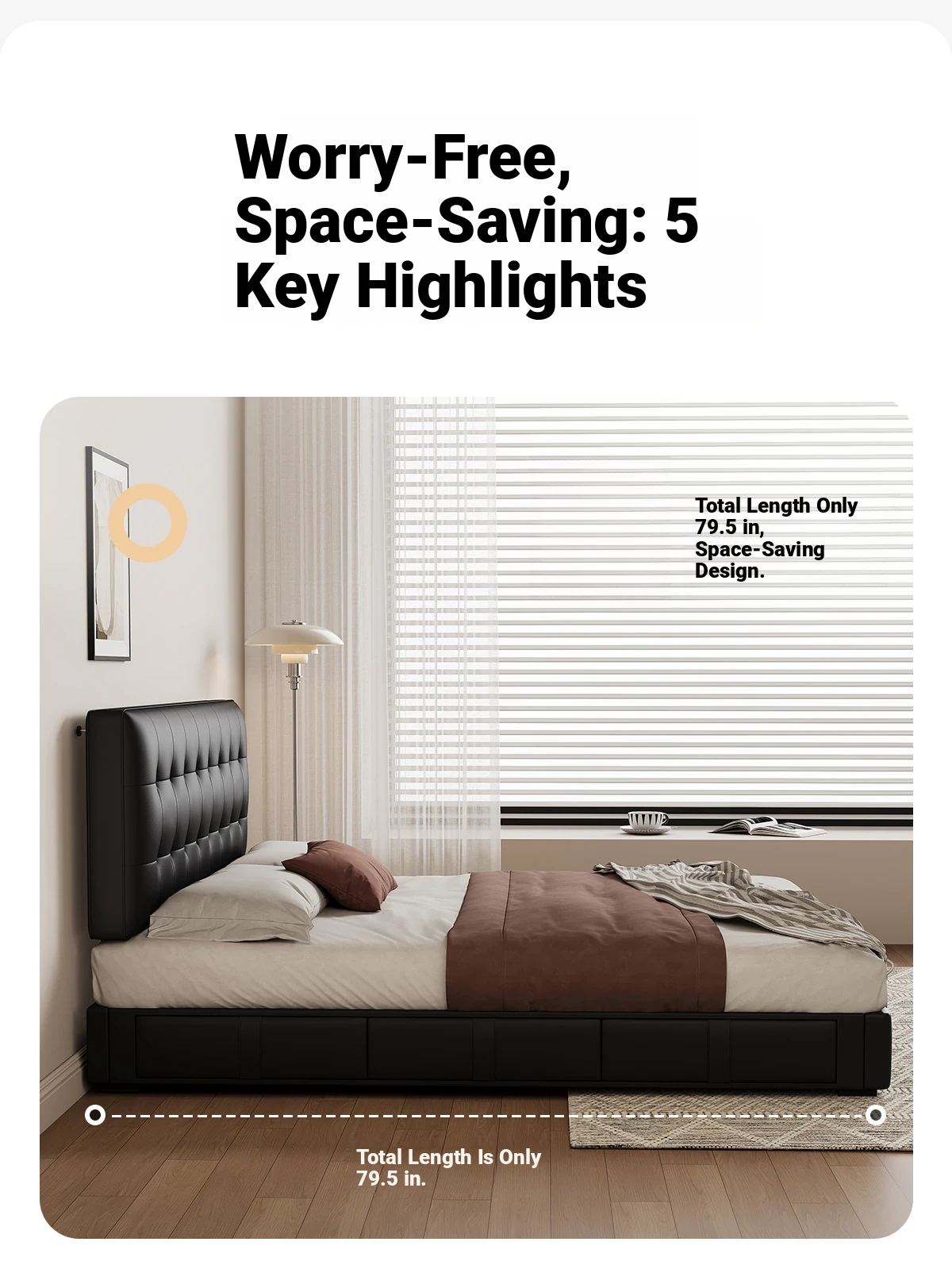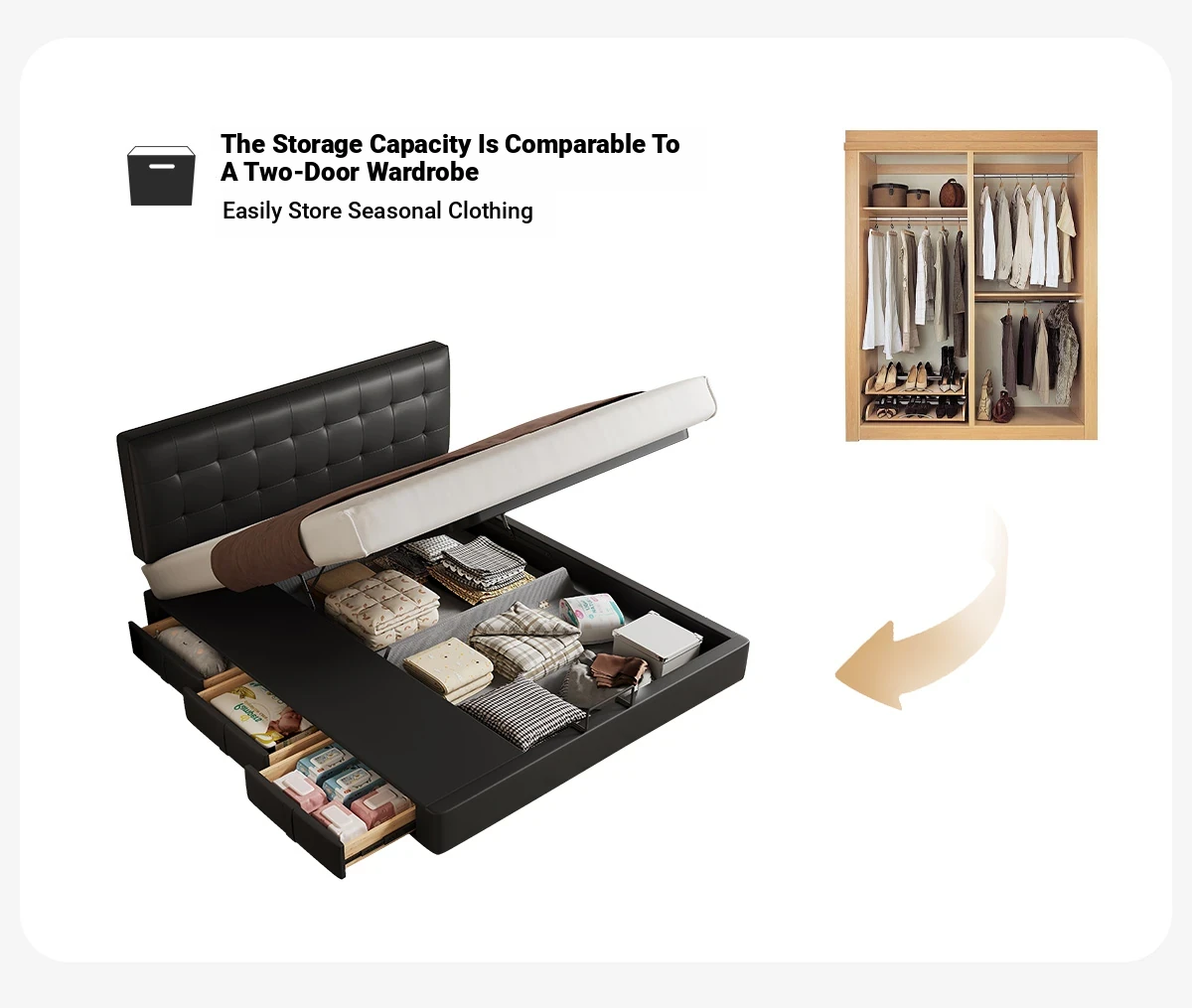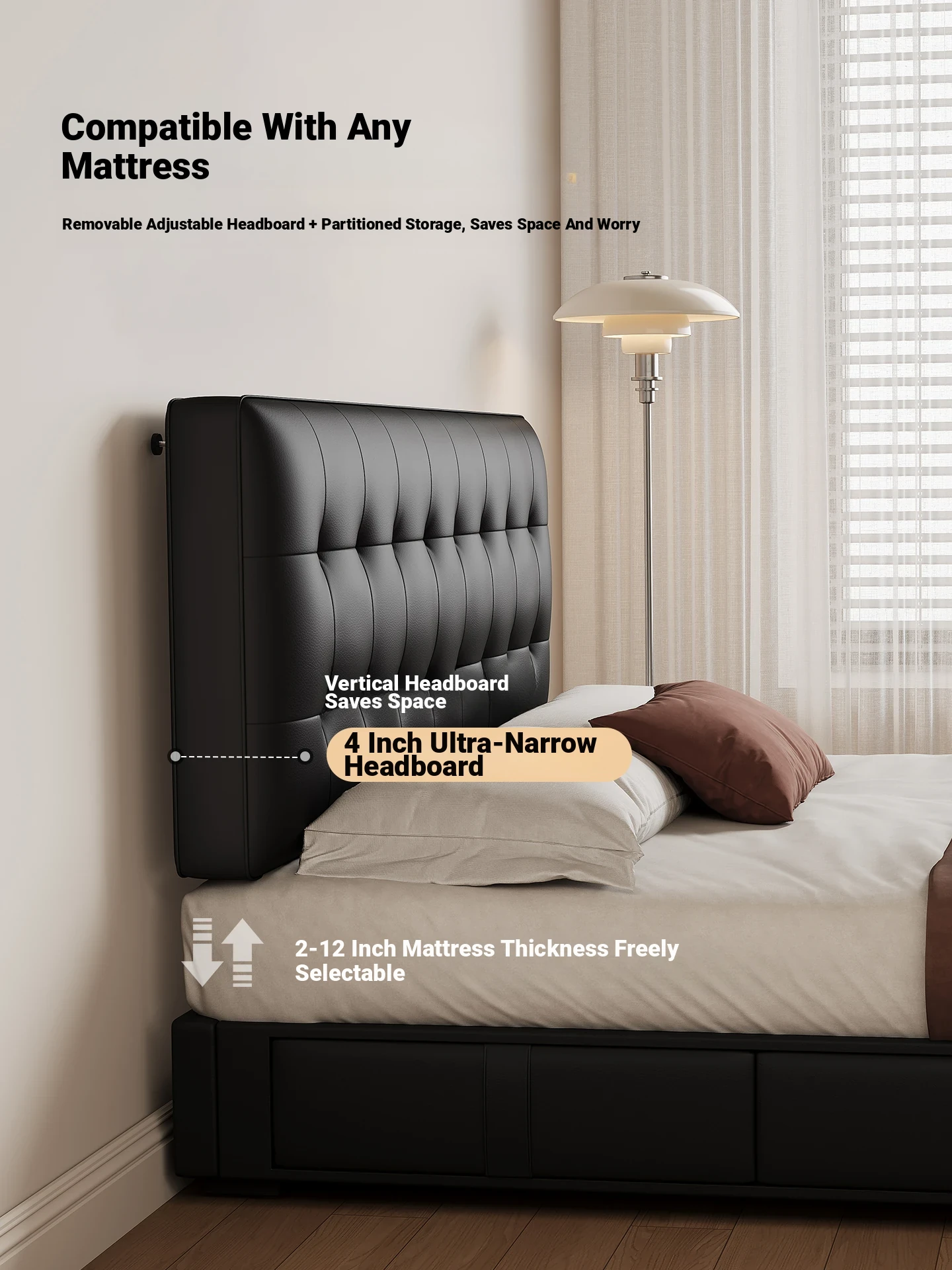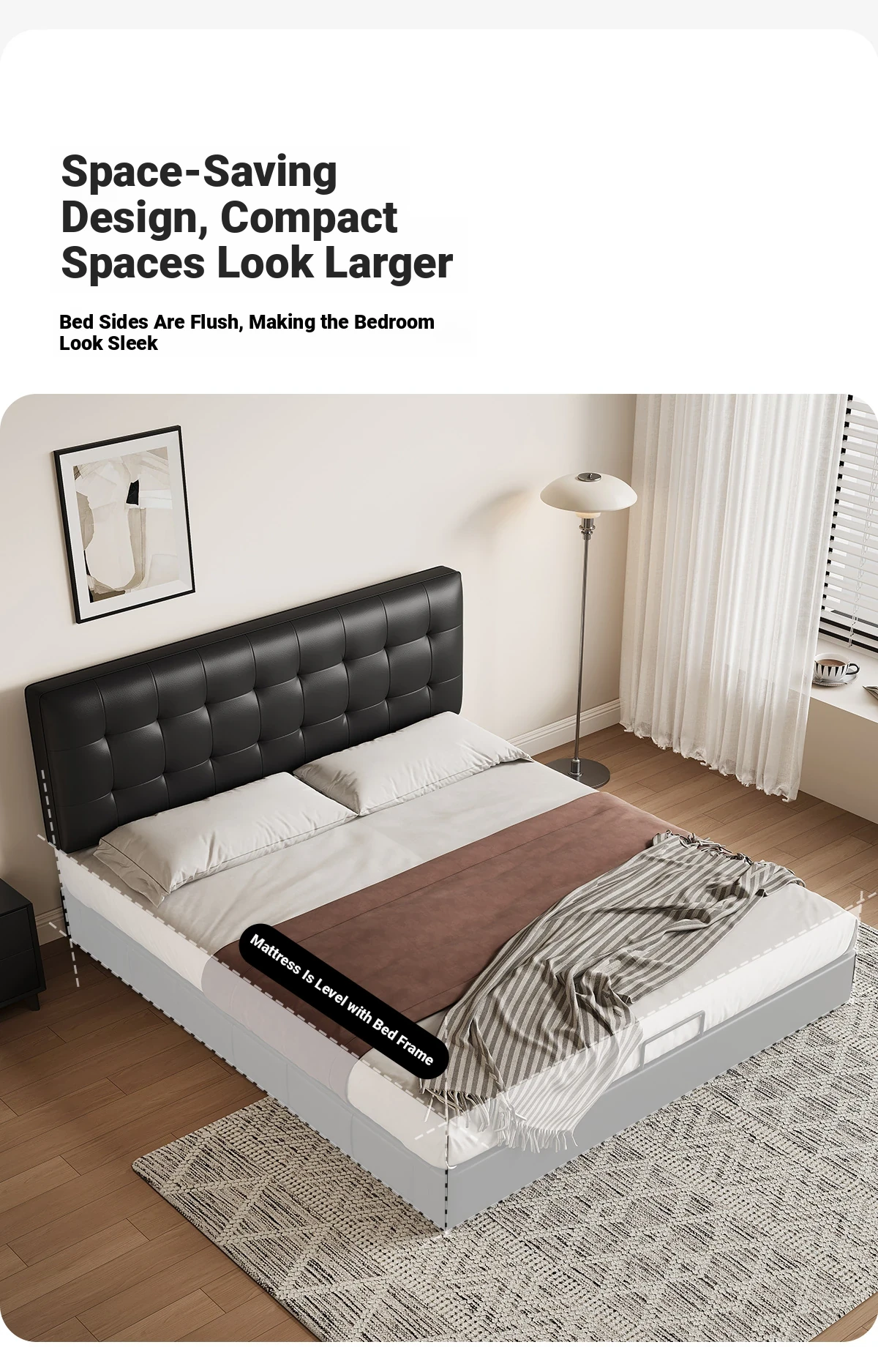 Kadel Leather Storage Bed with Adjustable Thin Headboard - Black Mid-Century Double Bed for Small Spaces
