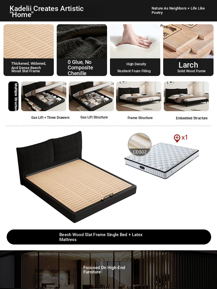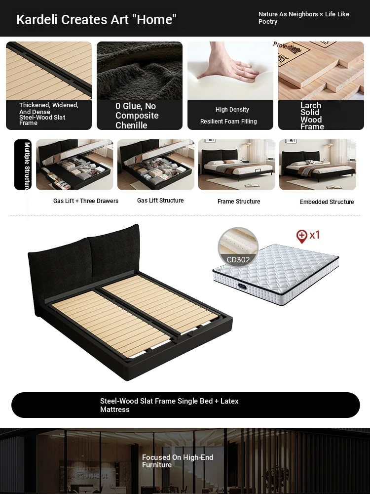 Flagship Edition: Chenille Fabric Bed [Thickened Beechwood Slatted Frame] + Nightstand *1 + Five-Star Independent Spring Latex Mattress