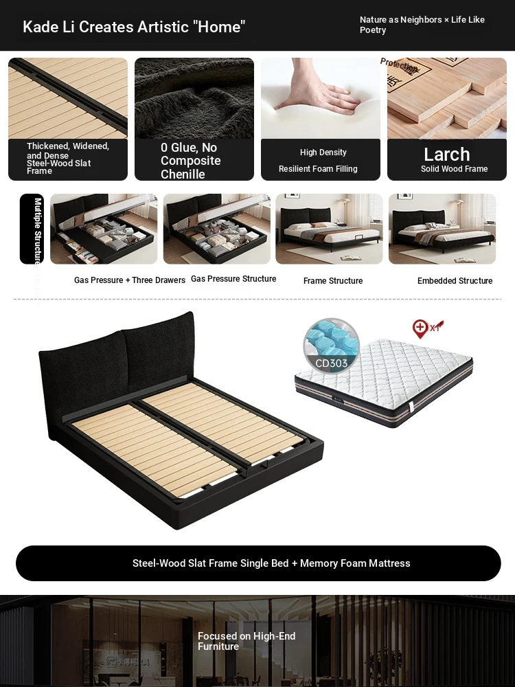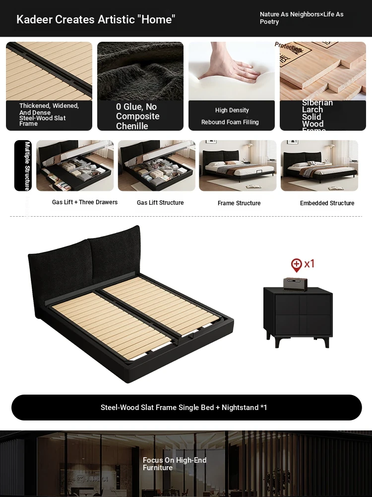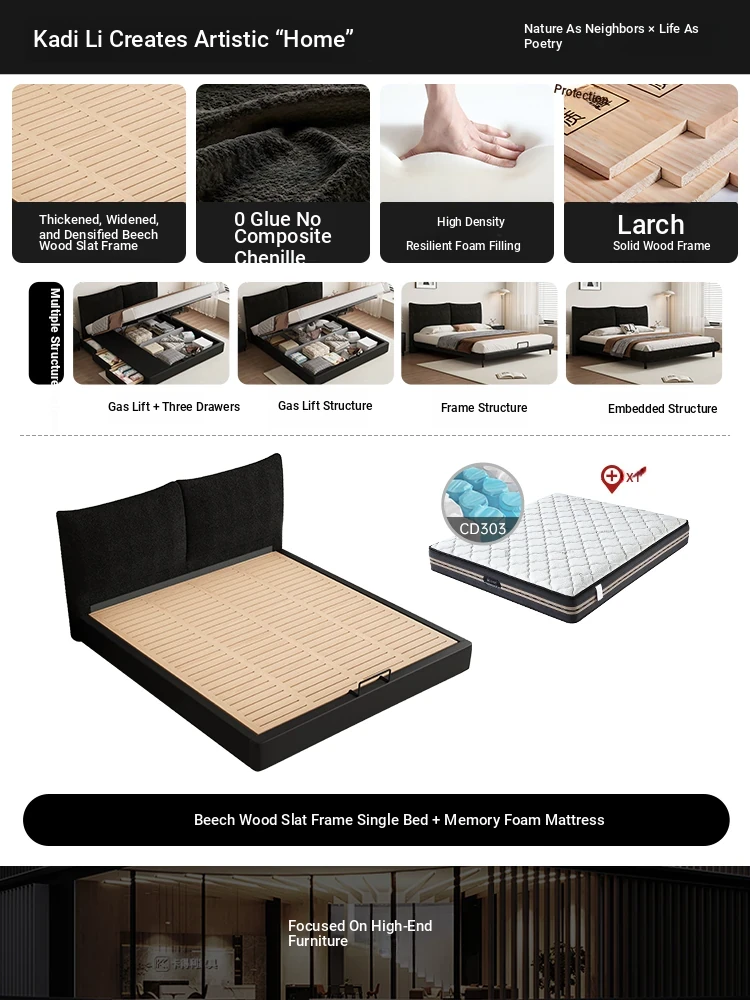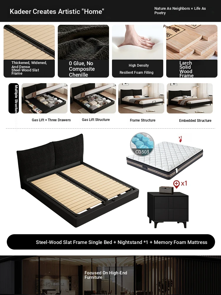 Flagship Edition: Chenille Fabric Bed [Thickened Beechwood Slatted Frame] + Nightstand * 1 + Seven-Star Independent Spring Memory Foam Mattress