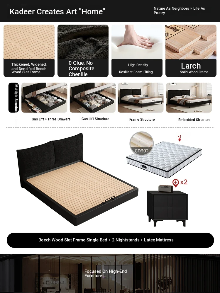 Flagship Edition: Chenille Fabric Bed [Thickened Beechwood Slatted Frame] + Nightstands * 2 + Five-Star Independent Spring Latex Mattress
