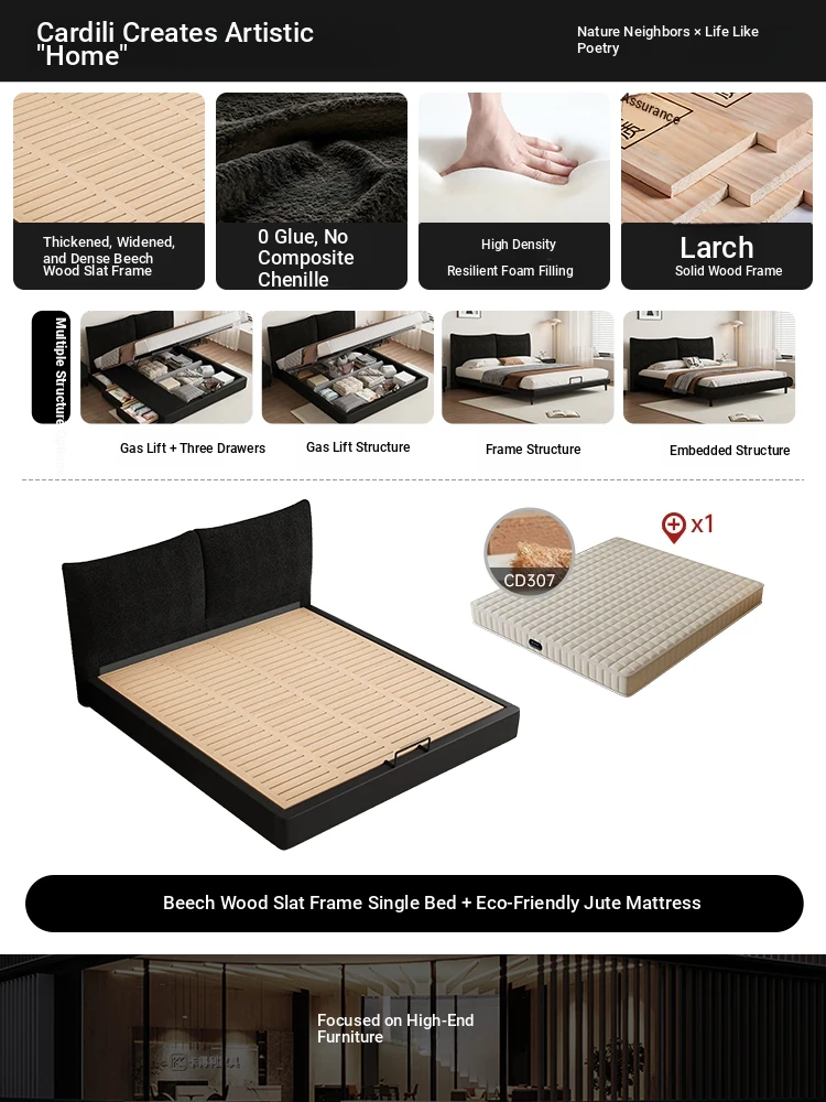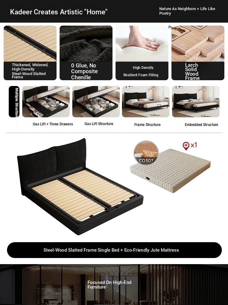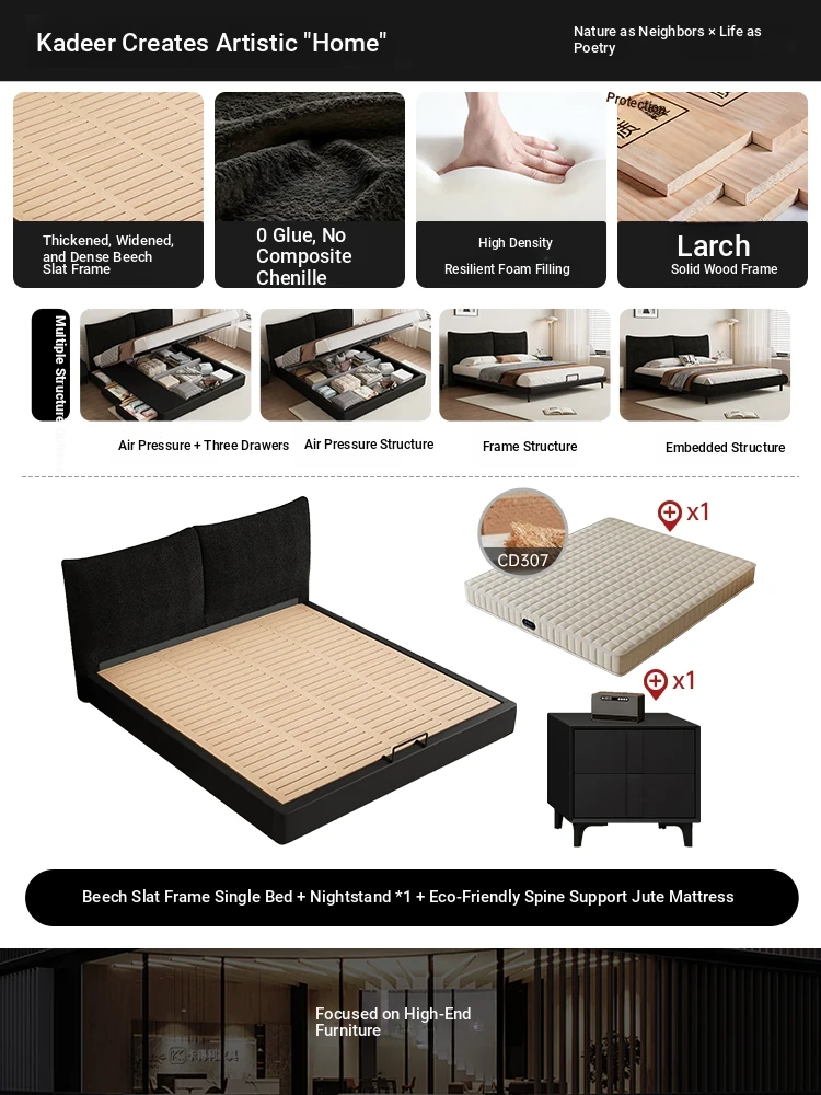 Flagship Edition: Chenille Fabric Bed [Thickened Beechwood Slat Frame] + Nightstand * 1 + Eco-Friendly Spine-Protecting Jute Mattress