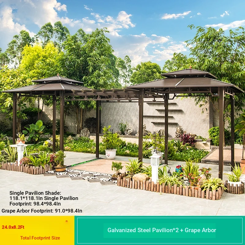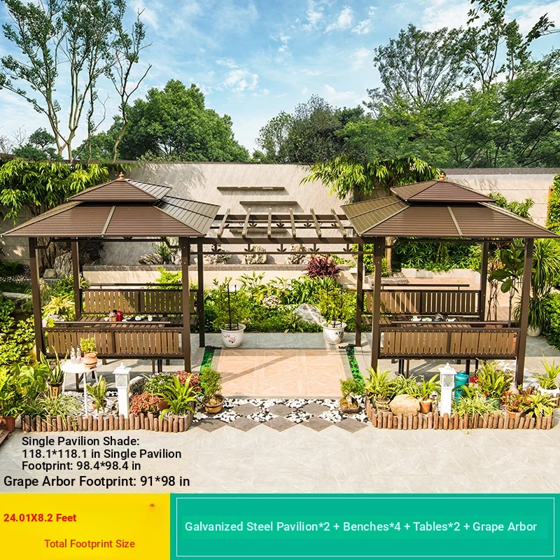 2.5x 267.72 in Galvanized Top Pavilion +6 Seat Plates +2 Tables +2 Swings + Gauze Curtain Cloth