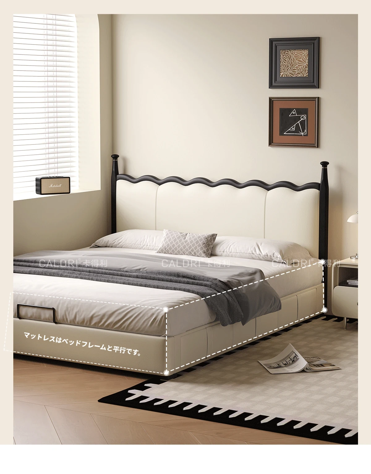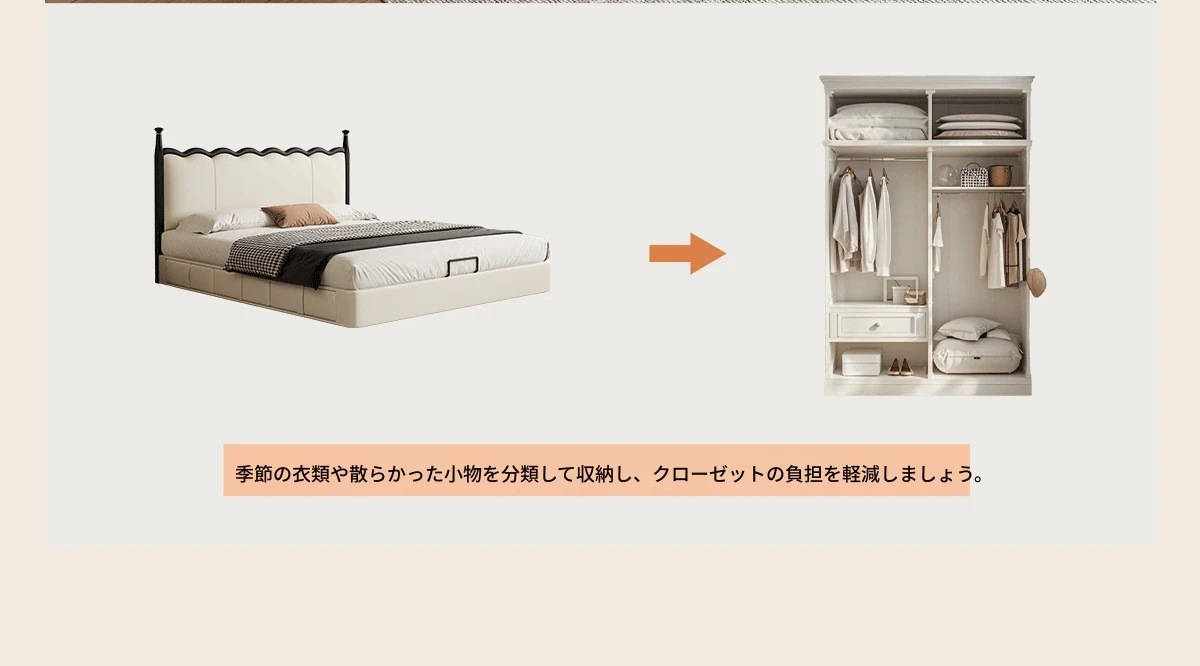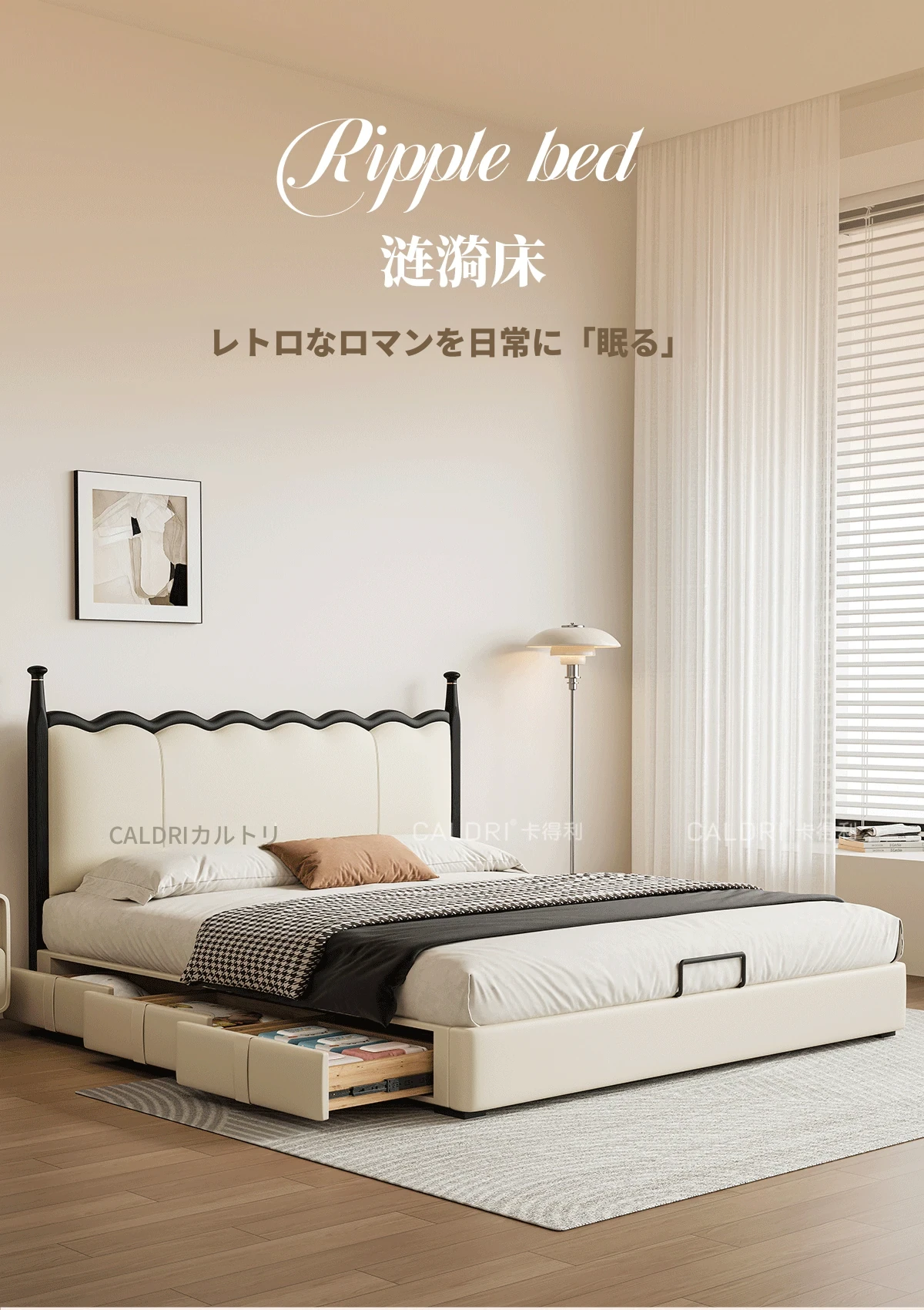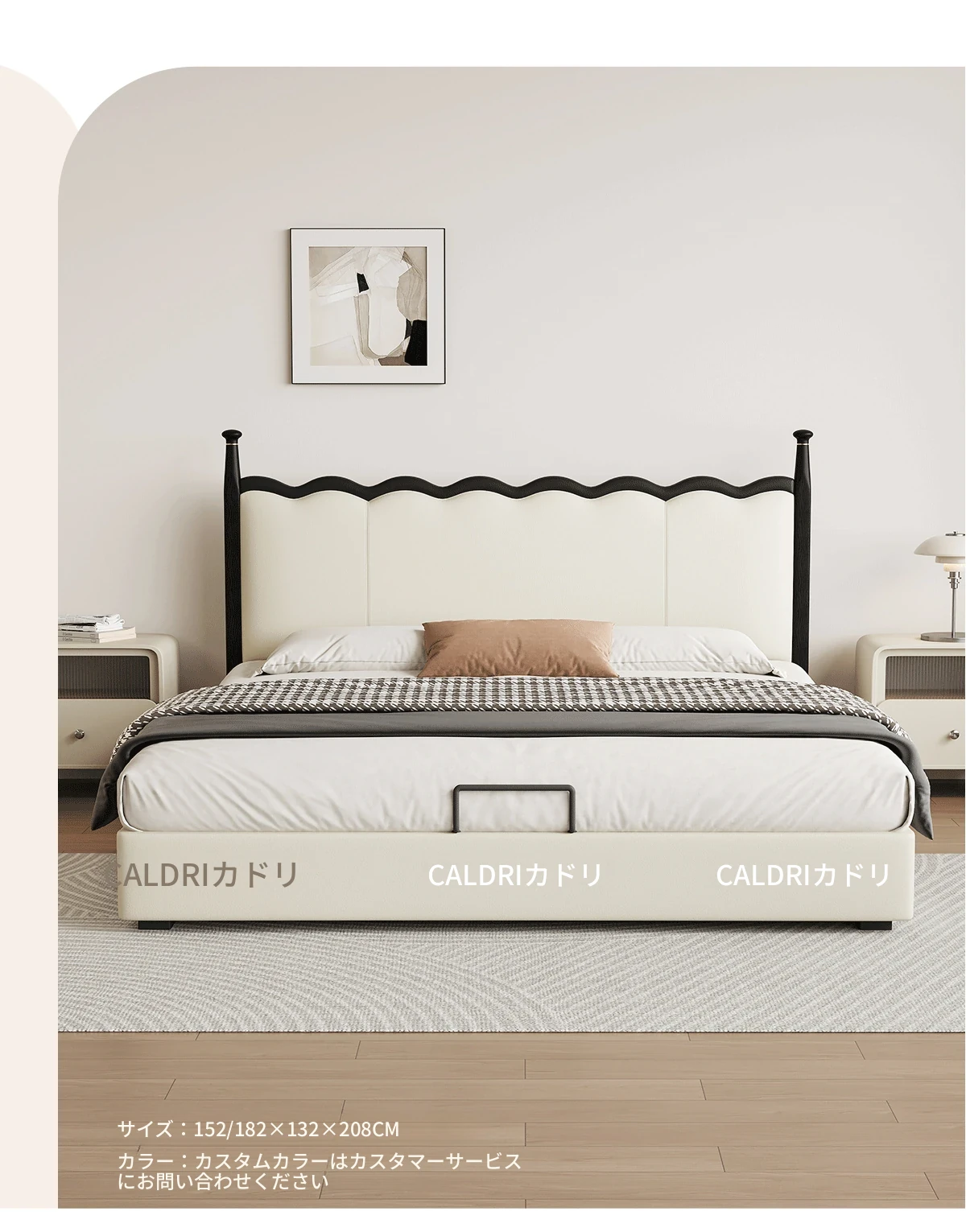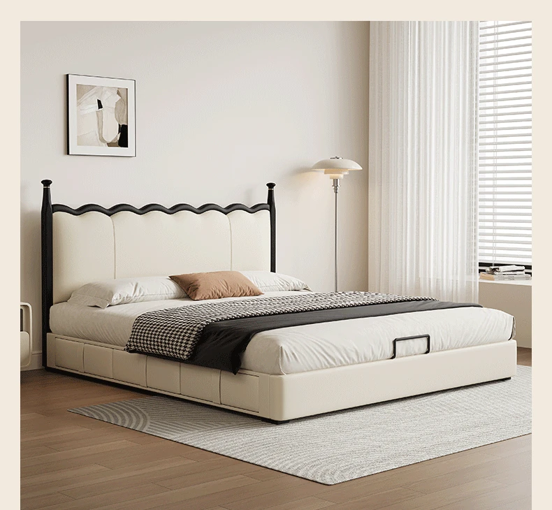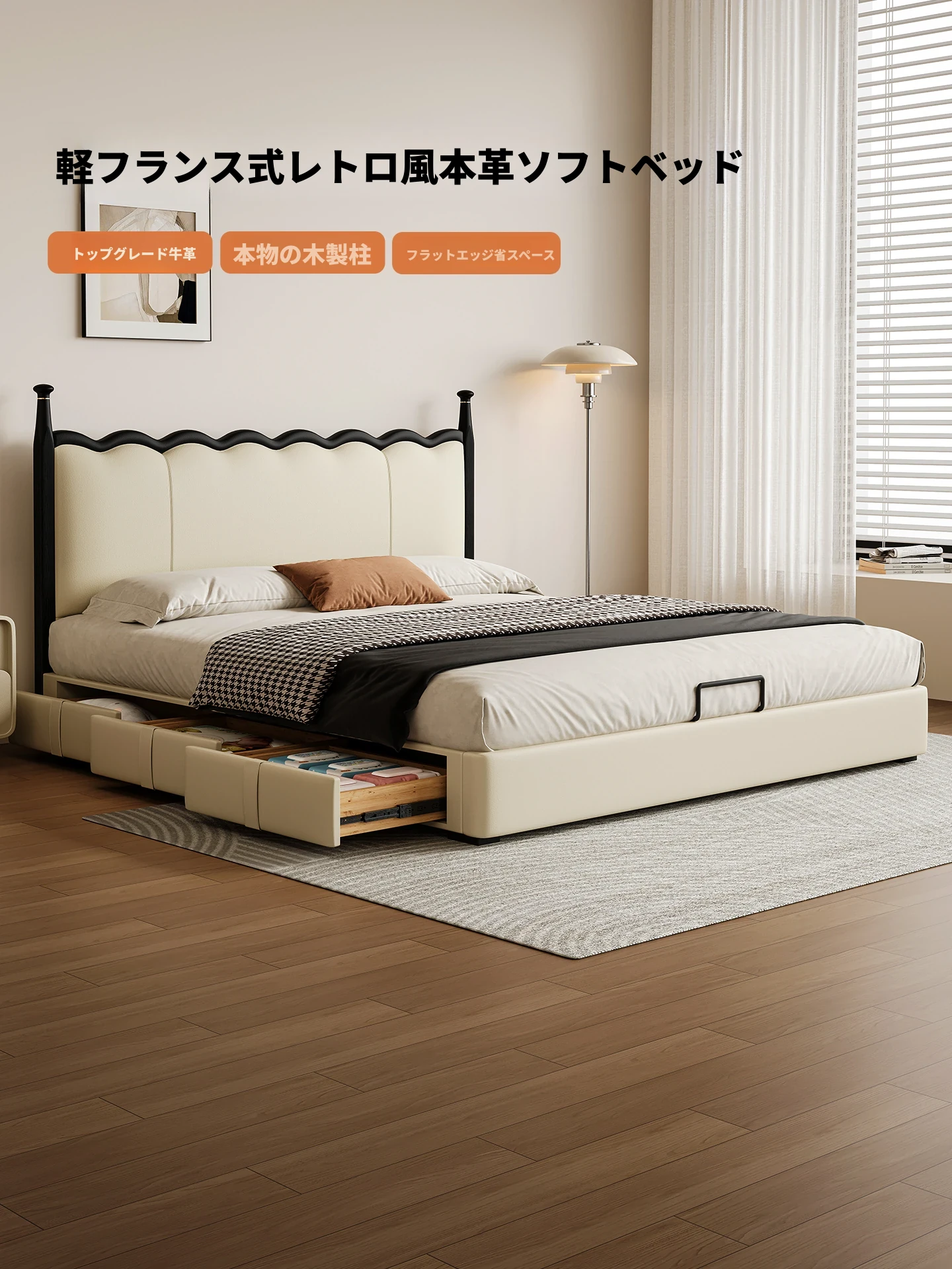 カデリ リップルベッド フランス風 本革 ヴィンテージ スリム ヘッドボード 小型住宅向け 一級牛革 ダブルサイズ 無垢材収納ベッド - スタイリッシュで機能的な空間を演出します!