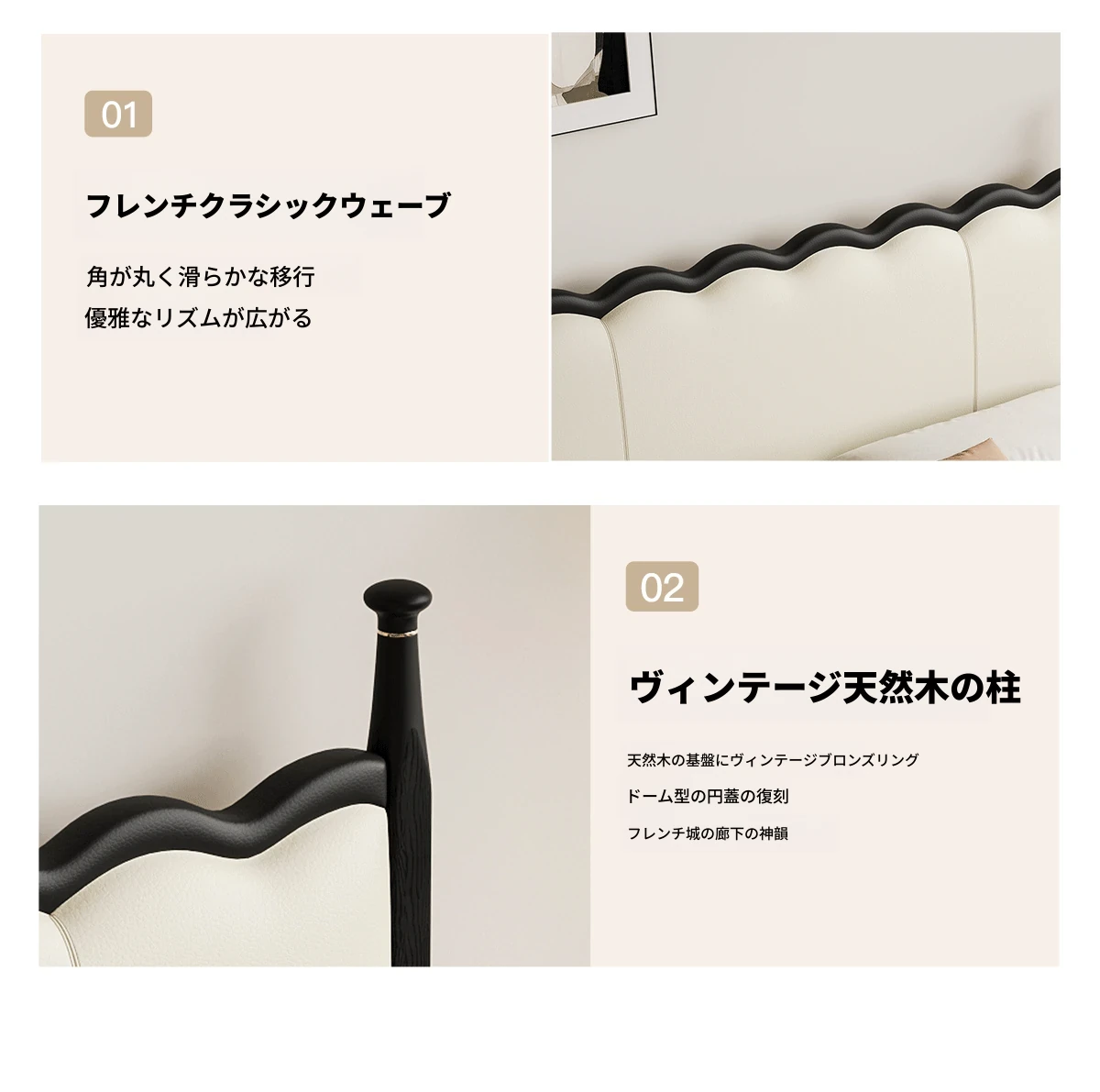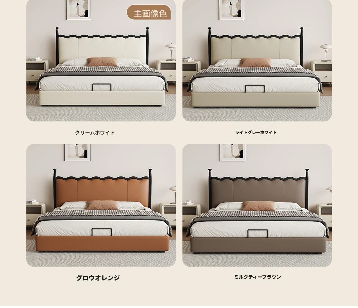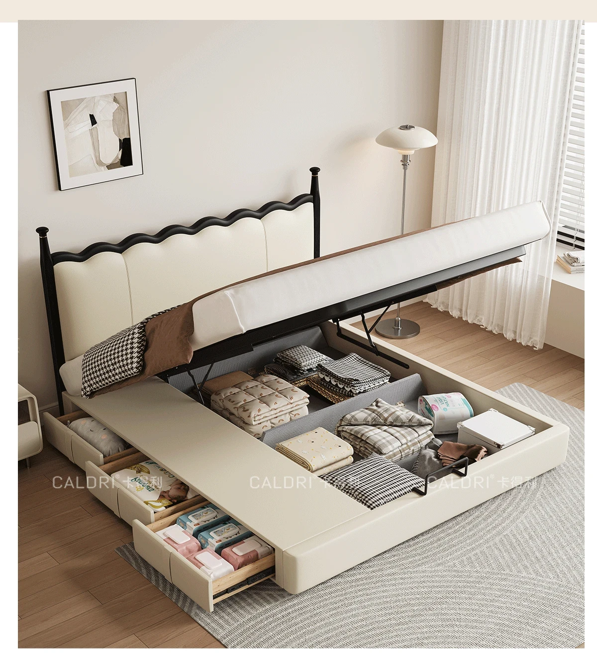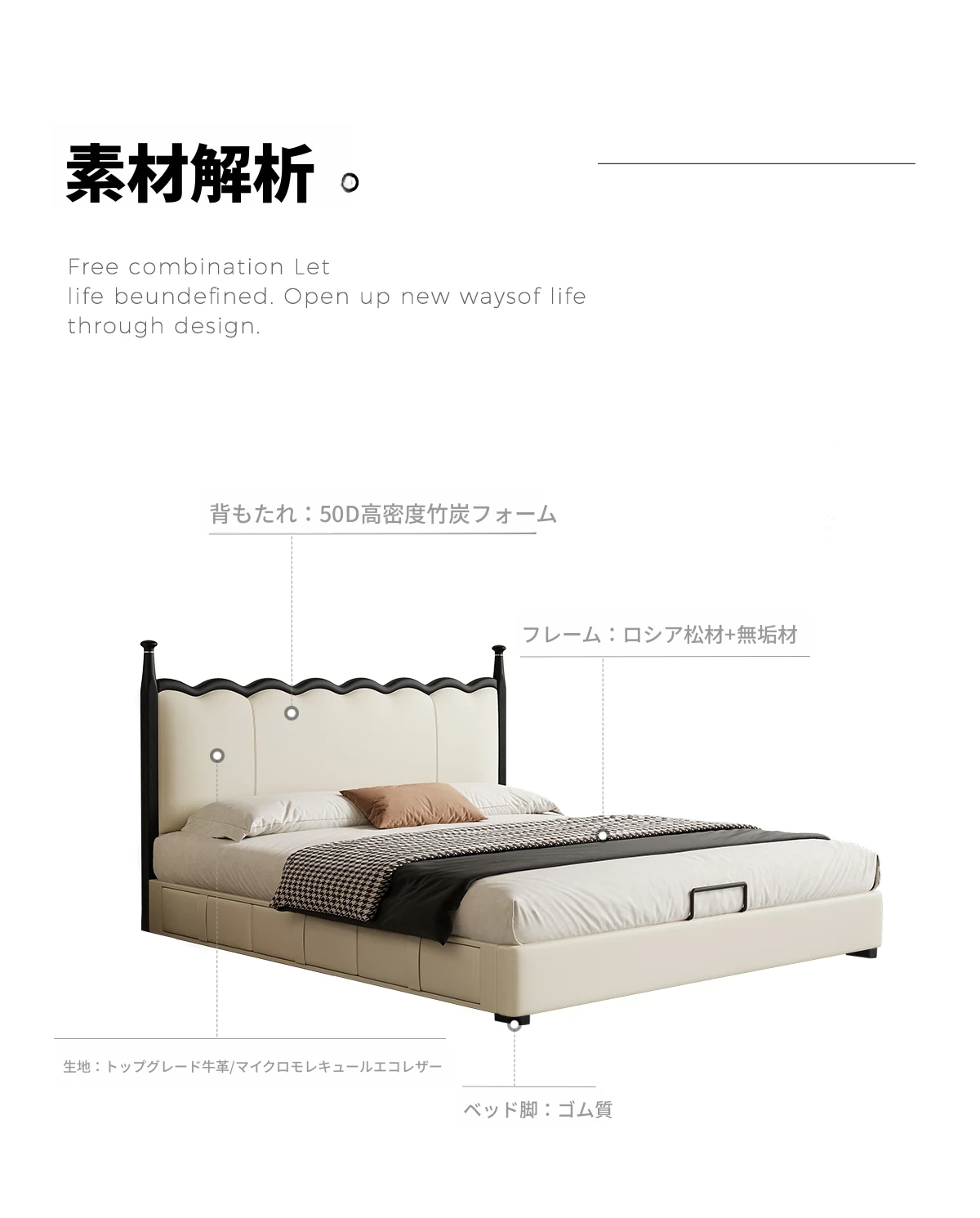 カデリ リップルベッド フランス風 本革 ヴィンテージ スリム ヘッドボード 小型住宅向け 一級牛革 ダブルサイズ 無垢材収納ベッド - スタイリッシュで機能的な空間を演出します!