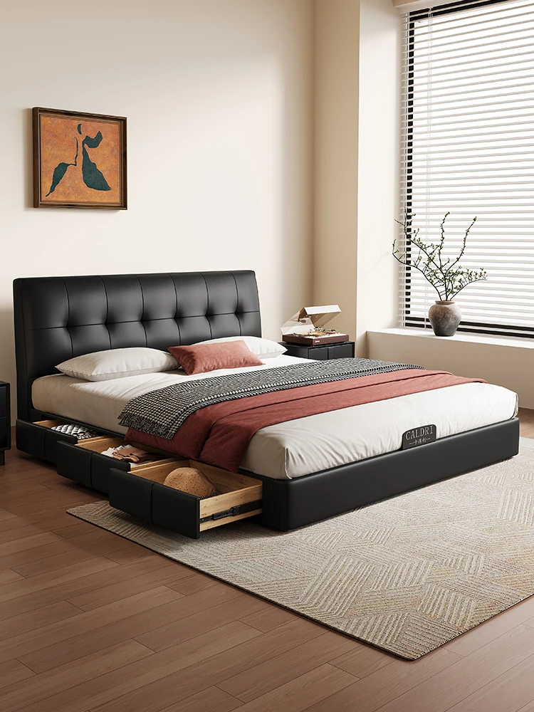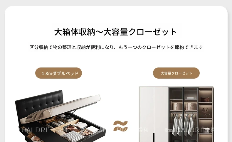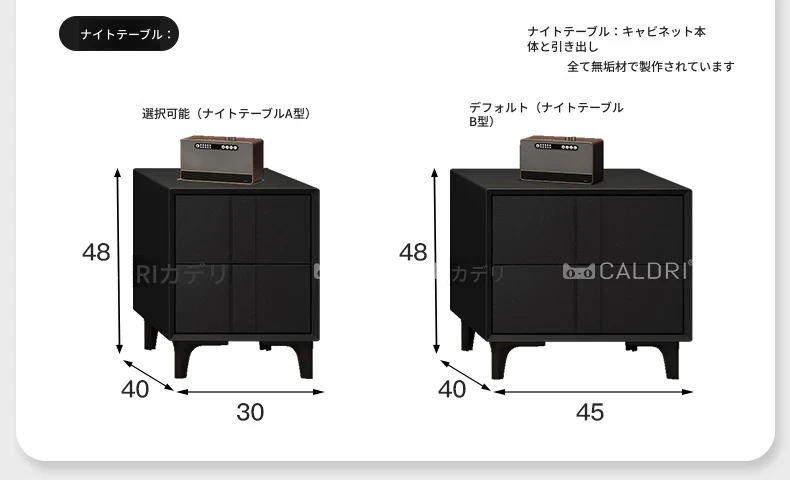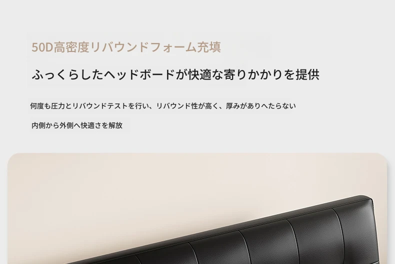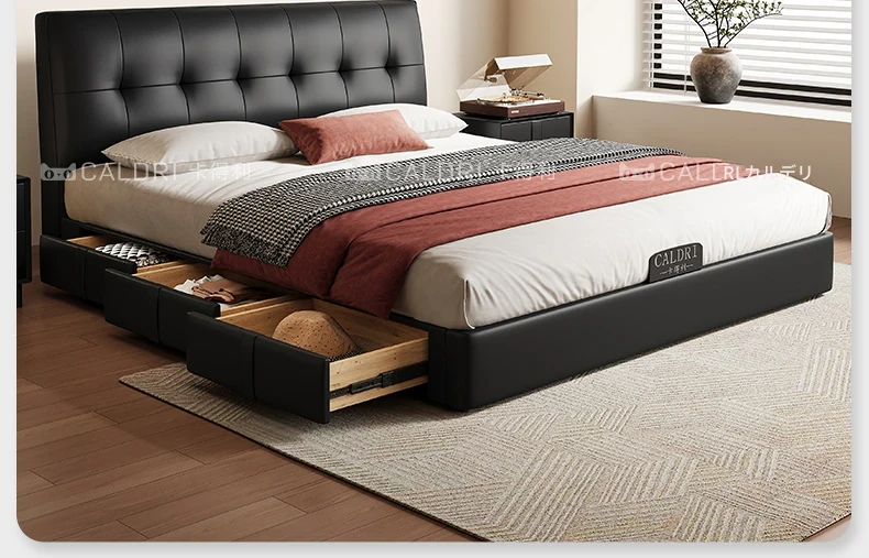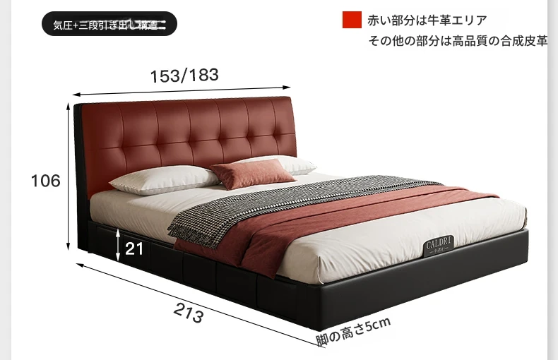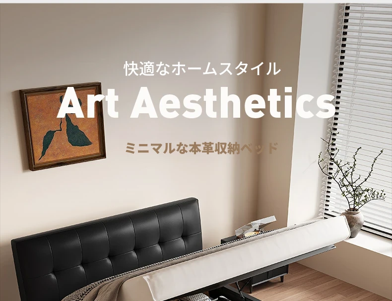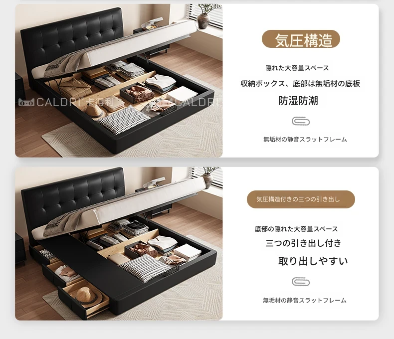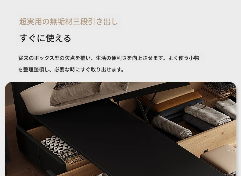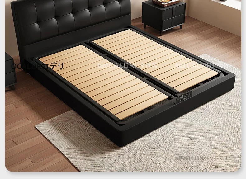 カデリ小型省スペース本革ベッド ブラック・スリムヘッドボード収納付きハイボックス イタリアンミニマリズムデザイン