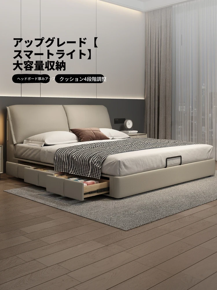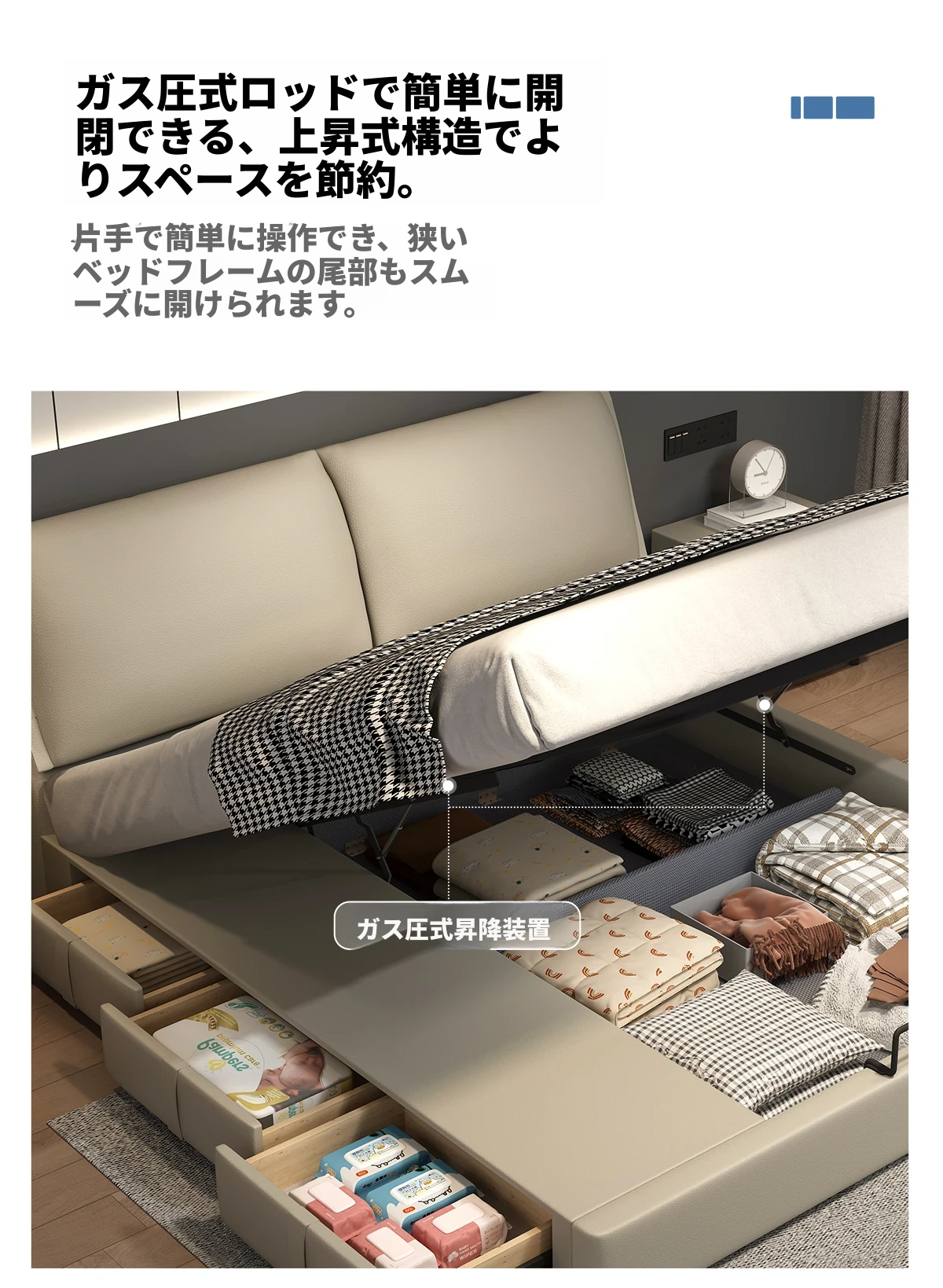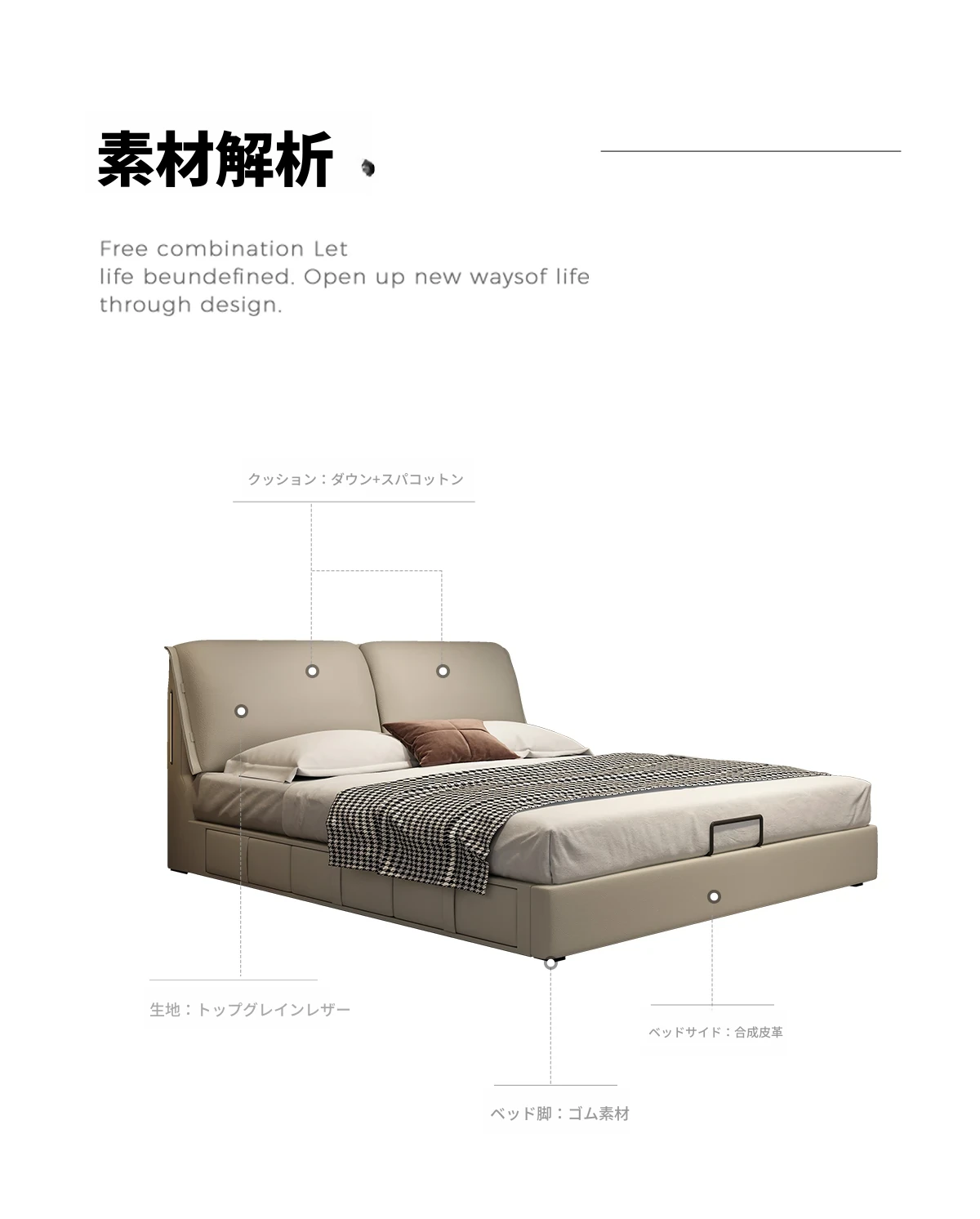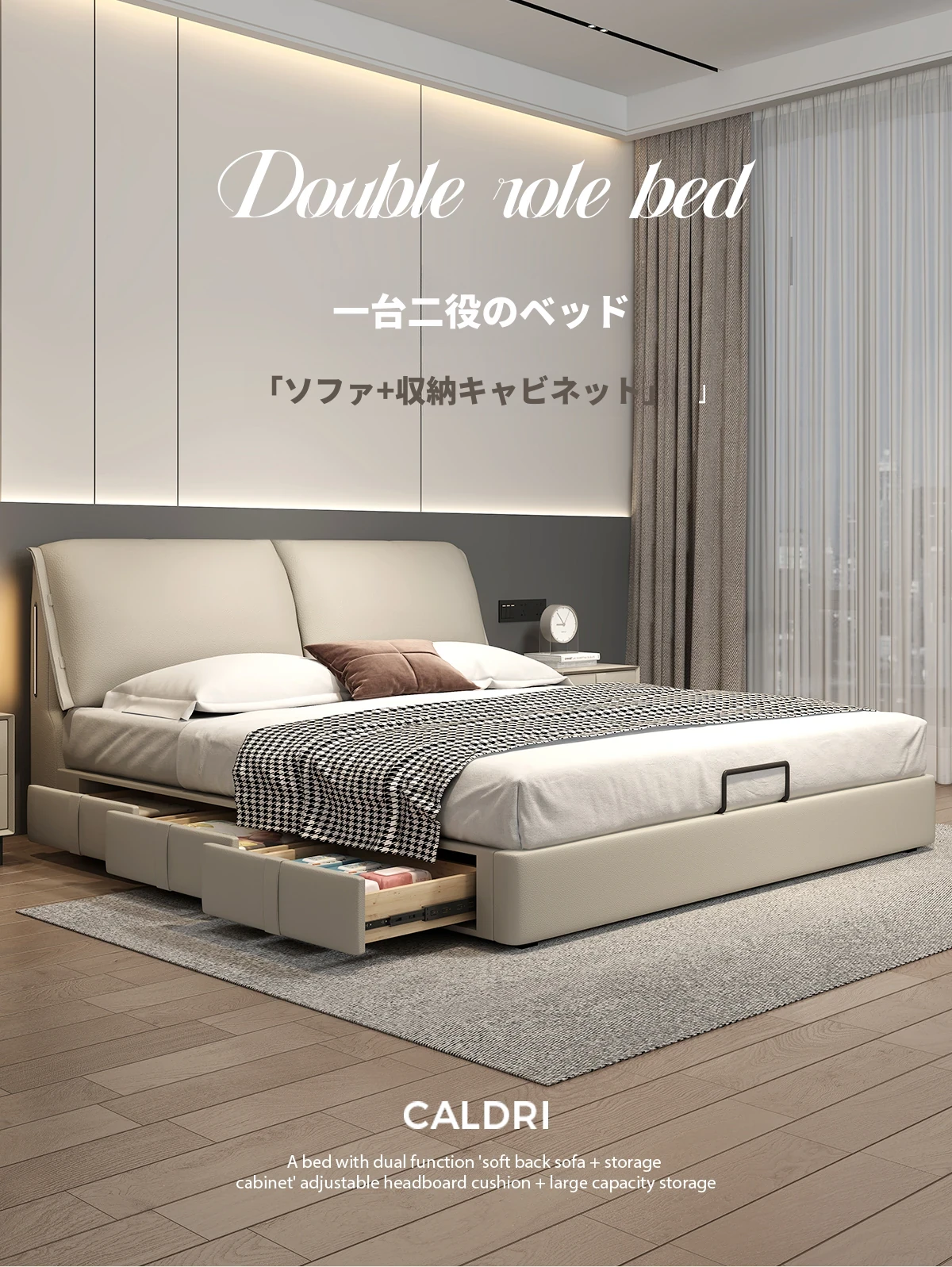 カデリのエレファントイヤーベッド - 高級感溢れる現代的なデザイン、収納機能付きのダブルサイズ。本革仕上げで、主寝室にぴったりのシンプルでスタイリッシュな選択肢です。
