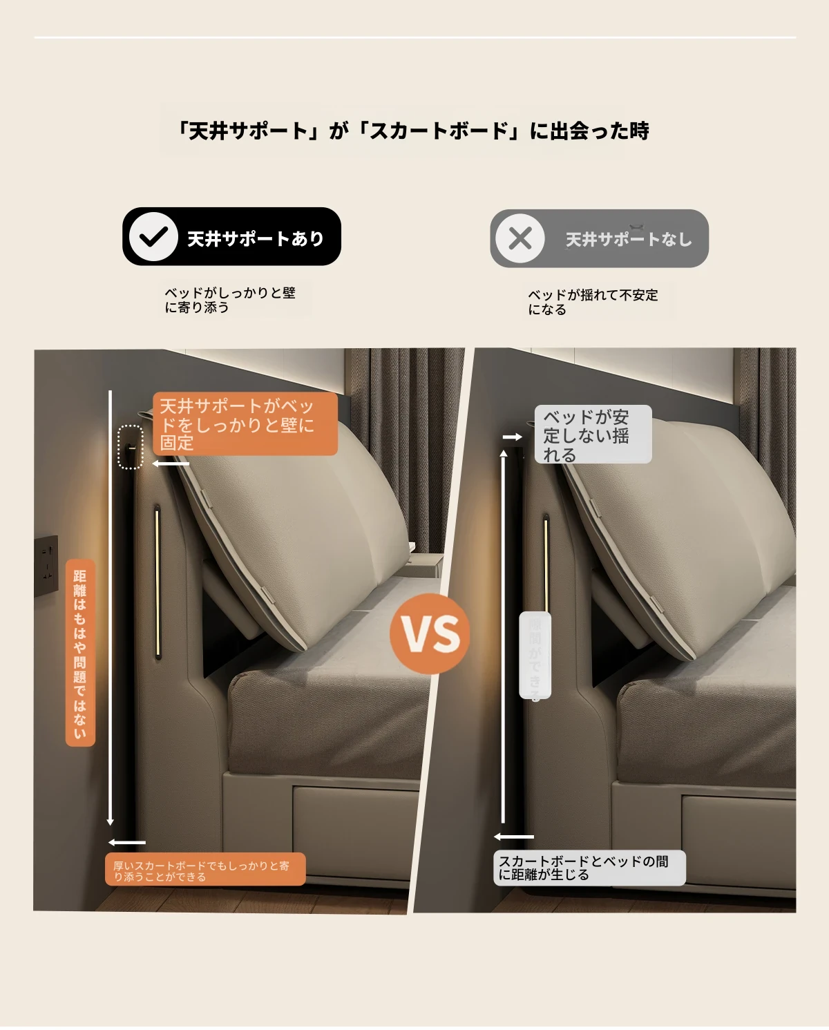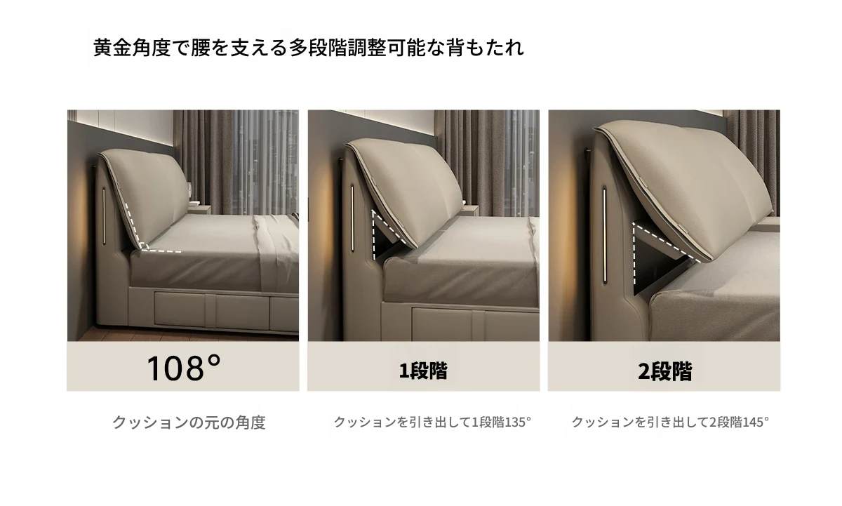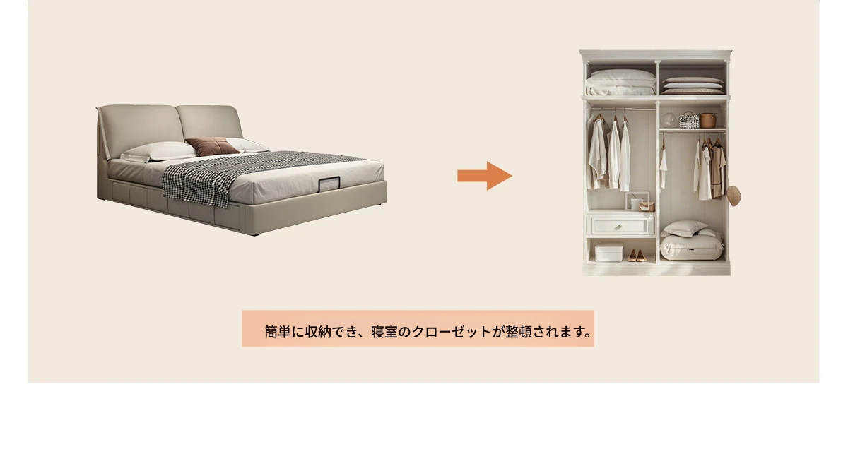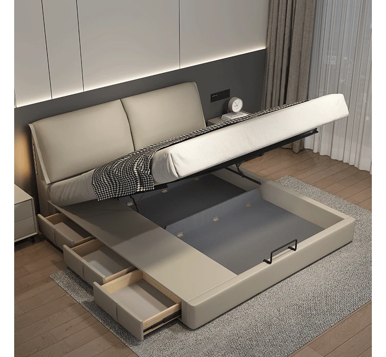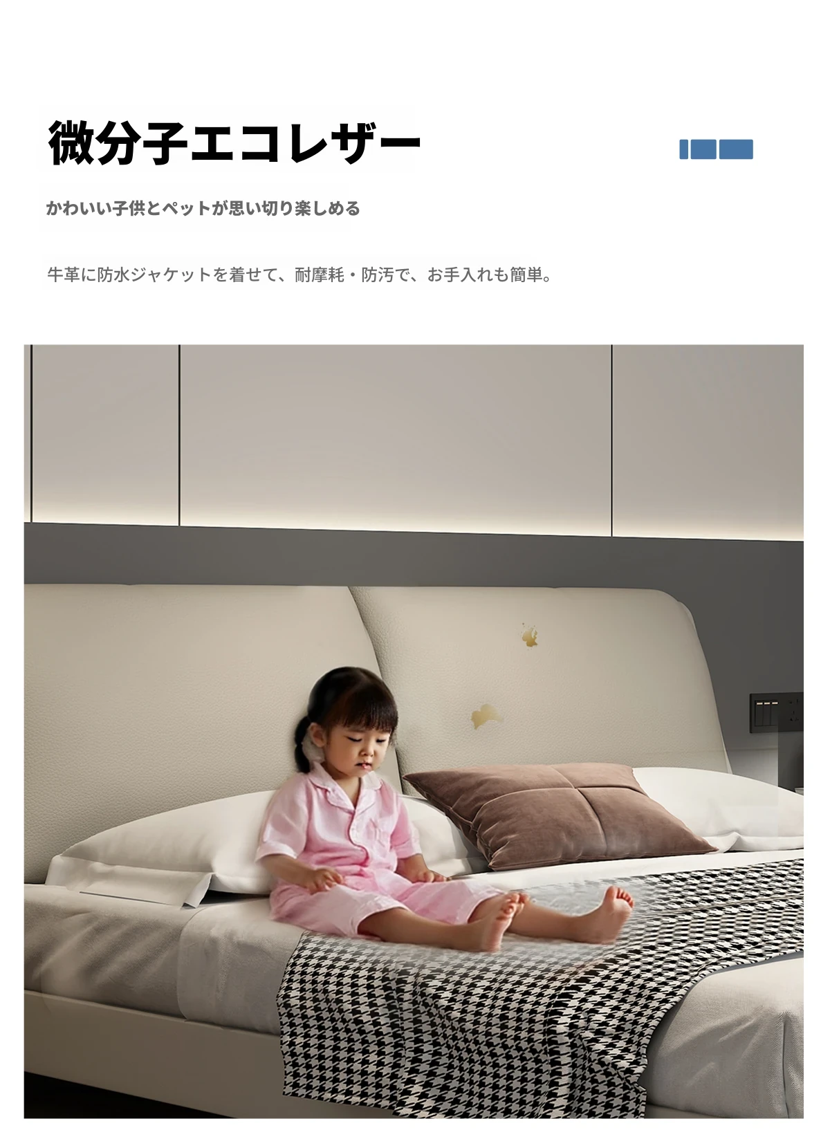 カデリのエレファントイヤーベッド - 高級感溢れる現代的なデザイン、収納機能付きのダブルサイズ。本革仕上げで、主寝室にぴったりのシンプルでスタイリッシュな選択肢です。