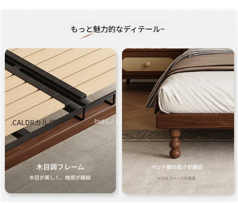 フラッグシップ版:リネン布製ベッド【強化ビーチ木製スラット】+ナイトテーブル*1
