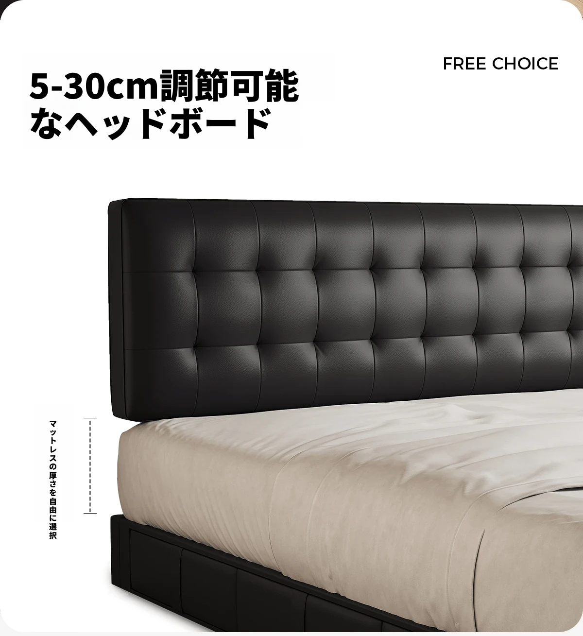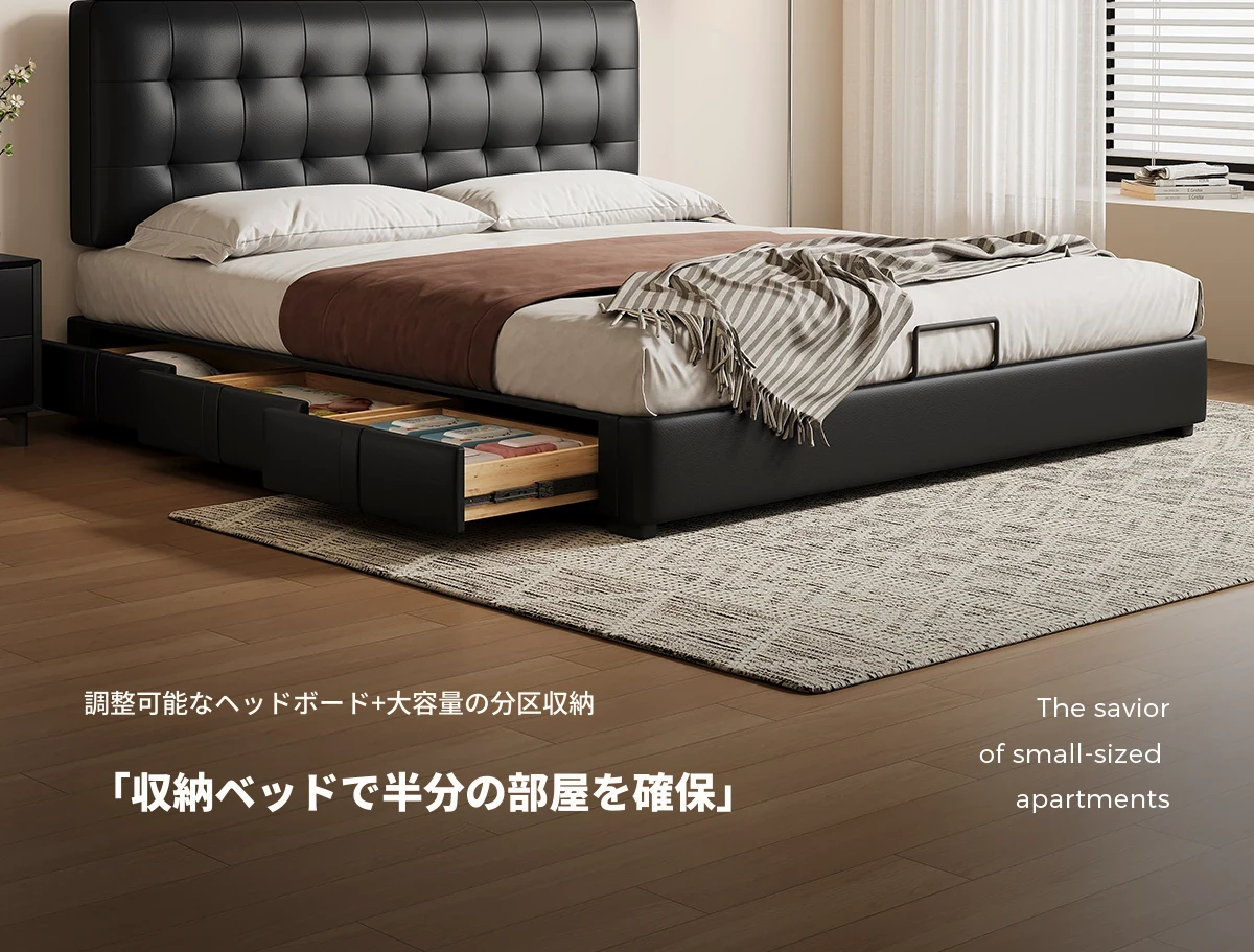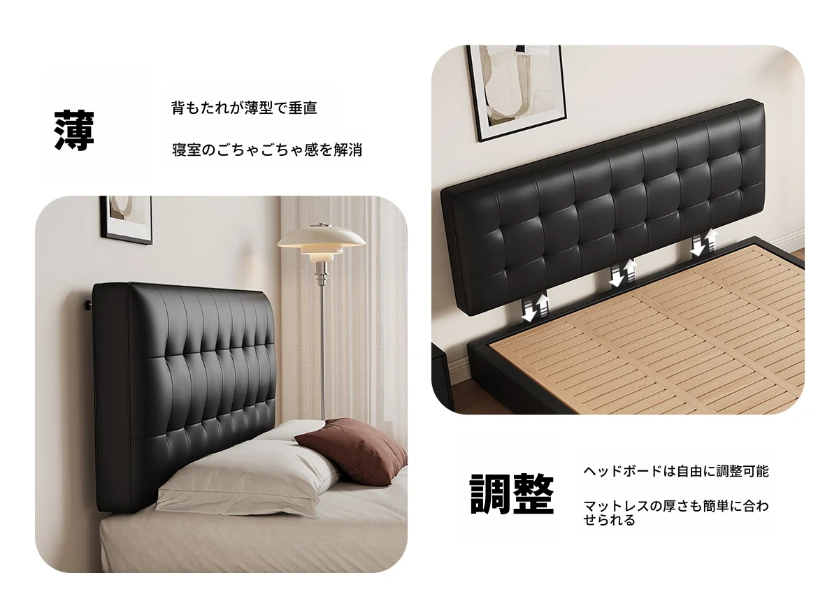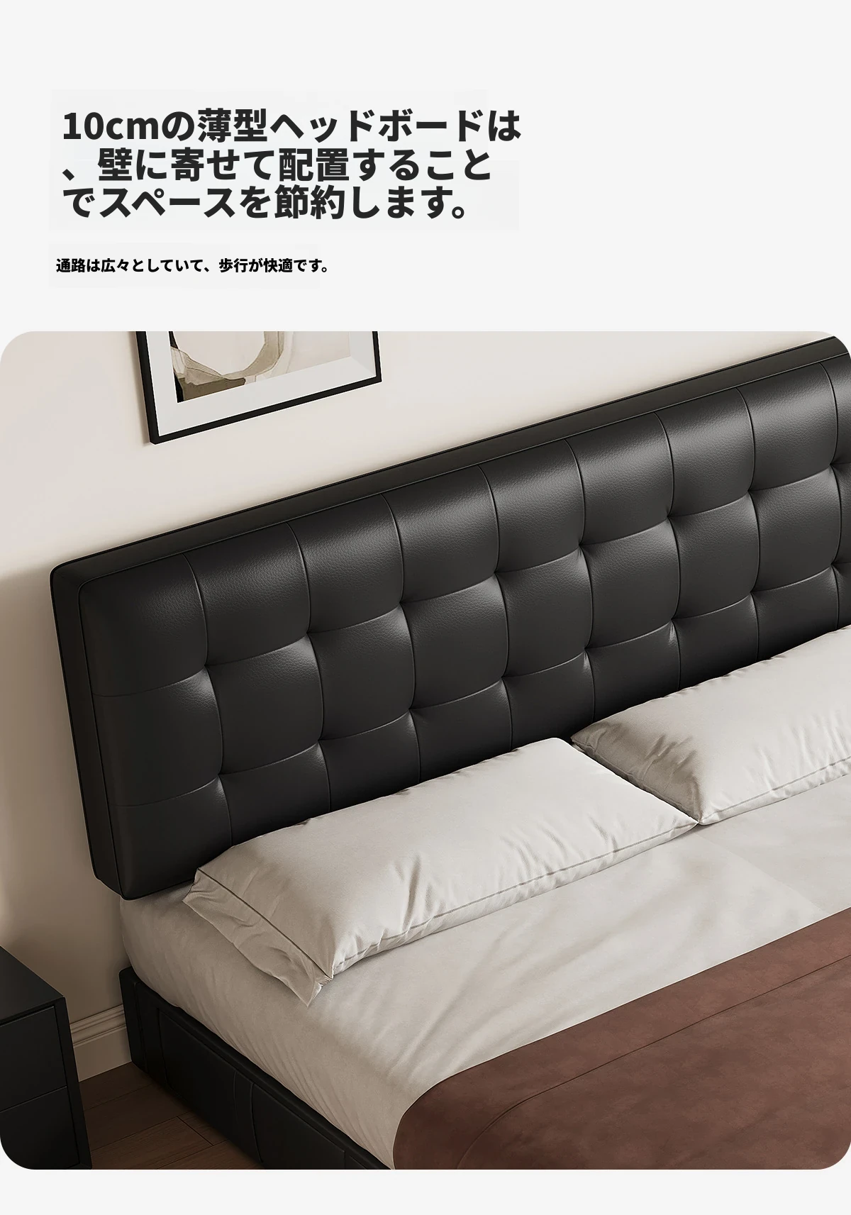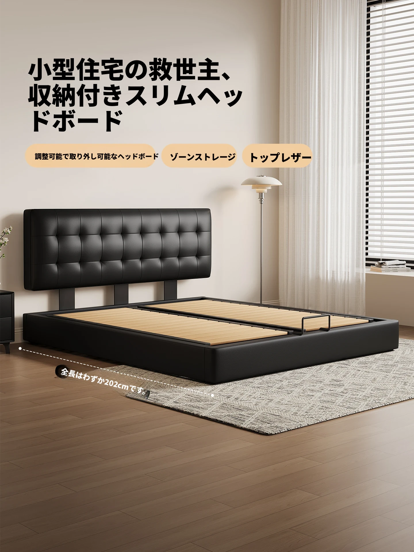 カデリ ワッフル本革主寝室ストレージベッド ブラック 小型調整可能な薄型ヘッドボード アンティークスタイル ダブルベッド - スペースを有効活用し、スタイリッシュな睡眠空間を実現!