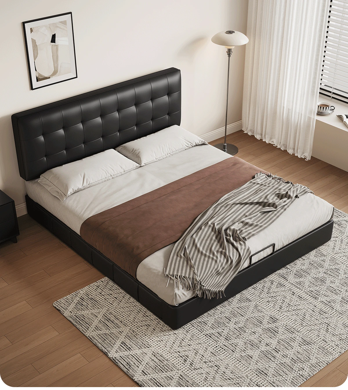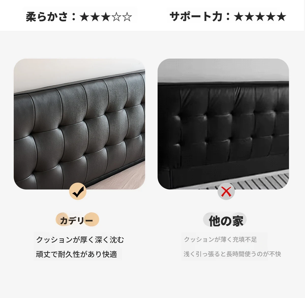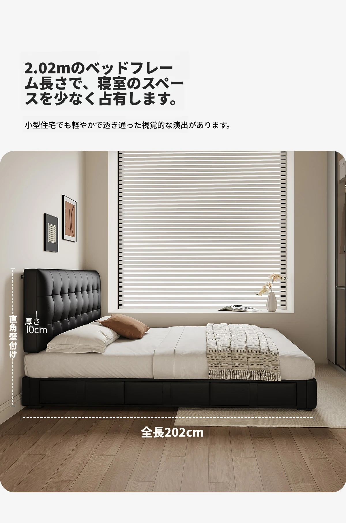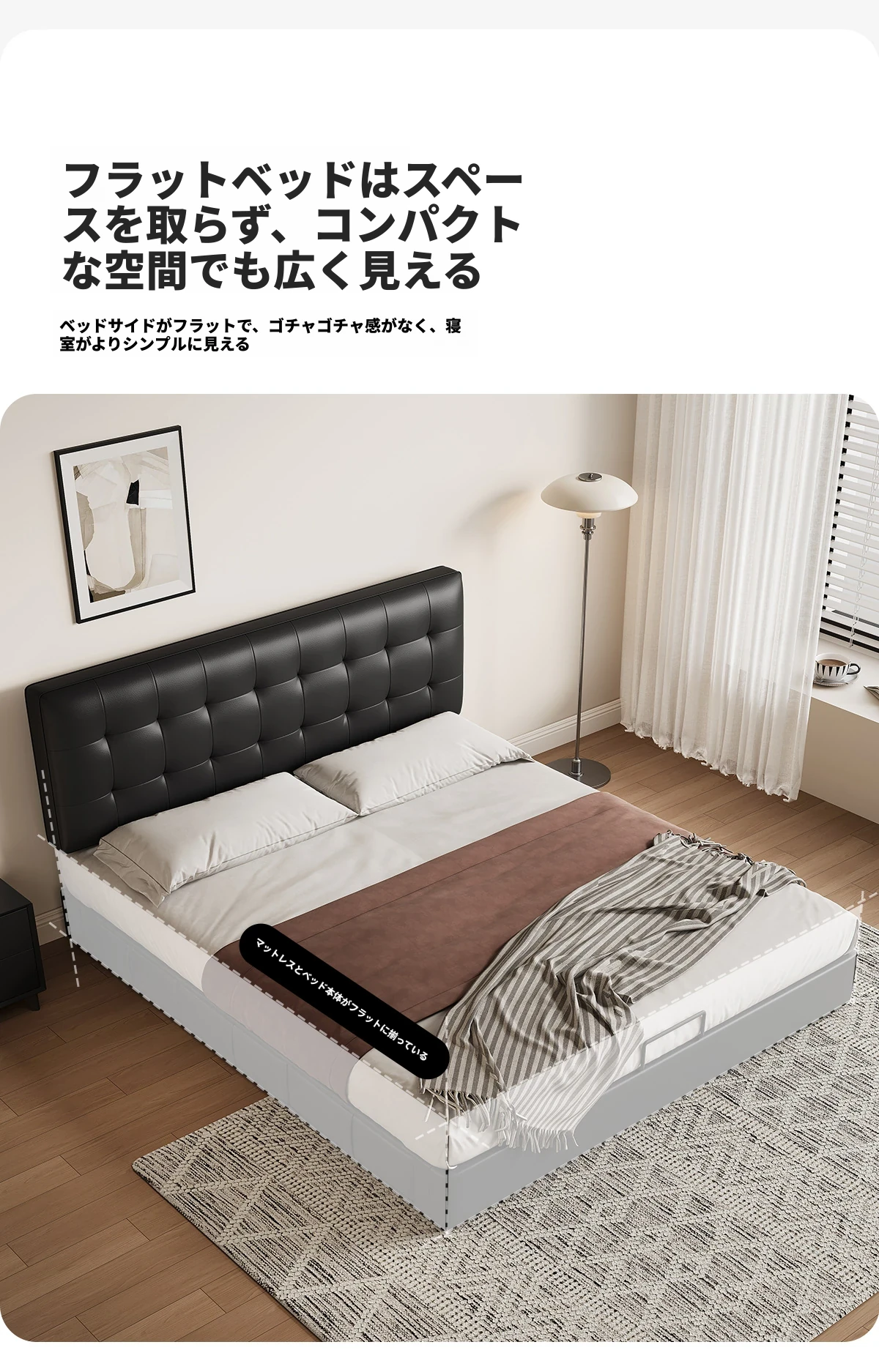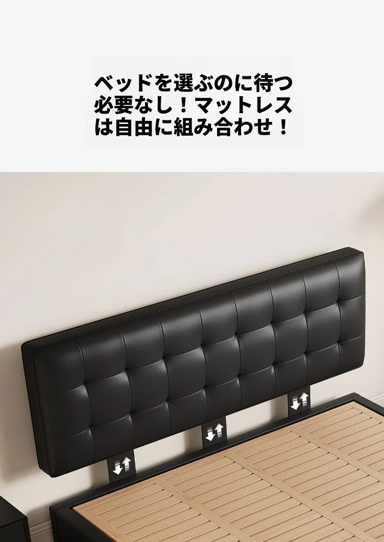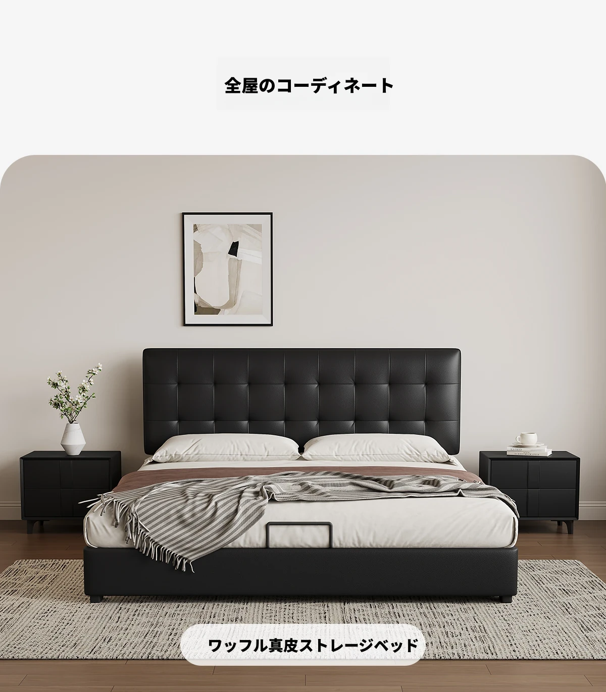 カデリ ワッフル本革主寝室ストレージベッド ブラック 小型調整可能な薄型ヘッドボード アンティークスタイル ダブルベッド - スペースを有効活用し、スタイリッシュな睡眠空間を実現!