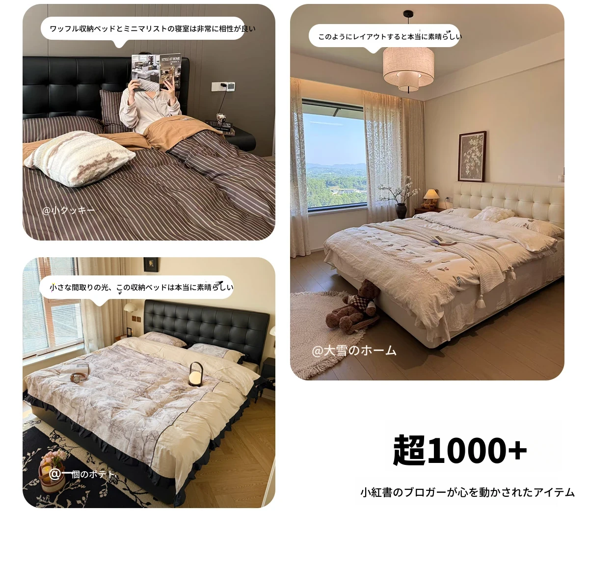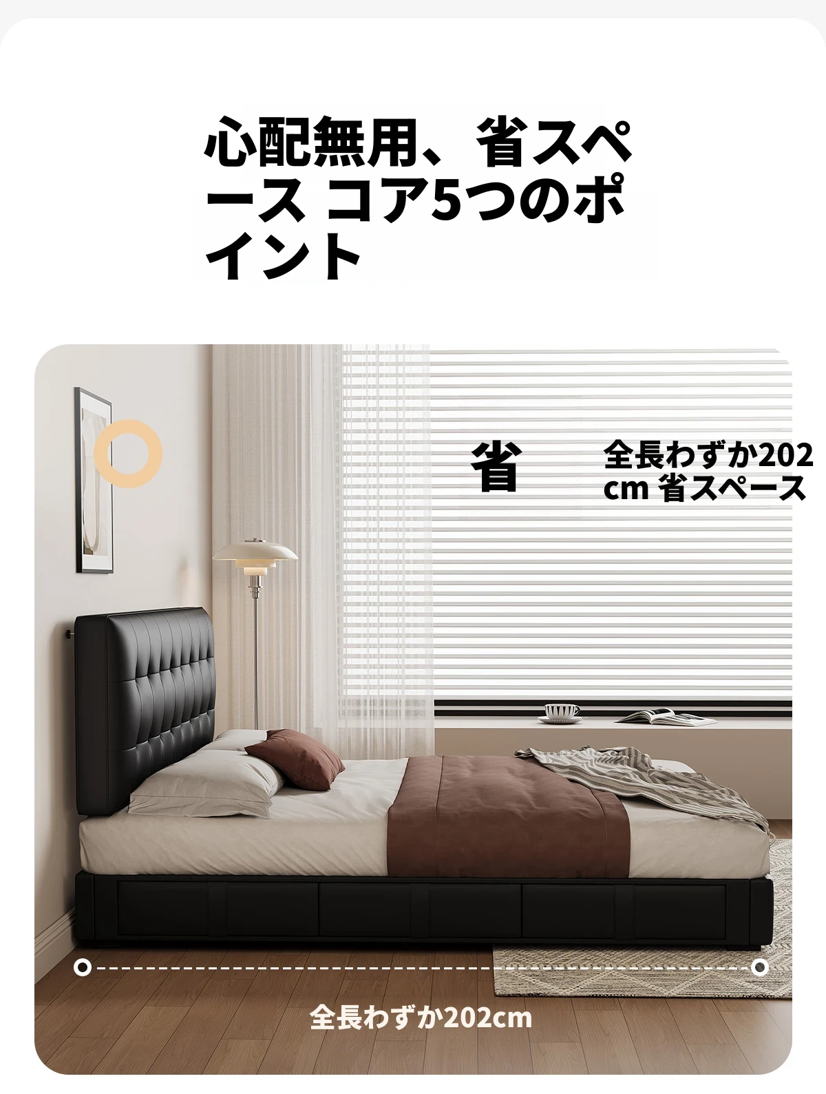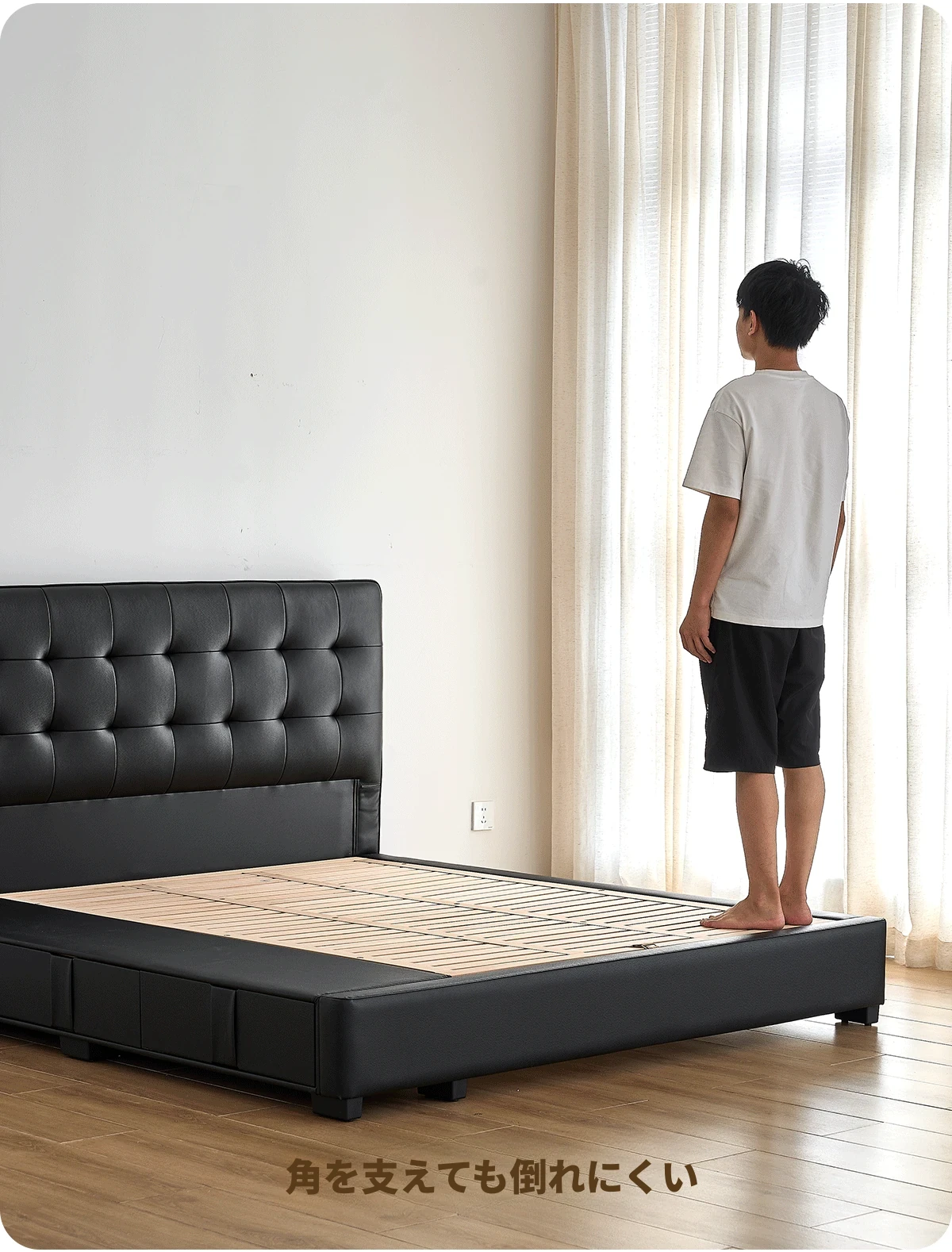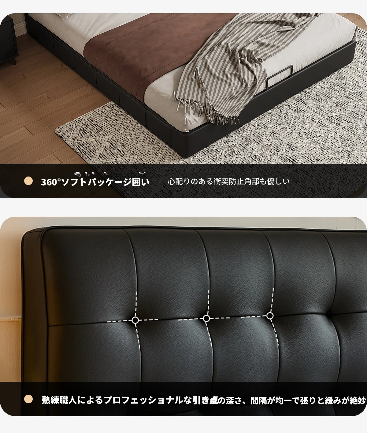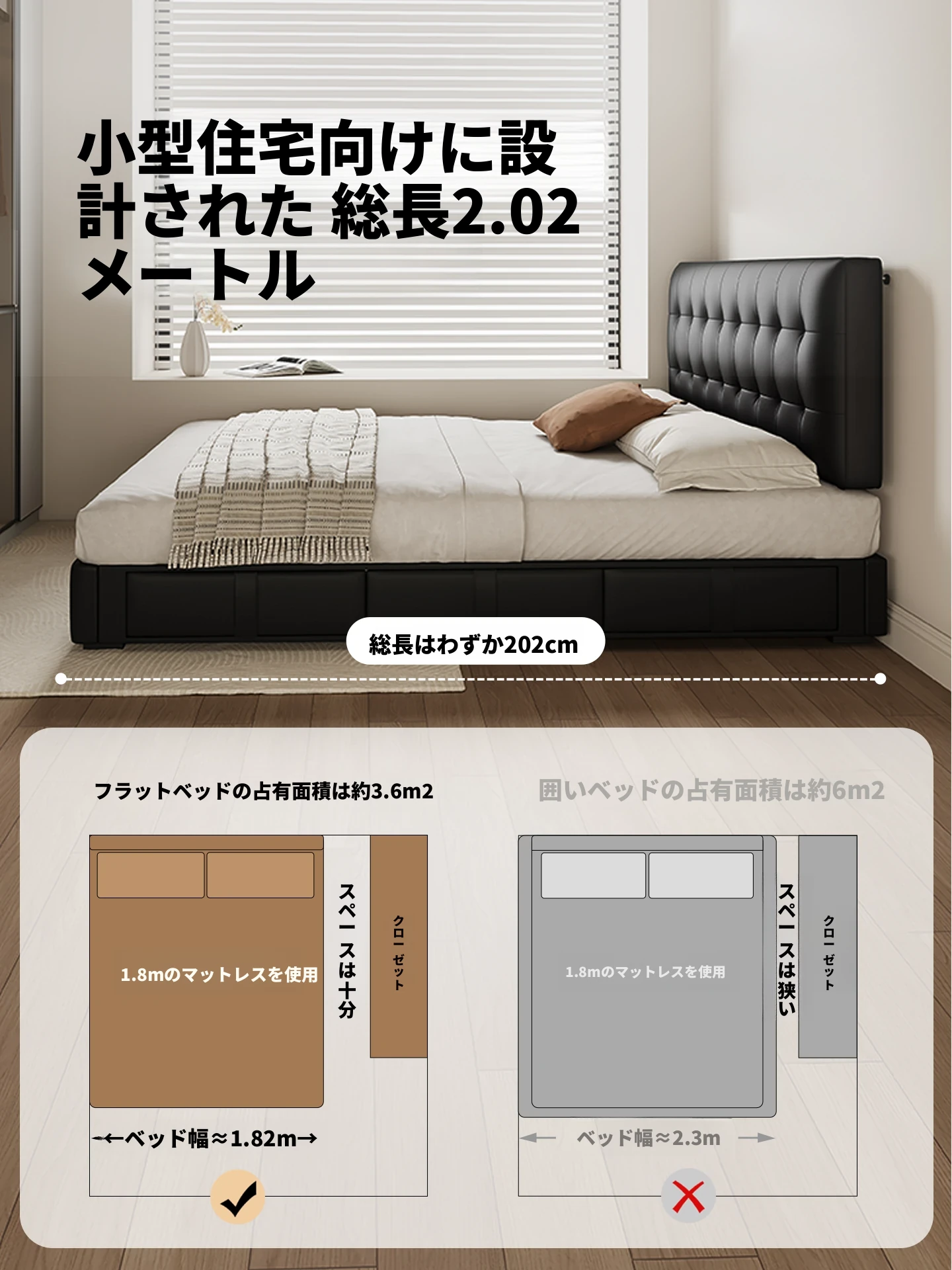 カデリ ワッフル本革主寝室ストレージベッド ブラック 小型調整可能な薄型ヘッドボード アンティークスタイル ダブルベッド - スペースを有効活用し、スタイリッシュな睡眠空間を実現!