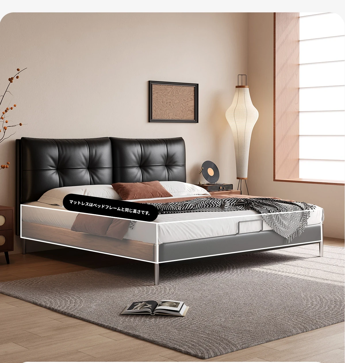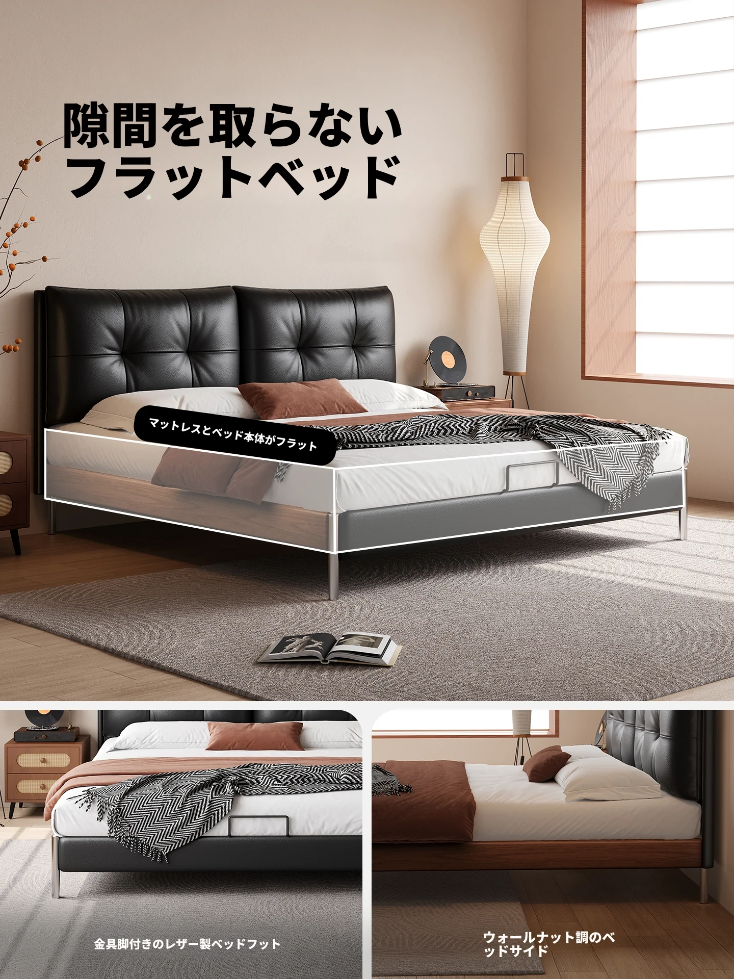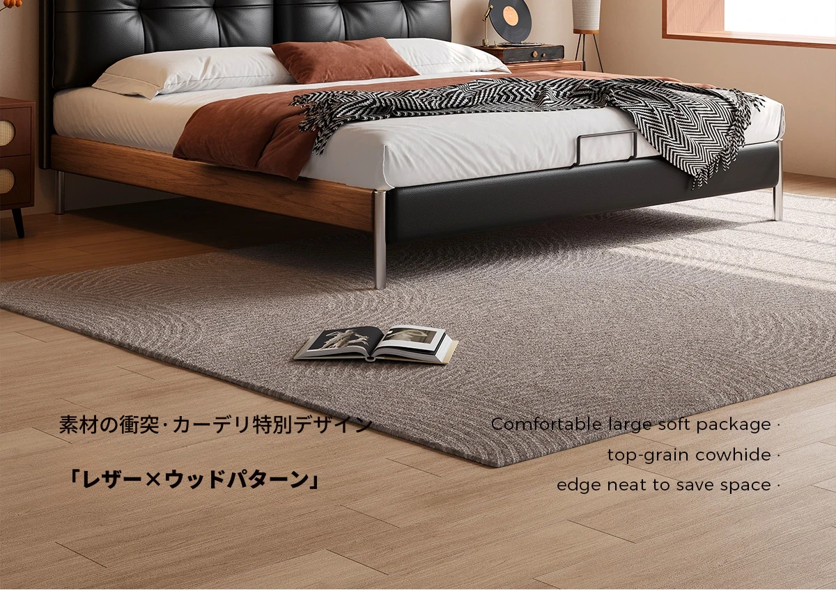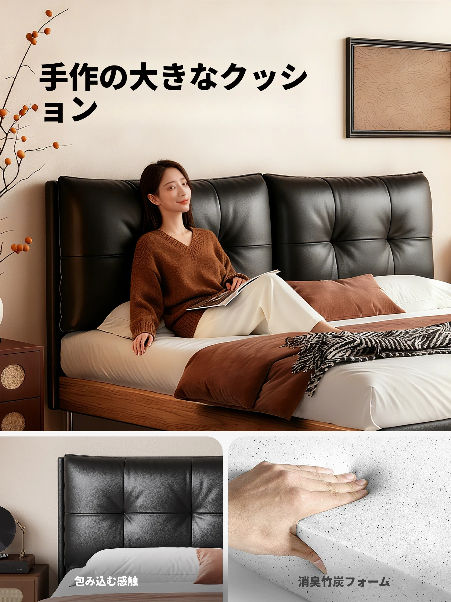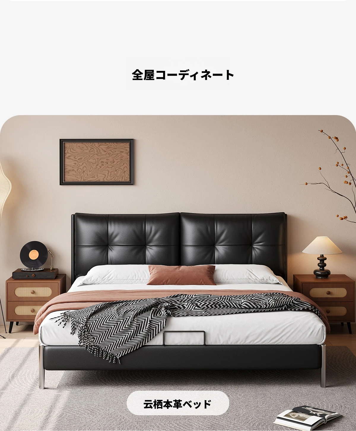カデリ本革ベッド - 高級感溢れるモダンヴィンテージデザイン、上質な牛革使用の主寝室向け。コンパクトな木製フレームで、小さなお部屋にもぴったり!