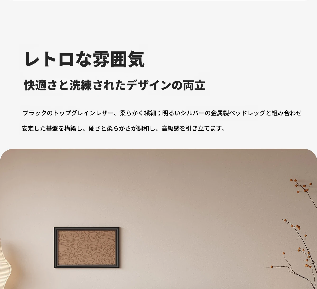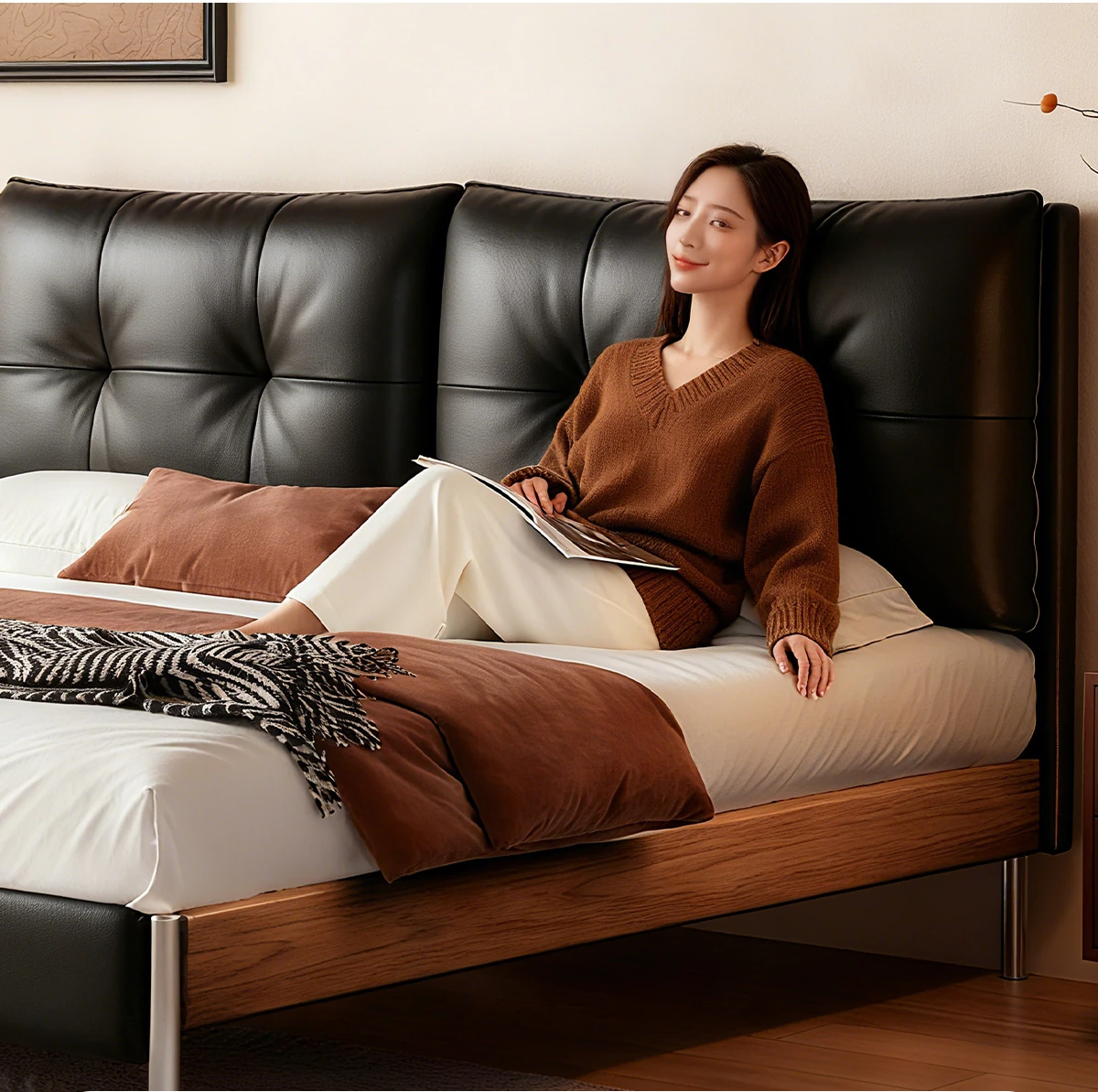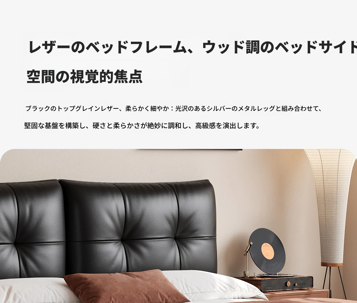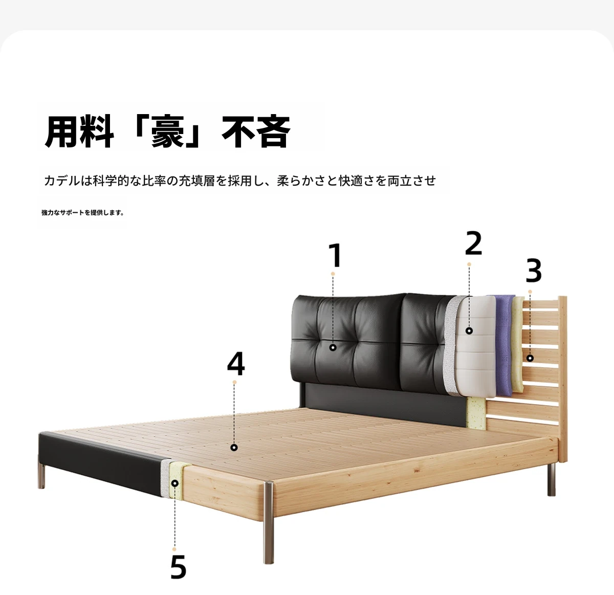 カデリ本革ベッド - 高級感溢れるモダンヴィンテージデザイン、上質な牛革使用の主寝室向け。コンパクトな木製フレームで、小さなお部屋にもぴったり!