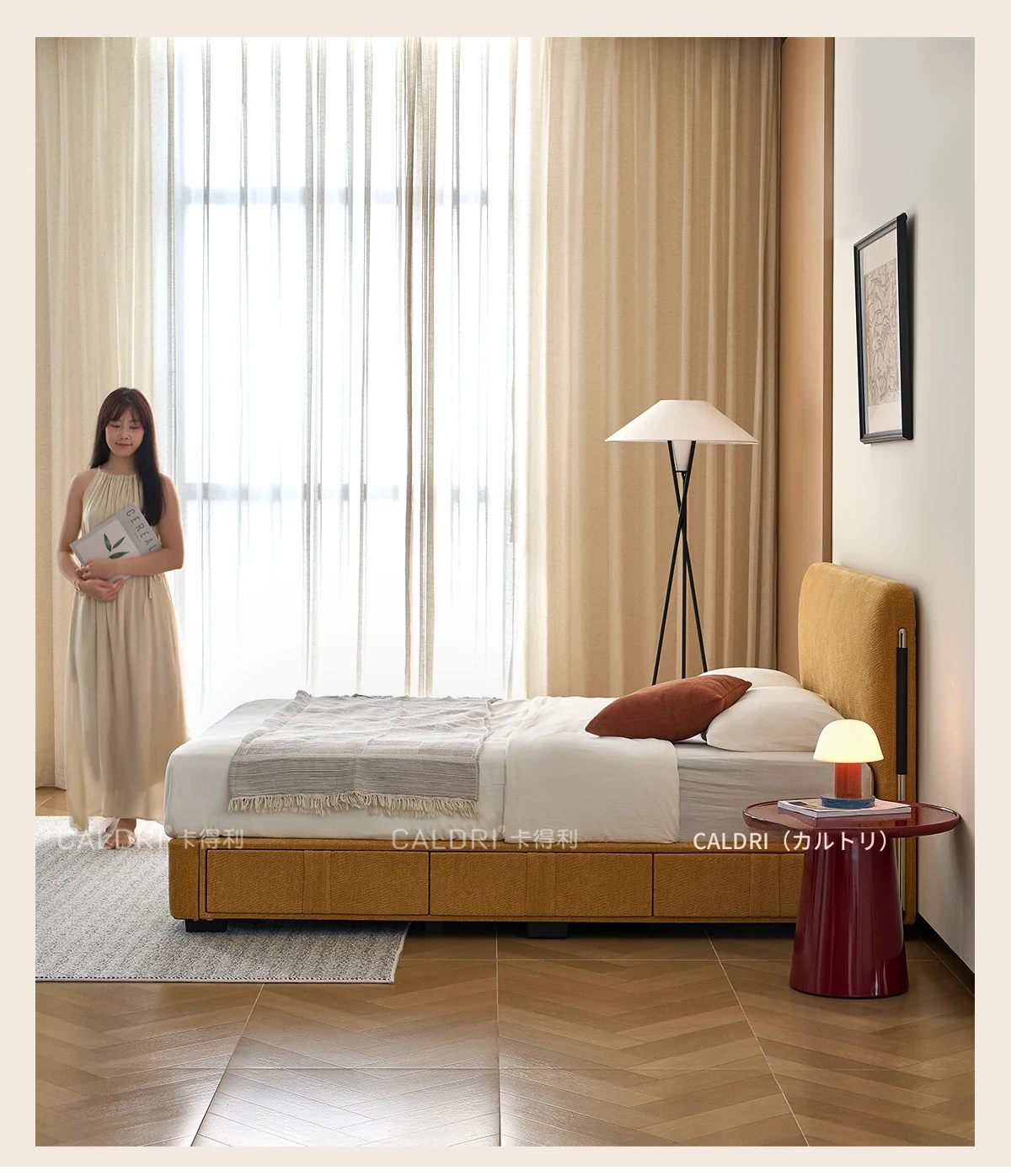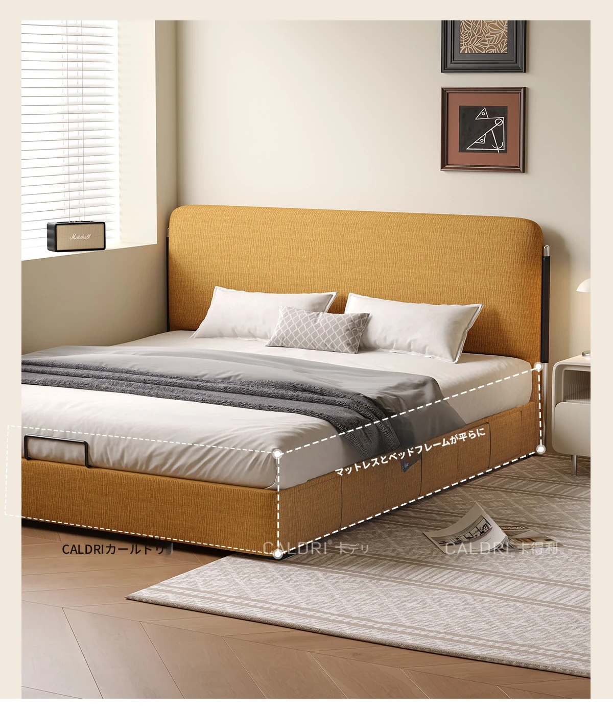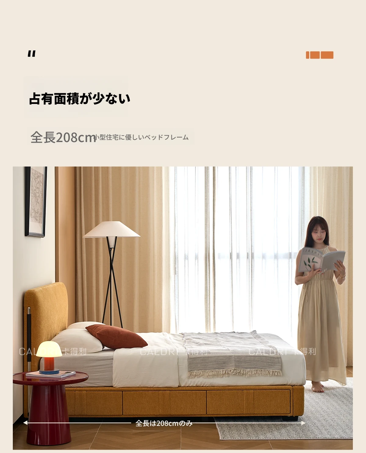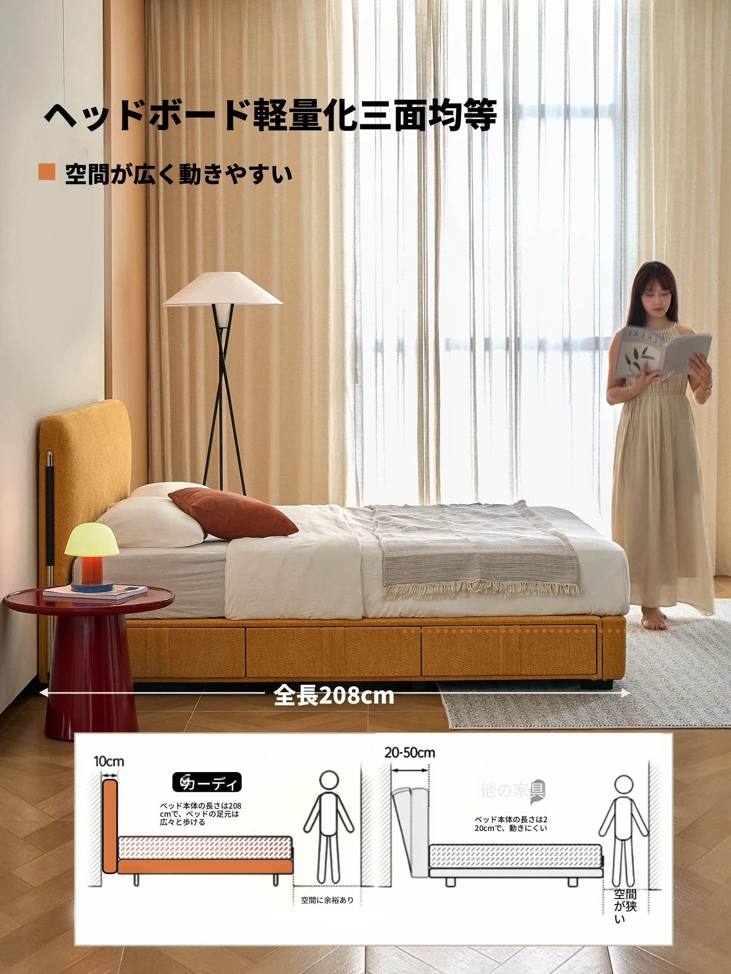 カデリ暖かいメープルのヴィンテージスタイル、超薄型ヘッドボード全木製ベッド。主寝室にぴったりのダブルサイズ、シェニールファブリック仕様!小型住宅にも最適です。